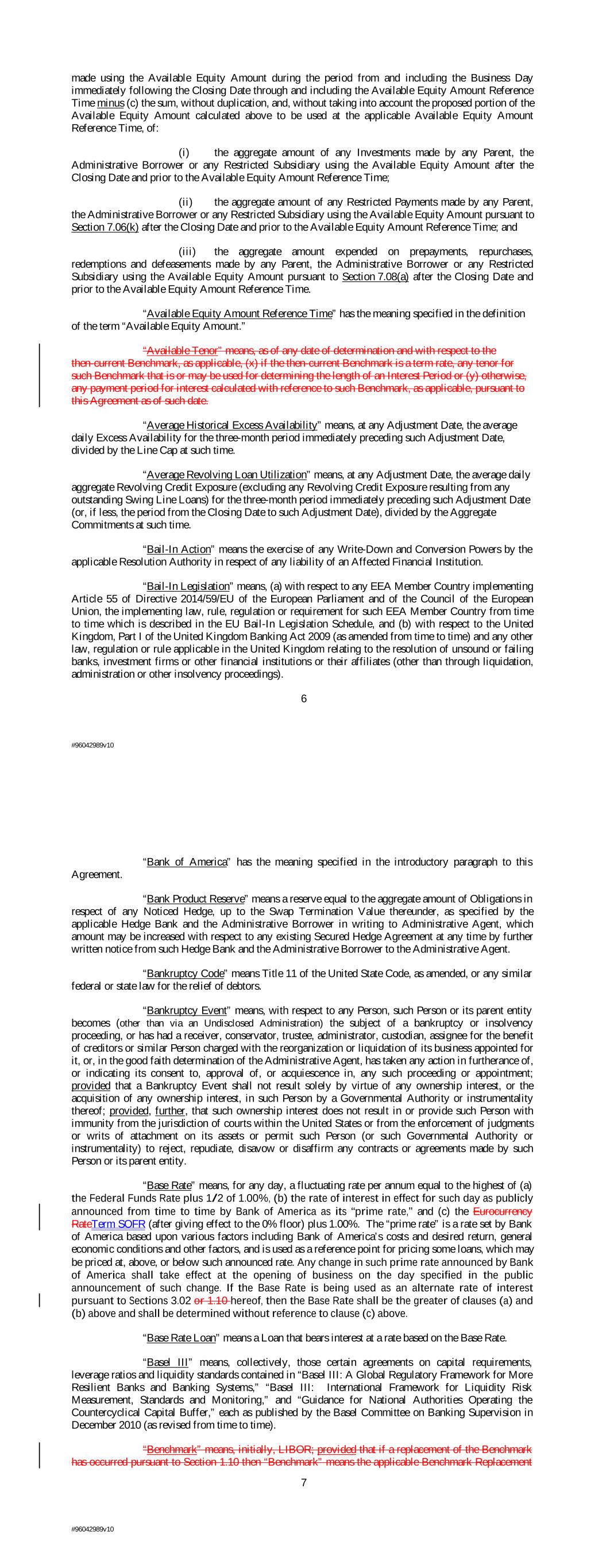 made using the Available Equity Amount during the period from and including the Business Day immediately following the Closing Date through and including the Available Equity Amount Reference Time minus (c) the sum, without duplication, and, without taking into account the proposed portion of the Available Equity Amount calculated above to be used at the applicable Available Equity Amount Reference Time, of: (i) the aggregate amount of any Investments made by any Parent, the Administrative Borrower or any Restricted Subsidiary using the Available Equity Amount after the Closing Date and prior to the Available Equity Amount Reference Time; (ii) the aggregate amount of any Restricted Payments made by any Parent, the Administrative Borrower or any Restricted Subsidiary using the Available Equity Amount pursuant to Section 7.06(k) after the Closing Date and prior to the Available Equity Amount Reference Time; and (iii) the aggregate amount expended on prepayments, repurchases, redemptions and defeasements made by any Parent, the Administrative Borrower or any Restricted Subsidiary using the Available Equity Amount pursuant to Section 7.08(a) after the Closing Date and prior to the Available Equity Amount Reference Time. “Available Equity Amount Reference Time” has the meaning specified in the definition of the term “Available Equity Amount.” “Available Tenor” means, as of any date of determination and with respect to the then-current Benchmark, as applicable, (x) if the then-current Benchmark is a term rate, any tenor for such Benchmark that is or may be used for determining the length of an Interest Period or (y) otherwise, any payment period for interest calculated with reference to such Benchmark, as applicable, pursuant to this Agreement as of such date. “Average Historical Excess Availability” means, at any Adjustment Date, the average daily Excess Availability for the three-month period immediately preceding such Adjustment Date, divided by the Line Cap at such time. “Average Revolving Loan Utilization” means, at any Adjustment Date, the average daily aggregate Revolving Credit Exposure (excluding any Revolving Credit Exposure resulting from any outstanding Swing Line Loans) for the three-month period immediately preceding such Adjustment Date (or, if less, the period from the Closing Date to such Adjustment Date), divided by the Aggregate Commitments at such time. “Bail-In Action” means the exercise of any Write-Down and Conversion Powers by the applicable Resolution Authority in respect of any liability of an Affected Financial Institution. “Bail-In Legislation” means, (a) with respect to any EEA Member Country implementing Article 55 of Directive 2014/59/EU of the European Parliament and of the Council of the European Union, the implementing law, rule, regulation or requirement for such EEA Member Country from time to time which is described in the EU Bail-In Legislation Schedule, and (b) with respect to the United Kingdom, Part I of the United Kingdom Banking Act 2009 (as amended from time to time) and any other law, regulation or rule applicable in the United Kingdom relating to the resolution of unsound or failing banks, investment firms or other financial institutions or their affiliates (other than through liquidation, administration or other insolvency proceedings). 6 #96042989v10 “Bank of America” has the meaning specified in the introductory paragraph to this Agreement. “Bank Product Reserve” means a reserve equal to the aggregate amount of Obligations in respect of any Noticed Hedge, up to the Swap Termination Value thereunder, as specified by the applicable Hedge Bank and the Administrative Borrower in writing to Administrative Agent, which amount may be increased with respect to any existing Secured Hedge Agreement at any time by further written notice from such Hedge Bank and the Administrative Borrower to the Administrative Agent. “Bankruptcy Code” means Title 11 of the United State Code, as amended, or any similar federal or state law for the relief of debtors. “Bankruptcy Event” means, with respect to any Person, such Person or its parent entity becomes (other than via an Undisclosed Administration) the subject of a bankruptcy or insolvency proceeding, or has had a receiver, conservator, trustee, administrator, custodian, assignee for the benefit of creditors or similar Person charged with the reorganization or liquidation of its business appointed for it, or, in the good faith determination of the Administrative Agent, has taken any action in furtherance of, or indicating its consent to, approval of, or acquiescence in, any such proceeding or appointment; provided that a Bankruptcy Event shall not result solely by virtue of any ownership interest, or the acquisition of any ownership interest, in such Person by a Governmental Authority or instrumentality thereof; provided, further, that such ownership interest does not result in or provide such Person with immunity from the jurisdiction of courts within the United States or from the enforcement of judgments or writs of attachment on its assets or permit such Person (or such Governmental Authority or instrumentality) to reject, repudiate, disavow or disaffirm any contracts or agreements made by such Person or its parent entity. “Base Rate” means, for any day, a fluctuating rate per annum equal to the highest of (a) the Federal Funds Rate plus 1/2 of 1.00%, (b) the rate of interest in effect for such day as publicly announced from time to time by Bank of America as its “prime rate,” and (c) the Eurocurrency RateTerm SOFR (after giving effect to the 0% floor) plus 1.00%. The “prime rate” is a rate set by Bank of America based upon various factors including Bank of America’s costs and desired return, general economic conditions and other factors, and is used as a reference point for pricing some loans, which may be priced at, above, or below such announced rate. An