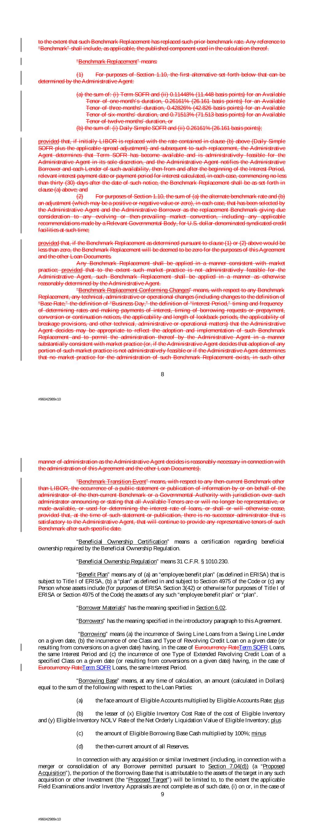 to the extent that such Benchmark Replacement has replaced such prior benchmark rate. Any reference to “Benchmark” shall include, as applicable, the published component used in the calculation thereof. “Benchmark Replacement” means: (1) For purposes of Section 1.10, the first alternative set forth below that can be determined by the Administrative Agent: (a) the sum of: (i) Term SOFR and (ii) 0.11448% (11.448 basis points) for an Available Tenor of one-month’s duration, 0.26161% (26.161 basis points) for an Available Tenor of three-months’ duration, 0.42826% (42.826 basis points) for an Available Tenor of six-months’ duration, and 0.71513% (71.513 basis points) for an Available Tenor of twelve-months’ duration, or (b) the sum of: (i) Daily Simple SOFR and (ii) 0.26161% (26.161 basis points); provided that, if initially LIBOR is replaced with the rate contained in clause (b) above (Daily Simple SOFR plus the applicable spread adjustment) and subsequent to such replacement, the Administrative Agent determines that Term SOFR has become available and is administratively feasible for the Administrative Agent in its sole discretion, and the Administrative Agent notifies the Administrative Borrower and each Lender of such availability, then from and after the beginning of the Interest Period, relevant interest payment date or payment period for interest calculated, in each case, commencing no less than thirty (30) days after the date of such notice, the Benchmark Replacement shall be as set forth in clause (a) above; and (2) For purposes of Section 1.10, the sum of (a) the alternate benchmark rate and (b) an adjustment (which may be a positive or negative value or zero), in each case, that has been selected by the Administrative Agent and the Administrative Borrower as the replacement Benchmark giving due consideration to any evolving or then-prevailing market convention, including any applicable recommendations made by a Relevant Governmental Body, for U.S. dollar-denominated syndicated credit facilities at such time; provided that, if the Benchmark Replacement as determined pursuant to clause (1) or (2) above would be less than zero, the Benchmark Replacement will be deemed to be zero for the purposes of this Agreement and the other Loan Documents. Any Benchmark Replacement shall be applied in a manner consistent with market practice; provided that to the extent such market practice is not administratively feasible for the Administrative Agent, such Benchmark Replacement shall be applied in a manner as otherwise reasonably determined by the Administrative Agent. “Benchmark Replacement Conforming Changes” means, with respect to any Benchmark Replacement, any technical, administrative or operational changes (including changes to the definition of “Base Rate,” the definition of “Business Day,” the definition of “Interest Period,” timing and frequency of determining rates and making payments of interest, timing of borrowing requests or prepayment, conversion or continuation notices, the applicability and length of lookback periods, the applicability of breakage provisions, and other technical, administrative or operational matters) that the Administrative Agent decides may be appropriate to reflect the adoption and implementation of such Benchmark Replacement and to permit the administration thereof by the Administrative Agent in a manner substantially consistent with market practice (or, if the Administrative Agent decides that adoption of any portion of such market practice is not administratively feasible or if the Administrative Agent determines that no market practice for the administration of such Benchmark Replacement exists, in such other 8 #96042989v10 manner of administration as the Administrative Agent decides is reasonably necessary in connection with the administration of this Agreement and the other Loan Documents). “Benchmark Transition Event” means, with respect to any then-current Benchmark other than LIBOR, the occurrence of a public statement or publication of information by or on behalf of the administrator of the then-current Benchmark or a Governmental Authority with jurisdiction over such administrator announcing or stating that all Available Tenors are or will no longer be representative, or made available, or used for determining the interest rate of loans, or shall or will otherwise cease, provided that, at the time of such statement or publication, there is no successor administrator that is satisfactory to the Administrative Agent, that will continue to provide any representative tenors of such Benchmark after such specific date. “Beneficial Ownership Certification” means a certification regarding beneficial ownership required by the Beneficial Ownership Regulation. “Beneficial Ownership Regulation” means 31 C.F.R. § 1010.230. “Benefit Plan” means any of (a) an “employee benefit plan” (as defined in ERISA) that is subject to Title I of ERISA, (b) a “plan” as defined in and subject to Section 4975 of the Code or (c) any Person whose assets include (for purposes of ERISA Section 3(42) or otherwise for purposes of Title I of ERISA or Section 4975 of the Code) the assets of any such “employee benefit plan” or “plan”. “Borrower Materials” has the meaning specified in Section 6.02. “Borrowers” has the meaning specified in the introductory paragraph to this Agreement. “Borrowing” means (a) the incurrence of Swing Line Loans from a Swing Line Lender on a given date, (b) the incurrence of one Class and Type of Revolving Credit Loan on a given date (or resulting from conversions on a given date) having, in the case of Eurocurrency RateTerm SOFR Loans, the same Interest Period and (c) the incurrence of one Type of Extended Revolving Credit Loan of a specified Class on a given date (or resulting from conversions on a given date) having, in the case of Eurocurrency RateTerm SOFR Loans, the same Interest Pe