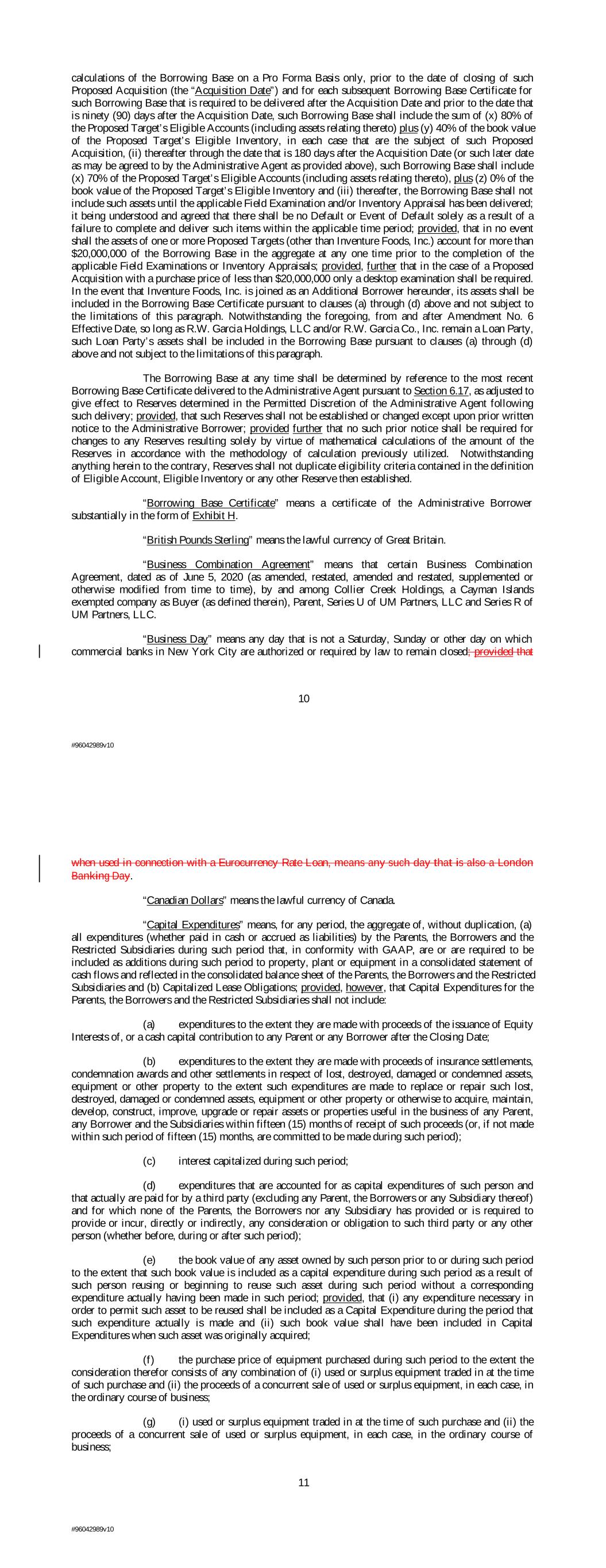calculations of the Borrowing Base on a Pro Forma Basis only, prior to the date of closing of such Proposed Acquisition (the “Acquisition Date”) and for each subsequent Borrowing Base Certificate for such Borrowing Base that is required to be delivered after the Acquisition Date and prior to the date that is ninety (90) days after the Acquisition Date, such Borrowing Base shall include the sum of (x) 80% of the Proposed Target’s Eligible Accounts (including assets relating thereto) plus (y) 40% of the book value of the Proposed Target’s Eligible Inventory, in each case that are the subject of such Proposed Acquisition, (ii) thereafter through the date that is 180 days after the Acquisition Date (or such later date as may be agreed to by the Administrative Agent as provided above), such Borrowing Base shall include (x) 70% of the Proposed Target’s Eligible Accounts (including assets relating thereto), plus (z) 0% of the book value of the Proposed Target’s Eligible Inventory and (iii) thereafter, the Borrowing Base shall not include such assets until the applicable Field Examination and/or Inventory Appraisal has been delivered; it being understood and agreed that there shall be no Default or Event of Default solely as a result of a failure to complete and deliver such items within the applicable time period; provided, that in no event shall the assets of one or more Proposed Targets (other than Inventure Foods, Inc.) account for more than $20,000,000 of the Borrowing Base in the aggregate at any one time prior to the completion of the applicable Field Examinations or Inventory Appraisals; provided, further that in the case of a Proposed Acquisition with a purchase price of less than $20,000,000 only a desktop examination shall be required. In the event that Inventure Foods, Inc. is joined as an Additional Borrower hereunder, its assets shall be included in the Borrowing Base Certificate pursuant to clauses (a) through (d) above and not subject to the limitations of this paragraph. Notwithstanding the foregoing, from and after Amendment No. 6 Effective Date, so long as R.W. Garcia Holdings, LLC and/or R.W. Garcia Co., Inc. remain a Loan Party, such Loan Party’s assets shall be included in the Borrowing Base pursuant to clauses (a) through (d) above and not subject to the limitations of this paragraph. The Borrowing Base at any time shall be determined by reference to the most recent Borrowing Base Certificate delivered to the Administrative Agent pursuant to Section 6.17, as adjusted to give effect to Reserves determined in the Permitted Discretion of the Administrative Agent following such delivery; provided, that such Reserves shall not be established or changed except upon prior written notice to the Administrative Borrower; provided further that no such prior notice shall be required for changes to any Reserves resulting solely by virtue of mathematical calculations of the amount of the Reserves in accordance with the methodology of calculation previously utilized. Notwithstanding anything herein to the contrary, Reserves shall not duplicate eligibility criteria contained in the definition of Eligible Account, Eligible Inventory or any other Reserve then established. “Borrowing Base Certificate” means a certificate of the Administrative Borrower substantially in the form of Exhibit H. “British Pounds Sterling” means the lawful currency of Great Britain. “Business Combination Agreement” means that certain Business Combination Agreement, dated as of June 5, 2020 (as amended, restated, amended and restated, supplemented or otherwise modified from time to time), by and among Collier Creek Holdings, a Cayman Islands exempted company as Buyer (as defined therein), Parent, Series U of UM Partners, LLC and Series R of UM Partners, LLC. “Business Day” means any day that is not a Saturday, Sunday or other day on which commercial banks in New York City are authorized or required by law to remain closed; provided that 10 #96042989v10 when used in connection with a Eurocurrency Rate Loan, means any such day that is also a London Banking Day. “Canadian Dollars” means the lawful currency of Canada. “Capital Expenditures” means, for any period, the aggregate of, without duplication, (a) all expenditures (whether paid in cash or accrued as liabilities) by the Parents, the Borrowers and the Restricted Subsidiaries during such period that, in conformity with GAAP, are or are required to be included as additions during such period to property, plant or equipment in a consolidated statement of cash flows and reflected in the consolidated balance sheet of the Parents, the Borrowers and the Restricted Subsidiaries and (b) Capitalized Lease Obligations; provided, however, that Capital Expenditures for the Parents, the Borrowers and the Restricted Subsidiaries shall not include: (a) expenditures to the extent they are made with proceeds of the issuance of Equity Interests of, or a cash capital contribution to any Parent or any Borrower after the Closing Date; (b) expenditures to the extent they are made with proceeds of insurance settlements, condemnation awards and other settlements in respect of lost, destroyed, damaged or condemned assets, equipment or other property to the extent such expenditures are made to replace or repair such lost, destroyed, damaged or condemned assets, equipment or other property or otherwise to acquire, maintain, develop, construct, improve, upgrade or repair assets or properties useful in the business of any Parent, any Borrower and the Subsidiaries within fifteen (15) months of receipt of such proceeds (or, if not made within such period of fifteen (15) months, are committed to be made during such period); (c) interest capitalized during such period; (d) expenditures that are accounted for as capital expenditures of such person and that actually are paid for by a third party (excluding any Parent, the Borrowers or any Subsidiary thereof) and