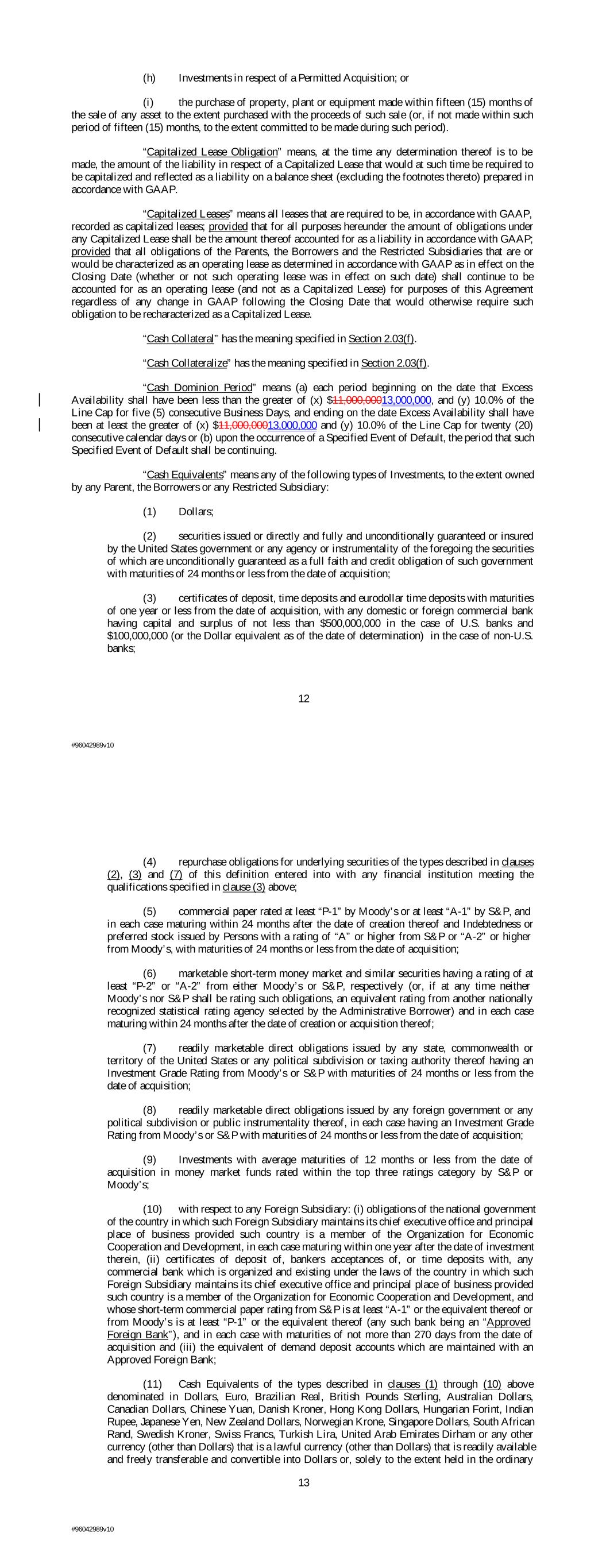 (h) Investments in respect of a Permitted Acquisition; or (i) the purchase of property, plant or equipment made within fifteen (15) months of the sale of any asset to the extent purchased with the proceeds of such sale (or, if not made within such period of fifteen (15) months, to the extent committed to be made during such period). “Capitalized Lease Obligation” means, at the time any determination thereof is to be made, the amount of the liability in respect of a Capitalized Lease that would at such time be required to be capitalized and reflected as a liability on a balance sheet (excluding the footnotes thereto) prepared in accordance with GAAP. “Capitalized Leases” means all leases that are required to be, in accordance with GAAP, recorded as capitalized leases; provided that for all purposes hereunder the amount of obligations under any Capitalized Lease shall be the amount thereof accounted for as a liability in accordance with GAAP; provided that all obligations of the Parents, the Borrowers and the Restricted Subsidiaries that are or would be characterized as an operating lease as determined in accordance with GAAP as in effect on the Closing Date (whether or not such operating lease was in effect on such date) shall continue to be accounted for as an operating lease (and not as a Capitalized Lease) for purposes of this Agreement regardless of any change in GAAP following the Closing Date that would otherwise require such obligation to be recharacterized as a Capitalized Lease. “Cash Collateral” has the meaning specified in Section 2.03(f). “Cash Collateralize” has the meaning specified in Section 2.03(f). “Cash Dominion Period” means (a) each period beginning on the date that Excess Availability shall have been less than the greater of (x) $11,000,00013,000,000, and (y) 10.0% of the Line Cap for five (5) consecutive Business Days, and ending on the date Excess Availability shall have been at least the greater of (x) $11,000,00013,000,000 and (y) 10.0% of the Line Cap for twenty (20) consecutive calendar days or (b) upon the occurrence of a Specified Event of Default, the period that such Specified Event of Default shall be continuing. “Cash Equivalents” means any of the following types of Investments, to the extent owned by any Parent, the Borrowers or any Restricted Subsidiary: (1) Dollars; (2) securities issued or directly and fully and unconditionally guaranteed or insured by the United States government or any agency or instrumentality of the foregoing the securities of which are unconditionally guaranteed as a full faith and credit obligation of such government with maturities of 24 months or less from the date of acquisition; (3) certificates of deposit, time deposits and eurodollar time deposits with maturities of one year or less from the date of acquisition, with any domestic or foreign commercial bank having capital and surplus of not less than $500,000,000 in the case of U.S. banks and $100,000,000 (or the Dollar equivalent as of the date of determination) in the case of non-U.S. banks; 12 #96042989v10 (4) repurchase obligations for underlying securities of the types described in clauses (2), (3) and (7) of this definition entered into with any financial institution meeting the qualifications specified in clause (3) above; (5) commercial paper rated at least “P-1” by Moody’s or at least “A-1” by S&P, and in each case maturing within 24 months after the date of creation thereof and Indebtedness or preferred stock issued by Persons with a rating of “A” or higher from S&P or “A-2” or higher from Moody’s, with maturities of 24 months or less from the date of acquisition; (6) marketable short-term money market and similar securities having a rating of at least “P-2” or “A-2” from either Moody’s or S&P, respectively (or, if at any time neither Moody’s nor S&P shall be rating such obligations, an equivalent rating from another nationally recognized statistical rating agency selected by the Administrative Borrower) and in each case maturing within 24 months after the date of creation or acquisition thereof; (7) readily marketable direct obligations issued by any state, commonwealth or territory of the United States or any political subdivision or taxing authority thereof having an Investment Grade Rating from Moody’s or S&P with maturities of 24 months or less from the date of acquisition; (8) readily marketable direct obligations issued by any foreign government or any political subdivision or public instrumentality thereof, in each case having an Investment Grade Rating from Moody’s or S&P with maturities of 24 months or less from the date of acquisition; (9) Investments with average maturities of 12 months or less from the date of acquisition in money market funds rated within the top three ratings category by S&P or Moody’s; (10) with respect to any Foreign Subsidiary: (i) obligations of the national government of the country in which such Foreign Subsidiary maintains its chief executive office and principal place of business provided such country is a member of the Organization for Economic Cooperation and Development, in each case maturing within one year after the date of investment therein, (ii) certificates of deposit of, bankers acceptances of, or time deposits with, any commercial bank which is organized and existing under the laws of the country in which such Foreign Subsidiary maintains its chief executive office and principal place of business provided such country is a member of the Organization for Economic Cooperation and Development, and whose short-term commercial paper rating from S&P is at least “A-1” or the equivalent thereof or from Moody’s is at least “P-1” or the equivalent thereof (any such bank being an “Approved Foreign Bank”), and in each case with maturities of not more than 270 days from the date of acquisition and (iii) the equivalent of demand deposit accounts which a