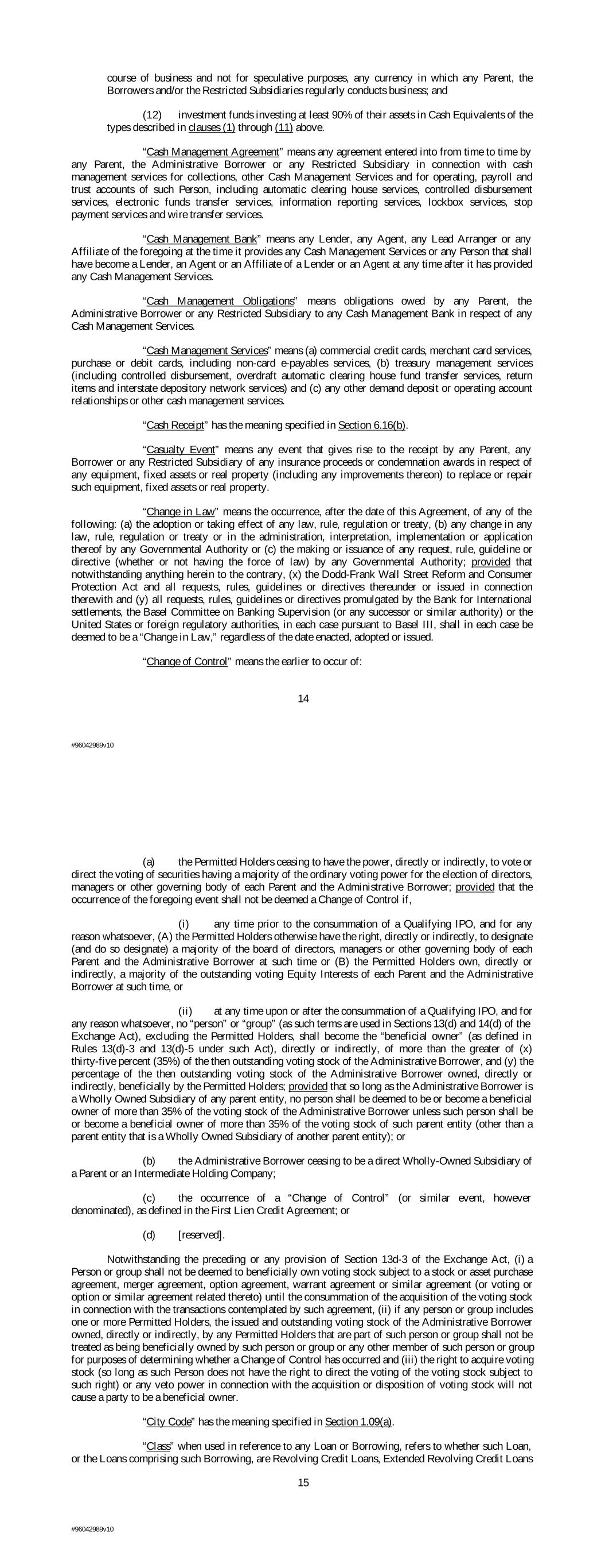 course of business and not for speculative purposes, any currency in which any Parent, the Borrowers and/or the Restricted Subsidiaries regularly conducts business; and (12) investment funds investing at least 90% of their assets in Cash Equivalents of the types described in clauses (1) through (11) above. “Cash Management Agreement” means any agreement entered into from time to time by any Parent, the Administrative Borrower or any Restricted Subsidiary in connection with cash management services for collections, other Cash Management Services and for operating, payroll and trust accounts of such Person, including automatic clearing house services, controlled disbursement services, electronic funds transfer services, information reporting services, lockbox services, stop payment services and wire transfer services. “Cash Management Bank” means any Lender, any Agent, any Lead Arranger or any Affiliate of the foregoing at the time it provides any Cash Management Services or any Person that shall have become a Lender, an Agent or an Affiliate of a Lender or an Agent at any time after it has provided any Cash Management Services. “Cash Management Obligations” means obligations owed by any Parent, the Administrative Borrower or any Restricted Subsidiary to any Cash Management Bank in respect of any Cash Management Services. “Cash Management Services” means (a) commercial credit cards, merchant card services, purchase or debit cards, including non-card e-payables services, (b) treasury management services (including controlled disbursement, overdraft automatic clearing house fund transfer services, return items and interstate depository network services) and (c) any other demand deposit or operating account relationships or other cash management services. “Cash Receipt” has the meaning specified in Section 6.16(b). “Casualty Event” means any event that gives rise to the receipt by any Parent, any Borrower or any Restricted Subsidiary of any insurance proceeds or condemnation awards in respect of any equipment, fixed assets or real property (including any improvements thereon) to replace or repair such equipment, fixed assets or real property. “Change in Law” means the occurrence, after the date of this Agreement, of any of the following: (a) the adoption or taking effect of any law, rule, regulation or treaty, (b) any change in any law, rule, regulation or treaty or in the administration, interpretation, implementation or application thereof by any Governmental Authority or (c) the making or issuance of any request, rule, guideline or directive (whether or not having the force of law) by any Governmental Authority; provided that notwithstanding anything herein to the contrary, (x) the Dodd-Frank Wall Street Reform and Consumer Protection Act and all requests, rules, guidelines or directives thereunder or issued in connection therewith and (y) all requests, rules, guidelines or directives promulgated by the Bank for International settlements, the Basel Committee on Banking Supervision (or any successor or similar authority) or the United States or foreign regulatory authorities, in each case pursuant to Basel III, shall in each case be deemed to be a “Change in Law,” regardless of the date enacted, adopted or issued. “Change of Control” means the earlier to occur of: 14 #96042989v10 (a) the Permitted Holders ceasing to have the power, directly or indirectly, to vote or direct the voting of securities having a majority of the ordinary voting power for the election of directors, managers or other governing body of each Parent and the Administrative Borrower; provided that the occurrence of the foregoing event shall not be deemed a Change of Control if, (i) any time prior to the consummation of a Qualifying IPO, and for any reason whatsoever, (A) the Permitted Holders otherwise have the right, directly or indirectly, to designate (and do so designate) a majority of the board of directors, managers or other governing body of each Parent and the Administrative Borrower at such time or (B) the Permitted Holders own, directly or indirectly, a majority of the outstanding voting Equity Interests of each Parent and the Administrative Borrower at such time, or (ii) at any time upon or after the consummation of a Qualifying IPO, and for any reason whatsoever, no “person” or “group” (as such terms are used in Sections 13(d) and 14(d) of the Exchange Act), excluding the Permitted Holders, shall become the “beneficial owner” (as defined in Rules 13(d)-3 and 13(d)-5 under such Act), directly or indirectly, of more than the greater of (x) thirty-five percent (35%) of the then outstanding voting stock of the Administrative Borrower, and (y) the percentage of the then outstanding voting stock of the Administrative Borrower owned, directly or indirectly, beneficially by the Permitted Holders; provided that so long as the Administrative Borrower is a Wholly Owned Subsidiary of any parent entity, no person shall be deemed to be or become a beneficial owner of more than 35% of the voting stock of the Administrative Borrower unless such person shall be or become a beneficial owner of more than 35% of the voting stock of such parent entity (other than a parent entity that is a Wholly Owned Subsidiary of another parent entity); or (b) the Administrative Borrower ceasing to be a direct Wholly-Owned Subsidiary of a Parent or an Intermediate Holding Company; (c) the occurrence of a “Change of Control” (or similar event, however denominated), as defined in the First Lien Credit Agreement; or (d) [reserved]. Notwithstanding the preceding or any provision of Section 13d-3 of the Exchange Act, (i) a Person or group shall not be deemed to beneficially own voting stock subject to a stock or asset purchase agreement, merger agreement, option agreement, warrant agreement or similar agreement (or voting or option or similar agreement related thereto) until the consummation of the