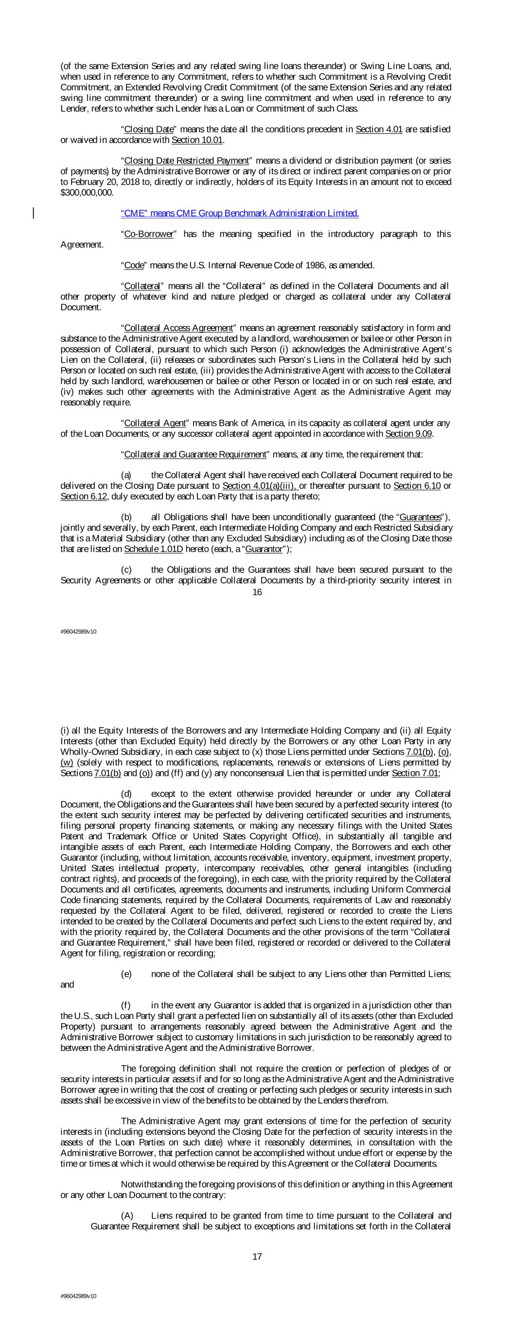 (of the same Extension Series and any related swing line loans thereunder) or Swing Line Loans, and, when used in reference to any Commitment, refers to whether such Commitment is a Revolving Credit Commitment, an Extended Revolving Credit Commitment (of the same Extension Series and any related swing line commitment thereunder) or a swing line commitment and when used in reference to any Lender, refers to whether such Lender has a Loan or Commitment of such Class. “Closing Date” means the date all the conditions precedent in Section 4.01 are satisfied or waived in accordance with Section 10.01. “Closing Date Restricted Payment” means a dividend or distribution payment (or series of payments) by the Administrative Borrower or any of its direct or indirect parent companies on or prior to February 20, 2018 to, directly or indirectly, holders of its Equity Interests in an amount not to exceed $300,000,000. “CME” means CME Group Benchmark Administration Limited. “Co-Borrower” has the meaning specified in the introductory paragraph to this Agreement. “Code” means the U.S. Internal Revenue Code of 1986, as amended. “Collateral” means all the “Collateral” as defined in the Collateral Documents and all other property of whatever kind and nature pledged or charged as collateral under any Collateral Document. “Collateral Access Agreement” means an agreement reasonably satisfactory in form and substance to the Administrative Agent executed by a landlord, warehousemen or bailee or other Person in possession of Collateral, pursuant to which such Person (i) acknowledges the Administrative Agent’s Lien on the Collateral, (ii) releases or subordinates such Person’s Liens in the Collateral held by such Person or located on such real estate, (iii) provides the Administrative Agent with access to the Collateral held by such landlord, warehousemen or bailee or other Person or located in or on such real estate, and (iv) makes such other agreements with the Administrative Agent as the Administrative Agent may reasonably require. “Collateral Agent” means Bank of America, in its capacity as collateral agent under any of the Loan Documents, or any successor collateral agent appointed in accordance with Section 9.09. “Collateral and Guarantee Requirement” means, at any time, the requirement that: (a) the Collateral Agent shall have received each Collateral Document required to be delivered on the Closing Date pursuant to Section 4.01(a)(iii), or thereafter pursuant to Section 6.10 or Section 6.12, duly executed by each Loan Party that is a party thereto; (b) all Obligations shall have been unconditionally guaranteed (the “Guarantees”), jointly and severally, by each Parent, each Intermediate Holding Company and each Restricted Subsidiary that is a Material Subsidiary (other than any Excluded Subsidiary) including as of the Closing Date those that are listed on Schedule 1.01D hereto (each, a “Guarantor”); (c) the Obligations and the Guarantees shall have been secured pursuant to the Security Agreements or other applicable Collateral Documents by a third-priority security interest in 16 #96042989v10 (i) all the Equity Interests of the Borrowers and any Intermediate Holding Company and (ii) all Equity Interests (other than Excluded Equity) held directly by the Borrowers or any other Loan Party in any Wholly-Owned Subsidiary, in each case subject to (x) those Liens permitted under Sections 7.01(b), (o), (w) (solely with respect to modifications, replacements, renewals or extensions of Liens permitted by Sections 7.01(b) and (o)) and (ff) and (y) any nonconsensual Lien that is permitted under Section 7.01; (d) except to the extent otherwise provided hereunder or under any Collateral Document, the Obligations and the Guarantees shall have been secured by a perfected security interest (to the extent such security interest may be perfected by delivering certificated securities and instruments, filing personal property financing statements, or making any necessary filings with the United States Patent and Trademark Office or United States Copyright Office), in substantially all tangible and intangible assets of each Parent, each Intermediate Holding Company, the Borrowers and each other Guarantor (including, without limitation, accounts receivable, inventory, equipment, investment property, United States intellectual property, intercompany receivables, other general intangibles (including contract rights), and proceeds of the foregoing), in each case, with the priority required by the Collateral Documents and all certificates, agreements, documents and instruments, including Uniform Commercial Code financing statements, required by the Collateral Documents, requirements of Law and reasonably requested by the Collateral Agent to be filed, delivered, registered or recorded to create the Liens intended to be created by the Collateral Documents and perfect such Liens to the extent required by, and with the priority required by, the Collateral Documents and the other provisions of the term “Collateral and Guarantee Requirement,” shall have been filed, registered or recorded or delivered to the Collateral Agent for filing, registration or recording; (e) none of the Collateral shall be subject to any Liens other than Permitted Liens; and (f) in the event any Guarantor is added that is organized in a jurisdiction other than the U.S., such Loan Party shall grant a perfected lien on substantially all of its assets (other than Excluded Property) pursuant to arrangements reasonably agreed between the Administrative Agent and the Administrative Borrower subject to customary limitations in such jurisdiction to be reasonably agreed to between the Administrative Agent and the Administrative Borrower. The foregoing definition shall not require the creation or perfection of pledges of or security interests in particular assets if and for so long as the Administrative Agent and the Adm