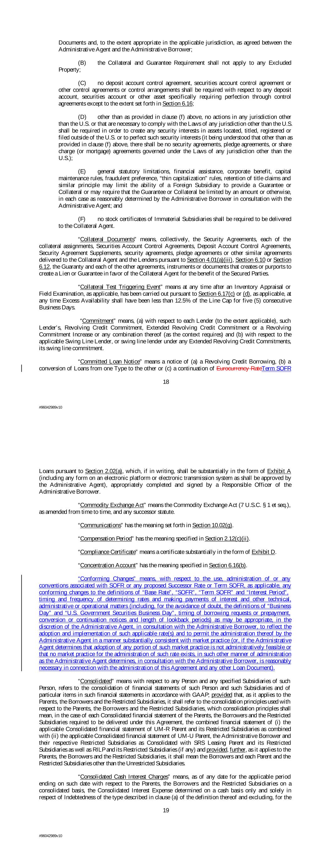 Documents and, to the extent appropriate in the applicable jurisdiction, as agreed between the Administrative Agent and the Administrative Borrower; (B) the Collateral and Guarantee Requirement shall not apply to any Excluded Property; (C) no deposit account control agreement, securities account control agreement or other control agreements or control arrangements shall be required with respect to any deposit account, securities account or other asset specifically requiring perfection through control agreements except to the extent set forth in Section 6.16; (D) other than as provided in clause (f) above, no actions in any jurisdiction other than the U.S. or that are necessary to comply with the Laws of any jurisdiction other than the U.S. shall be required in order to create any security interests in assets located, titled, registered or filed outside of the U.S. or to perfect such security interests (it being understood that other than as provided in clause (f) above, there shall be no security agreements, pledge agreements, or share charge (or mortgage) agreements governed under the Laws of any jurisdiction other than the U.S.); (E) general statutory limitations, financial assistance, corporate benefit, capital maintenance rules, fraudulent preference, “thin capitalization” rules, retention of title claims and similar principle may limit the ability of a Foreign Subsidiary to provide a Guarantee or Collateral or may require that the Guarantee or Collateral be limited by an amount or otherwise, in each case as reasonably determined by the Administrative Borrower in consultation with the Administrative Agent; and (F) no stock certificates of Immaterial Subsidiaries shall be required to be delivered to the Collateral Agent. “Collateral Documents” means, collectively, the Security Agreements, each of the collateral assignments, Securities Account Control Agreements, Deposit Account Control Agreements, Security Agreement Supplements, security agreements, pledge agreements or other similar agreements delivered to the Collateral Agent and the Lenders pursuant to Section 4.01(a)(iii), Section 6.10 or Section 6.12, the Guaranty and each of the other agreements, instruments or documents that creates or purports to create a Lien or Guarantee in favor of the Collateral Agent for the benefit of the Secured Parties. “Collateral Test Triggering Event” means at any time after an Inventory Appraisal or Field Examination, as applicable, has been carried out pursuant to Section 6.17(c) or (d), as applicable, at any time Excess Availability shall have been less than 12.5% of the Line Cap for five (5) consecutive Business Days. “Commitment” means, (a) with respect to each Lender (to the extent applicable), such Lender’s, Revolving Credit Commitment, Extended Revolving Credit Commitment or a Revolving Commitment Increase or any combination thereof (as the context requires) and (b) with respect to the applicable Swing Line Lender, or swing line lender under any Extended Revolving Credit Commitments, its swing line commitment. “Committed Loan Notice” means a notice of (a) a Revolving Credit Borrowing, (b) a conversion of Loans from one Type to the other or (c) a continuation of Eurocurrency RateTerm SOFR 18 #96042989v10 Loans pursuant to Section 2.02(a), which, if in writing, shall be substantially in the form of Exhibit A (including any form on an electronic platform or electronic transmission system as shall be approved by the Administrative Agent), appropriately completed and signed by a Responsible Officer of the Administrative Borrower. “Commodity Exchange Act” means the Commodity Exchange Act (7 U.S.C. § 1 et seq.), as amended from time to time, and any successor statute. “Communications” has the meaning set forth in Section 10.02(g). “Compensation Period” has the meaning specified in Section 2.12(c)(ii). “Compliance Certificate” means a certificate substantially in the form of Exhibit D. “Concentration Account” has the meaning specified in Section 6.16(b). “Conforming Changes” means, with respect to the use, administration of or any conventions associated with SOFR or any proposed Successor Rate or Term SOFR, as applicable, any conforming changes to the definitions of “Base Rate”, “SOFR”, “Term SOFR” and “Interest Period”, timing and frequency of determining rates and making payments of interest and other technical, administrative or operational matters (including, for the avoidance of doubt, the definitions of “Business Day” and “U.S. Government Securities Business Day”, timing of borrowing requests or prepayment, conversion or continuation notices and length of lookback periods) as may be appropriate, in the discretion of the Administrative Agent, in consultation with the Administrative Borrower, to reflect the adoption and implementation of such applicable rate(s) and to permit the administration thereof by the Administrative Agent in a manner substantially consistent with market practice (or, if the Administrative Agent determines that adoption of any portion of such market practice is not administratively feasible or that no market practice for the administration of such rate exists, in such other manner of administration as the Administrative Agent determines, in consultation with the Administrative Borrower, is reasonably necessary in connection with the administration of this Agreement and any other Loan Document). “Consolidated” means with respect to any Person and any specified Subsidiaries of such Person, refers to the consolidation of financial statements of such Person and such Subsidiaries and of particular items in such financial statements in accordance with GAAP; provided that, as it applies to the Parents, the Borrowers and the Restricted Subsidiaries, it shall refer to the consolidation principles used with respect to the Parents, the Borrowers and the Restricted Subsidiaries, which consolidation principles s