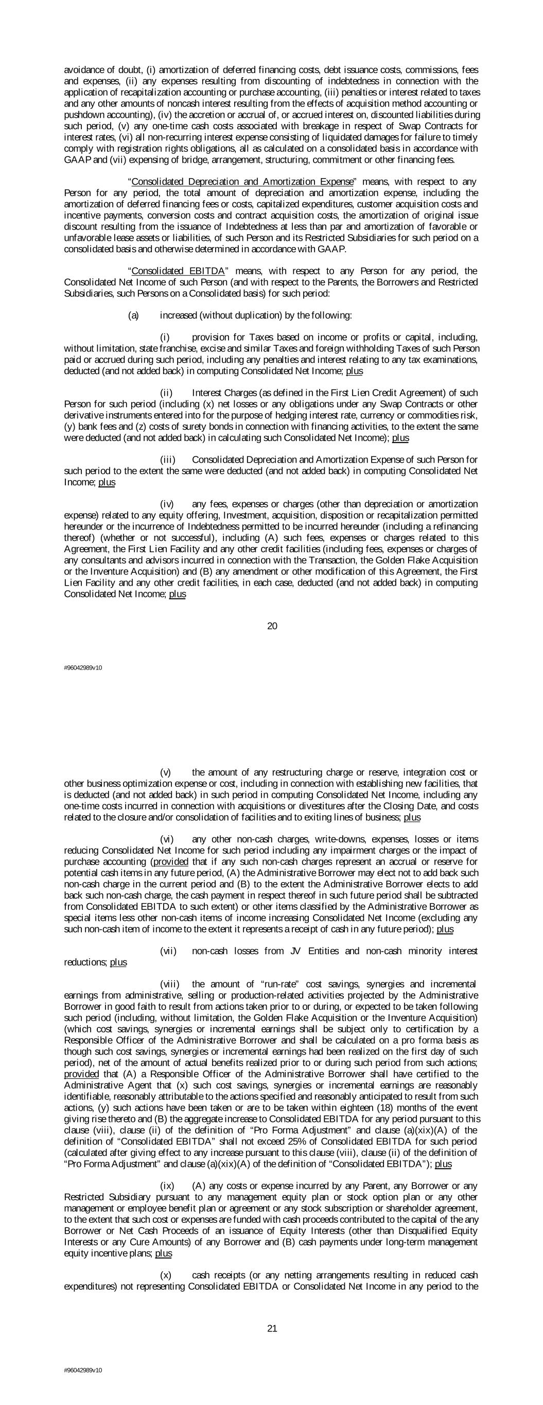 avoidance of doubt, (i) amortization of deferred financing costs, debt issuance costs, commissions, fees and expenses, (ii) any expenses resulting from discounting of indebtedness in connection with the application of recapitalization accounting or purchase accounting, (iii) penalties or interest related to taxes and any other amounts of noncash interest resulting from the effects of acquisition method accounting or pushdown accounting), (iv) the accretion or accrual of, or accrued interest on, discounted liabilities during such period, (v) any one-time cash costs associated with breakage in respect of Swap Contracts for interest rates, (vi) all non-recurring interest expense consisting of liquidated damages for failure to timely comply with registration rights obligations, all as calculated on a consolidated basis in accordance with GAAP and (vii) expensing of bridge, arrangement, structuring, commitment or other financing fees. “Consolidated Depreciation and Amortization Expense” means, with respect to any Person for any period, the total amount of depreciation and amortization expense, including the amortization of deferred financing fees or costs, capitalized expenditures, customer acquisition costs and incentive payments, conversion costs and contract acquisition costs, the amortization of original issue discount resulting from the issuance of Indebtedness at less than par and amortization of favorable or unfavorable lease assets or liabilities, of such Person and its Restricted Subsidiaries for such period on a consolidated basis and otherwise determined in accordance with GAAP. “Consolidated EBITDA” means, with respect to any Person for any period, the Consolidated Net Income of such Person (and with respect to the Parents, the Borrowers and Restricted Subsidiaries, such Persons on a Consolidated basis) for such period: (a) increased (without duplication) by the following: (i) provision for Taxes based on income or profits or capital, including, without limitation, state franchise, excise and similar Taxes and foreign withholding Taxes of such Person paid or accrued during such period, including any penalties and interest relating to any tax examinations, deducted (and not added back) in computing Consolidated Net Income; plus (ii) Interest Charges (as defined in the First Lien Credit Agreement) of such Person for such period (including (x) net losses or any obligations under any Swap Contracts or other derivative instruments entered into for the purpose of hedging interest rate, currency or commodities risk, (y) bank fees and (z) costs of surety bonds in connection with financing activities, to the extent the same were deducted (and not added back) in calculating such Consolidated Net Income); plus (iii) Consolidated Depreciation and Amortization Expense of such Person for such period to the extent the same were deducted (and not added back) in computing Consolidated Net Income; plus (iv) any fees, expenses or charges (other than depreciation or amortization expense) related to any equity offering, Investment, acquisition, disposition or recapitalization permitted hereunder or the incurrence of Indebtedness permitted to be incurred hereunder (including a refinancing thereof) (whether or not successful), including (A) such fees, expenses or charges related to this Agreement, the First Lien Facility and any other credit facilities (including fees, expenses or charges of any consultants and advisors incurred in connection with the Transaction, the Golden Flake Acquisition or the Inventure Acquisition) and (B) any amendment or other modification of this Agreement, the First Lien Facility and any other credit facilities, in each case, deducted (and not added back) in computing Consolidated Net Income; plus 20 #96042989v10 (v) the amount of any restructuring charge or reserve, integration cost or other business optimization expense or cost, including in connection with establishing new facilities, that is deducted (and not added back) in such period in computing Consolidated Net Income, including any one-time costs incurred in connection with acquisitions or divestitures after the Closing Date, and costs related to the closure and/or consolidation of facilities and to exiting lines of business; plus (vi) any other non-cash charges, write-downs, expenses, losses or items reducing Consolidated Net Income for such period including any impairment charges or the impact of purchase accounting (provided that if any such non-cash charges represent an accrual or reserve for potential cash items in any future period, (A) the Administrative Borrower may elect not to add back such non-cash charge in the current period and (B) to the extent the Administrative Borrower elects to add back such non-cash charge, the cash payment in respect thereof in such future period shall be subtracted from Consolidated EBITDA to such extent) or other items classified by the Administrative Borrower as special items less other non-cash items of income increasing Consolidated Net Income (excluding any such non-cash item of income to the extent it represents a receipt of cash in any future period); plus (vii) non-cash losses from JV Entities and non-cash minority interest reductions; plus (viii) the amount of “run-rate” cost savings, synergies and incremental earnings from administrative, selling or production-related activities projected by the Administrative Borrower in good faith to result from actions taken prior to or during, or expected to be taken following such period (including, without limitation, the Golden Flake Acquisition or the Inventure Acquisition) (which cost savings, synergies or incremental earnings shall be subject only to certification by a Responsible Officer of the Administrative Borrower and shall be calculated on a pro forma basis as though such cost savings, synergies or incremental earnings had been realized on the first day of such period), net of the amount of actual benefits r