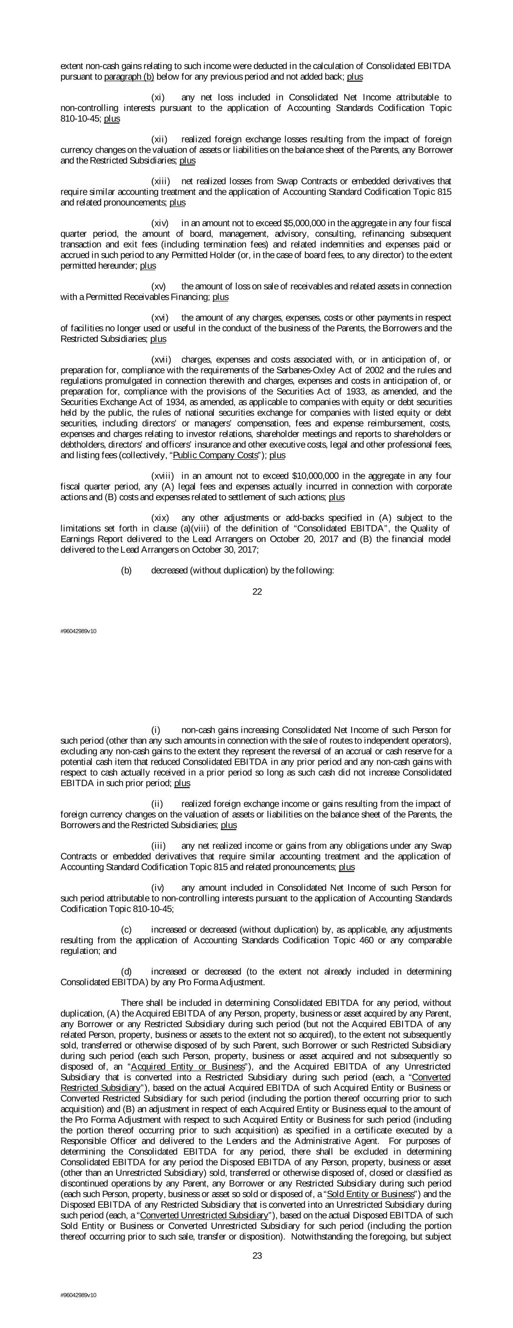 extent non-cash gains relating to such income were deducted in the calculation of Consolidated EBITDA pursuant to paragraph (b) below for any previous period and not added back; plus (xi) any net loss included in Consolidated Net Income attributable to non-controlling interests pursuant to the application of Accounting Standards Codification Topic 810-10-45; plus (xii) realized foreign exchange losses resulting from the impact of foreign currency changes on the valuation of assets or liabilities on the balance sheet of the Parents, any Borrower and the Restricted Subsidiaries; plus (xiii) net realized losses from Swap Contracts or embedded derivatives that require similar accounting treatment and the application of Accounting Standard Codification Topic 815 and related pronouncements; plus (xiv) in an amount not to exceed $5,000,000 in the aggregate in any four fiscal quarter period, the amount of board, management, advisory, consulting, refinancing subsequent transaction and exit fees (including termination fees) and related indemnities and expenses paid or accrued in such period to any Permitted Holder (or, in the case of board fees, to any director) to the extent permitted hereunder; plus (xv) the amount of loss on sale of receivables and related assets in connection with a Permitted Receivables Financing; plus (xvi) the amount of any charges, expenses, costs or other payments in respect of facilities no longer used or useful in the conduct of the business of the Parents, the Borrowers and the Restricted Subsidiaries; plus (xvii) charges, expenses and costs associated with, or in anticipation of, or preparation for, compliance with the requirements of the Sarbanes-Oxley Act of 2002 and the rules and regulations promulgated in connection therewith and charges, expenses and costs in anticipation of, or preparation for, compliance with the provisions of the Securities Act of 1933, as amended, and the Securities Exchange Act of 1934, as amended, as applicable to companies with equity or debt securities held by the public, the rules of national securities exchange for companies with listed equity or debt securities, including directors’ or managers’ compensation, fees and expense reimbursement, costs, expenses and charges relating to investor relations, shareholder meetings and reports to shareholders or debtholders, directors’ and officers’ insurance and other executive costs, legal and other professional fees, and listing fees (collectively, “Public Company Costs”); plus (xviii) in an amount not to exceed $10,000,000 in the aggregate in any four fiscal quarter period, any (A) legal fees and expenses actually incurred in connection with corporate actions and (B) costs and expenses related to settlement of such actions; plus (xix) any other adjustments or add-backs specified in (A) subject to the limitations set forth in clause (a)(viii) of the definition of “Consolidated EBITDA”, the Quality of Earnings Report delivered to the Lead Arrangers on October 20, 2017 and (B) the financial model delivered to the Lead Arrangers on October 30, 2017; (b) decreased (without duplication) by the following: 22 #96042989v10 (i) non-cash gains increasing Consolidated Net Income of such Person for such period (other than any such amounts in connection with the sale of routes to independent operators), excluding any non-cash gains to the extent they represent the reversal of an accrual or cash reserve for a potential cash item that reduced Consolidated EBITDA in any prior period and any non-cash gains with respect to cash actually received in a prior period so long as such cash did not increase Consolidated EBITDA in such prior period; plus (ii) realized foreign exchange income or gains resulting from the impact of foreign currency changes on the valuation of assets or liabilities on the balance sheet of the Parents, the Borrowers and the Restricted Subsidiaries; plus (iii) any net realized income or gains from any obligations under any Swap Contracts or embedded derivatives that require similar accounting treatment and the application of Accounting Standard Codification Topic 815 and related pronouncements; plus (iv) any amount included in Consolidated Net Income of such Person for such period attributable to non-controlling interests pursuant to the application of Accounting Standards Codification Topic 810-10-45; (c) increased or decreased (without duplication) by, as applicable, any adjustments resulting from the application of Accounting Standards Codification Topic 460 or any comparable regulation; and (d) increased or decreased (to the extent not already included in determining Consolidated EBITDA) by any Pro Forma Adjustment. There shall be included in determining Consolidated EBITDA for any period, without duplication, (A) the Acquired EBITDA of any Person, property, business or asset acquired by any Parent, any Borrower or any Restricted Subsidiary during such period (but not the Acquired EBITDA of any related Person, property, business or assets to the extent not so acquired), to the extent not subsequently sold, transferred or otherwise disposed of by such Parent, such Borrower or such Restricted Subsidiary during such period (each such Person, property, business or asset acquired and not subsequently so disposed of, an “Acquired Entity or Business”), and the Acquired EBITDA of any Unrestricted Subsidiary that is converted into a Restricted Subsidiary during such period (each, a “Converted Restricted Subsidiary”), based on the actual Acquired EBITDA of such Acquired Entity or Business or Converted Restricted Subsidiary for such period (including the portion thereof occurring prior to such acquisition) and (B) an adjustment in respect of each Acquired Entity or Business equal to the amount of the Pro Forma Adjustment with respect to such Acquired Entity or Business for such period (including the portion thereof occurring prior to such acquisition) as specified in a certif
