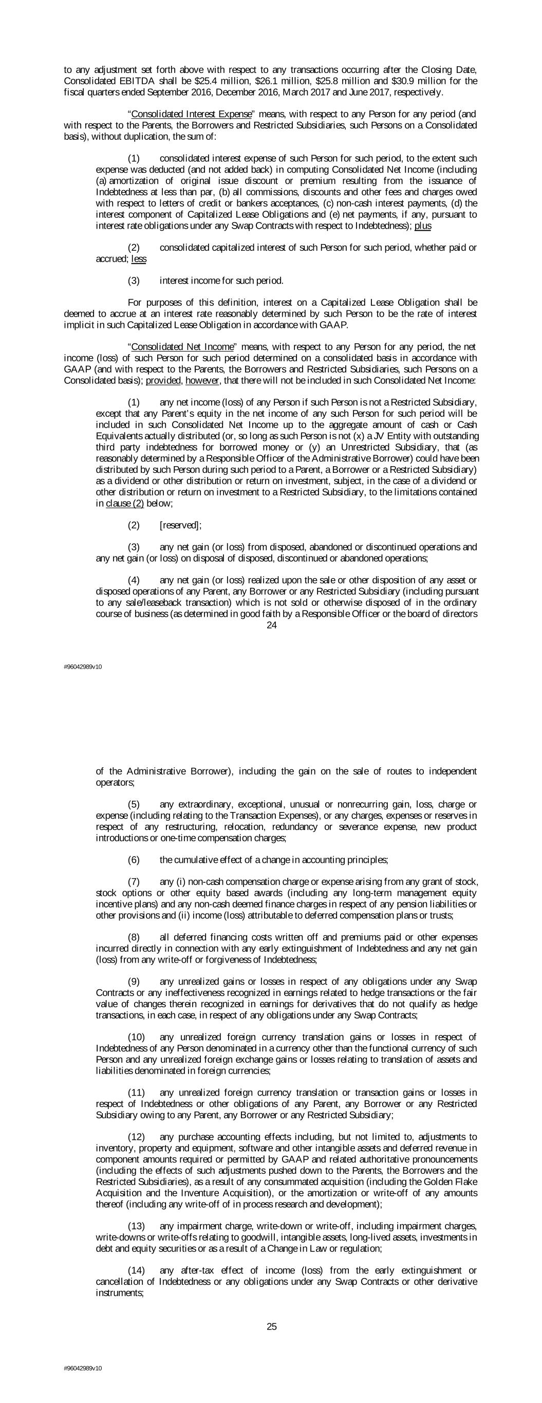 to any adjustment set forth above with respect to any transactions occurring after the Closing Date, Consolidated EBITDA shall be $25.4 million, $26.1 million, $25.8 million and $30.9 million for the fiscal quarters ended September 2016, December 2016, March 2017 and June 2017, respectively. “Consolidated Interest Expense” means, with respect to any Person for any period (and with respect to the Parents, the Borrowers and Restricted Subsidiaries, such Persons on a Consolidated basis), without duplication, the sum of: (1) consolidated interest expense of such Person for such period, to the extent such expense was deducted (and not added back) in computing Consolidated Net Income (including (a) amortization of original issue discount or premium resulting from the issuance of Indebtedness at less than par, (b) all commissions, discounts and other fees and charges owed with respect to letters of credit or bankers acceptances, (c) non-cash interest payments, (d) the interest component of Capitalized Lease Obligations and (e) net payments, if any, pursuant to interest rate obligations under any Swap Contracts with respect to Indebtedness); plus (2) consolidated capitalized interest of such Person for such period, whether paid or accrued; less (3) interest income for such period. For purposes of this definition, interest on a Capitalized Lease Obligation shall be deemed to accrue at an interest rate reasonably determined by such Person to be the rate of interest implicit in such Capitalized Lease Obligation in accordance with GAAP. “Consolidated Net Income” means, with respect to any Person for any period, the net income (loss) of such Person for such period determined on a consolidated basis in accordance with GAAP (and with respect to the Parents, the Borrowers and Restricted Subsidiaries, such Persons on a Consolidated basis); provided, however, that there will not be included in such Consolidated Net Income: (1) any net income (loss) of any Person if such Person is not a Restricted Subsidiary, except that any Parent’s equity in the net income of any such Person for such period will be included in such Consolidated Net Income up to the aggregate amount of cash or Cash Equivalents actually distributed (or, so long as such Person is not (x) a JV Entity with outstanding third party indebtedness for borrowed money or (y) an Unrestricted Subsidiary, that (as reasonably determined by a Responsible Officer of the Administrative Borrower) could have been distributed by such Person during such period to a Parent, a Borrower or a Restricted Subsidiary) as a dividend or other distribution or return on investment, subject, in the case of a dividend or other distribution or return on investment to a Restricted Subsidiary, to the limitations contained in clause (2) below; (2) [reserved]; (3) any net gain (or loss) from disposed, abandoned or discontinued operations and any net gain (or loss) on disposal of disposed, discontinued or abandoned operations; (4) any net gain (or loss) realized upon the sale or other disposition of any asset or disposed operations of any Parent, any Borrower or any Restricted Subsidiary (including pursuant to any sale/leaseback transaction) which is not sold or otherwise disposed of in the ordinary course of business (as determined in good faith by a Responsible Officer or the board of directors 24 #96042989v10 of the Administrative Borrower), including the gain on the sale of routes to independent operators; (5) any extraordinary, exceptional, unusual or nonrecurring gain, loss, charge or expense (including relating to the Transaction Expenses), or any charges, expenses or reserves in respect of any restructuring, relocation, redundancy or severance expense, new product introductions or one-time compensation charges; (6) the cumulative effect of a change in accounting principles; (7) any (i) non-cash compensation charge or expense arising from any grant of stock, stock options or other equity based awards (including any long-term management equity incentive plans) and any non-cash deemed finance charges in respect of any pension liabilities or other provisions and (ii) income (loss) attributable to deferred compensation plans or trusts; (8) all deferred financing costs written off and premiums paid or other expenses incurred directly in connection with any early extinguishment of Indebtedness and any net gain (loss) from any write-off or forgiveness of Indebtedness; (9) any unrealized gains or losses in respect of any obligations under any Swap Contracts or any ineffectiveness recognized in earnings related to hedge transactions or the fair value of changes therein recognized in earnings for derivatives that do not qualify as hedge transactions, in each case, in respect of any obligations under any Swap Contracts; (10) any unrealized foreign currency translation gains or losses in respect of Indebtedness of any Person denominated in a currency other than the functional currency of such Person and any unrealized foreign exchange gains or losses relating to translation of assets and liabilities denominated in foreign currencies; (11) any unrealized foreign currency translation or transaction gains or losses in respect of Indebtedness or other obligations of any Parent, any Borrower or any Restricted Subsidiary owing to any Parent, any Borrower or any Restricted Subsidiary; (12) any purchase accounting effects including, but not limited to, adjustments to inventory, property and equipment, software and other intangible assets and deferred revenue in component amounts required or permitted by GAAP and related authoritative pronouncements (including the effects of such adjustments pushed down to the Parents, the Borrowers and the Restricted Subsidiaries), as a result of any consummated acquisition (including the Golden Flake Acquisition and the Inventure Acquisition), or the amortization or write-off of any amounts thereof (including any write-off of in process research a