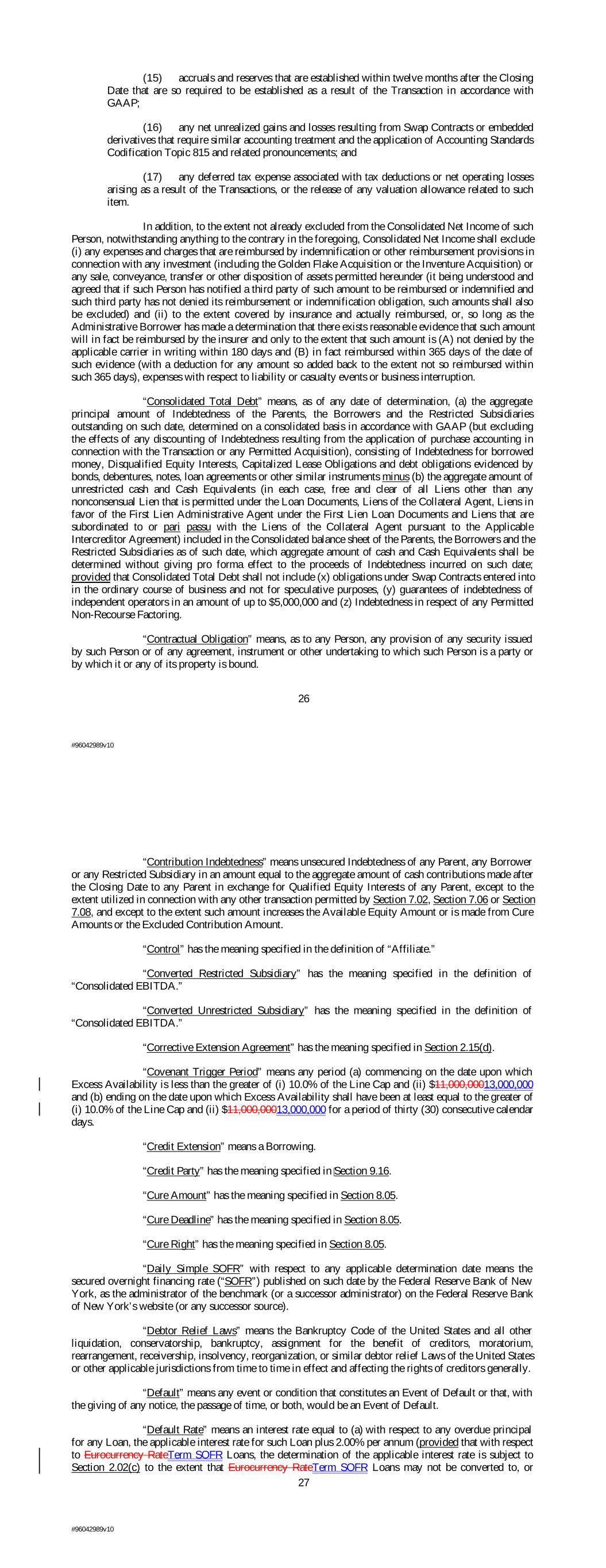 (15) accruals and reserves that are established within twelve months after the Closing Date that are so required to be established as a result of the Transaction in accordance with GAAP; (16) any net unrealized gains and losses resulting from Swap Contracts or embedded derivatives that require similar accounting treatment and the application of Accounting Standards Codification Topic 815 and related pronouncements; and (17) any deferred tax expense associated with tax deductions or net operating losses arising as a result of the Transactions, or the release of any valuation allowance related to such item. In addition, to the extent not already excluded from the Consolidated Net Income of such Person, notwithstanding anything to the contrary in the foregoing, Consolidated Net Income shall exclude (i) any expenses and charges that are reimbursed by indemnification or other reimbursement provisions in connection with any investment (including the Golden Flake Acquisition or the Inventure Acquisition) or any sale, conveyance, transfer or other disposition of assets permitted hereunder (it being understood and agreed that if such Person has notified a third party of such amount to be reimbursed or indemnified and such third party has not denied its reimbursement or indemnification obligation, such amounts shall also be excluded) and (ii) to the extent covered by insurance and actually reimbursed, or, so long as the Administrative Borrower has made a determination that there exists reasonable evidence that such amount will in fact be reimbursed by the insurer and only to the extent that such amount is (A) not denied by the applicable carrier in writing within 180 days and (B) in fact reimbursed within 365 days of the date of such evidence (with a deduction for any amount so added back to the extent not so reimbursed within such 365 days), expenses with respect to liability or casualty events or business interruption. “Consolidated Total Debt” means, as of any date of determination, (a) the aggregate principal amount of Indebtedness of the Parents, the Borrowers and the Restricted Subsidiaries outstanding on such date, determined on a consolidated basis in accordance with GAAP (but excluding the effects of any discounting of Indebtedness resulting from the application of purchase accounting in connection with the Transaction or any Permitted Acquisition), consisting of Indebtedness for borrowed money, Disqualified Equity Interests, Capitalized Lease Obligations and debt obligations evidenced by bonds, debentures, notes, loan agreements or other similar instruments minus (b) the aggregate amount of unrestricted cash and Cash Equivalents (in each case, free and clear of all Liens other than any nonconsensual Lien that is permitted under the Loan Documents, Liens of the Collateral Agent, Liens in favor of the First Lien Administrative Agent under the First Lien Loan Documents and Liens that are subordinated to or pari passu with the Liens of the Collateral Agent pursuant to the Applicable Intercreditor Agreement) included in the Consolidated balance sheet of the Parents, the Borrowers and the Restricted Subsidiaries as of such date, which aggregate amount of cash and Cash Equivalents shall be determined without giving pro forma effect to the proceeds of Indebtedness incurred on such date; provided that Consolidated Total Debt shall not include (x) obligations under Swap Contracts entered into in the ordinary course of business and not for speculative purposes, (y) guarantees of indebtedness of independent operators in an amount of up to $5,000,000 and (z) Indebtedness in respect of any Permitted Non-Recourse Factoring. “Contractual Obligation” means, as to any Person, any provision of any security issued by such Person or of any agreement, instrument or other undertaking to which such Person is a party or by which it or any of its property is bound. 26 #96042989v10 “Contribution Indebtedness” means unsecured Indebtedness of any Parent, any Borrower or any Restricted Subsidiary in an amount equal to the aggregate amount of cash contributions made after the Closing Date to any Parent in exchange for Qualified Equity Interests of any Parent, except to the extent utilized in connection with any other transaction permitted by Section 7.02, Section 7.06 or Section 7.08, and except to the extent such amount increases the Available Equity Amount or is made from Cure Amounts or the Excluded Contribution Amount. “Control” has the meaning specified in the definition of “Affiliate.” “Converted Restricted Subsidiary” has the meaning specified in the definition of “Consolidated EBITDA.” “Converted Unrestricted Subsidiary” has the meaning specified in the definition of “Consolidated EBITDA.” “Corrective Extension Agreement” has the meaning specified in Section 2.15(d). “Covenant Trigger Period” means any period (a) commencing on the date upon which Excess Availability is less than the greater of (i) 10.0% of the Line Cap and (ii) $11,000,00013,000,000 and (b) ending on the date upon which Excess Availability shall have been at least equal to the greater of (i) 10.0% of the Line Cap and (ii) $11,000,00013,000,000 for a period of thirty (30) consecutive calendar days. “Credit Extension” means a Borrowing. “Credit Party” has the meaning specified in ‎Section 9.16. “Cure Amount” has the meaning specified in Section 8.05. “Cure Deadline” has the meaning specified in Section 8.05. “Cure Right” has the meaning specified in Section 8.05. “Daily Simple SOFR” with respect to any applicable determination date means the secured overnight financing rate (“SOFR”) published on such date by the Federal Reserve Bank of New York, as the administrator of the benchmark (or a successor administrator) on the Federal Reserve Bank of New York’s website (or any successor source). “Debtor Relief Laws” means the Bankruptcy Code of the United States and all oth