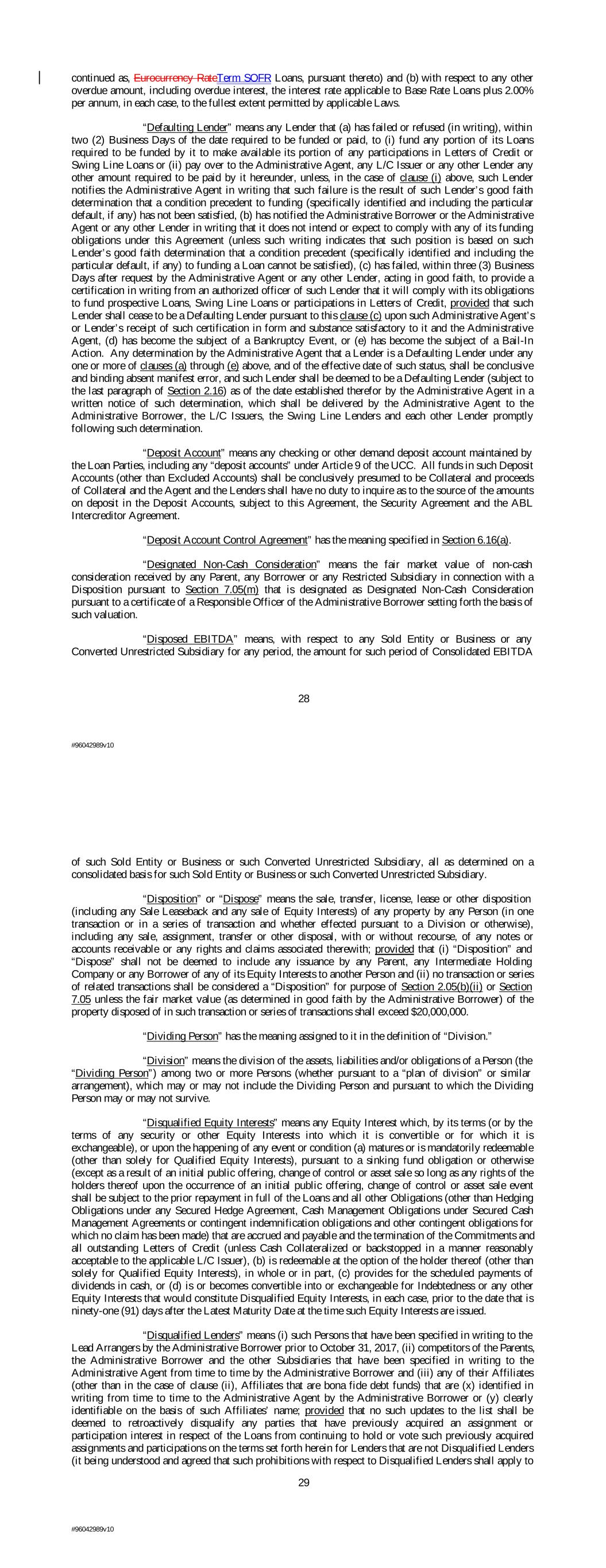 continued as, Eurocurrency RateTerm SOFR Loans, pursuant thereto) and (b) with respect to any other overdue amount, including overdue interest, the interest rate applicable to Base Rate Loans plus 2.00% per annum, in each case, to the fullest extent permitted by applicable Laws. “Defaulting Lender” means any Lender that (a) has failed or refused (in writing), within two (2) Business Days of the date required to be funded or paid, to (i) fund any portion of its Loans required to be funded by it to make available its portion of any participations in Letters of Credit or Swing Line Loans or (ii) pay over to the Administrative Agent, any L/C Issuer or any other Lender any other amount required to be paid by it hereunder, unless, in the case of clause (i) above, such Lender notifies the Administrative Agent in writing that such failure is the result of such Lender’s good faith determination that a condition precedent to funding (specifically identified and including the particular default, if any) has not been satisfied, (b) has notified the Administrative Borrower or the Administrative Agent or any other Lender in writing that it does not intend or expect to comply with any of its funding obligations under this Agreement (unless such writing indicates that such position is based on such Lender’s good faith determination that a condition precedent (specifically identified and including the particular default, if any) to funding a Loan cannot be satisfied), (c) has failed, within three (3) Business Days after request by the Administrative Agent or any other Lender, acting in good faith, to provide a certification in writing from an authorized officer of such Lender that it will comply with its obligations to fund prospective Loans, Swing Line Loans or participations in Letters of Credit, provided that such Lender shall cease to be a Defaulting Lender pursuant to this clause (c) upon such Administrative Agent’s or Lender’s receipt of such certification in form and substance satisfactory to it and the Administrative Agent, (d) has become the subject of a Bankruptcy Event, or (e) has become the subject of a Bail-In Action. Any determination by the Administrative Agent that a Lender is a Defaulting Lender under any one or more of clauses (a) through (e) above, and of the effective date of such status, shall be conclusive and binding absent manifest error, and such Lender shall be deemed to be a Defaulting Lender (subject to the last paragraph of Section 2.16) as of the date established therefor by the Administrative Agent in a written notice of such determination, which shall be delivered by the Administrative Agent to the Administrative Borrower, the L/C Issuers, the Swing Line Lenders and each other Lender promptly following such determination. “Deposit Account” means any checking or other demand deposit account maintained by the Loan Parties, including any “deposit accounts” under Article 9 of the UCC. All funds in such Deposit Accounts (other than Excluded Accounts) shall be conclusively presumed to be Collateral and proceeds of Collateral and the Agent and the Lenders shall have no duty to inquire as to the source of the amounts on deposit in the Deposit Accounts, subject to this Agreement, the Security Agreement and the ABL Intercreditor Agreement. “Deposit Account Control Agreement” has the meaning specified in Section 6.16(a). “Designated Non-Cash Consideration” means the fair market value of non-cash consideration received by any Parent, any Borrower or any Restricted Subsidiary in connection with a Disposition pursuant to Section 7.05(m) that is designated as Designated Non-Cash Consideration pursuant to a certificate of a Responsible Officer of the Administrative Borrower setting forth the basis of such valuation. “Disposed EBITDA” means, with respect to any Sold Entity or Business or any Converted Unrestricted Subsidiary for any period, the amount for such period of Consolidated EBITDA 28 #96042989v10 of such Sold Entity or Business or such Converted Unrestricted Subsidiary, all as determined on a consolidated basis for such Sold Entity or Business or such Converted Unrestricted Subsidiary. “Disposition” or “Dispose” means the sale, transfer, license, lease or other disposition (including any Sale Leaseback and any sale of Equity Interests) of any property by any Person (in one transaction or in a series of transaction and whether effected pursuant to a Division or otherwise), including any sale, assignment, transfer or other disposal, with or without recourse, of any notes or accounts receivable or any rights and claims associated therewith; provided that (i) “Disposition” and “Dispose” shall not be deemed to include any issuance by any Parent, any Intermediate Holding Company or any Borrower of any of its Equity Interests to another Person and (ii) no transaction or series of related transactions shall be considered a “Disposition” for purpose of Section 2.05(b)(ii) or Section 7.05 unless the fair market value (as determined in good faith by the Administrative Borrower) of the property disposed of in such transaction or series of transactions shall exceed $20,000,000. “Dividing Person” has the meaning assigned to it in the definition of “Division.” “Division” means the division of the assets, liabilities and/or obligations of a Person (the “Dividing Person”) among two or more Persons (whether pursuant to a “plan of division” or similar arrangement), which may or may not include the Dividing Person and pursuant to which the Dividing Person may or may not survive. “Disqualified Equity Interests” means any Equity Interest which, by its terms (or by the terms of any security or other Equity Interests into which it is convertible or for which it is exchangeable), or upon the happening of any event or condition (a) matures or is mandatorily redeemable (other than solely for Qualified Equity Interests), pursuant to 