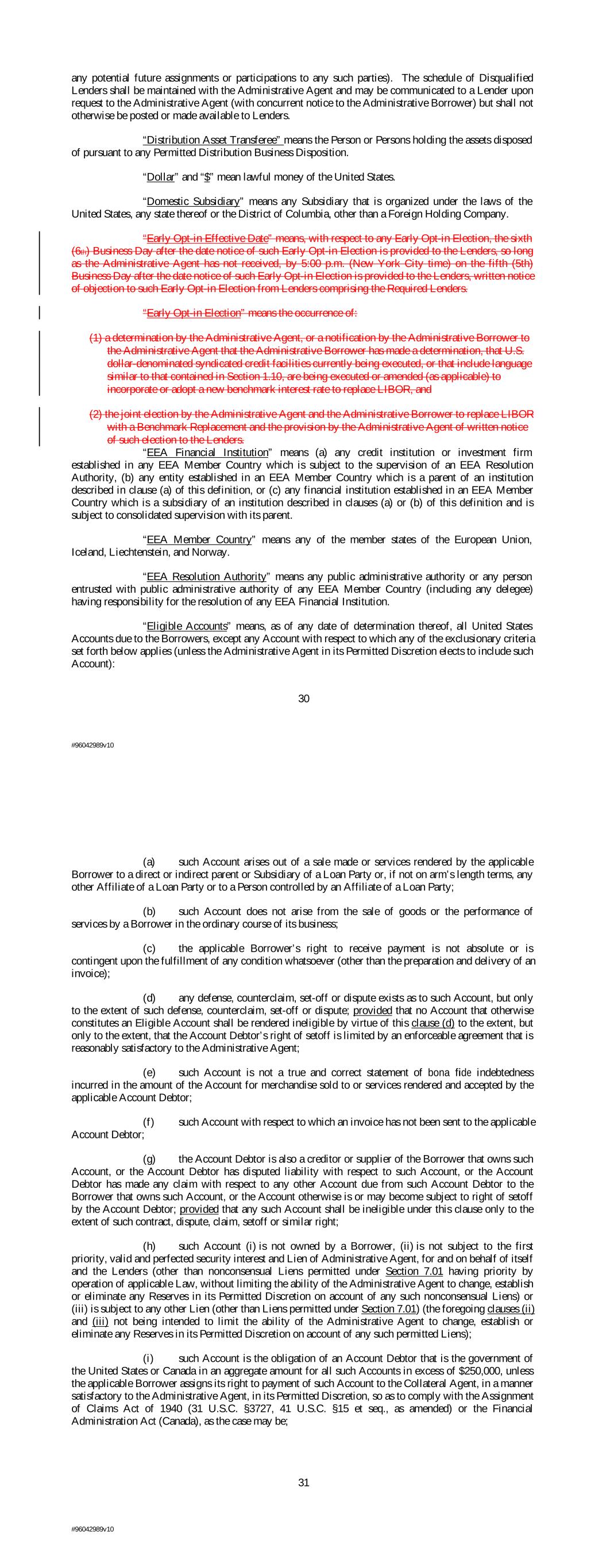 any potential future assignments or participations to any such parties). The schedule of Disqualified Lenders shall be maintained with the Administrative Agent and may be communicated to a Lender upon request to the Administrative Agent (with concurrent notice to the Administrative Borrower) but shall not otherwise be posted or made available to Lenders. “Distribution Asset Transferee” means the Person or Persons holding the assets disposed of pursuant to any Permitted Distribution Business Disposition. “Dollar” and “$” mean lawful money of the United States. “Domestic Subsidiary” means any Subsidiary that is organized under the laws of the United States, any state thereof or the District of Columbia, other than a Foreign Holding Company. “Early Opt-in Effective Date” means, with respect to any Early Opt-in Election, the sixth (6th) Business Day after the date notice of such Early Opt-in Election is provided to the Lenders, so long as the Administrative Agent has not received, by 5:00 p.m. (New York City time) on the fifth (5th) Business Day after the date notice of such Early Opt-in Election is provided to the Lenders, written notice of objection to such Early Opt-in Election from Lenders comprising the Required Lenders. “Early Opt-in Election” means the occurrence of: (1) a determination by the Administrative Agent, or a notification by the Administrative Borrower to the Administrative Agent that the Administrative Borrower has made a determination, that U.S. dollar-denominated syndicated credit facilities currently being executed, or that include language similar to that contained in Section 1.10, are being executed or amended (as applicable) to incorporate or adopt a new benchmark interest rate to replace LIBOR, and (2) the joint election by the Administrative Agent and the Administrative Borrower to replace LIBOR with a Benchmark Replacement and the provision by the Administrative Agent of written notice of such election to the Lenders. “EEA Financial Institution” means (a) any credit institution or investment firm established in any EEA Member Country which is subject to the supervision of an EEA Resolution Authority, (b) any entity established in an EEA Member Country which is a parent of an institution described in clause (a) of this definition, or (c) any financial institution established in an EEA Member Country which is a subsidiary of an institution described in clauses (a) or (b) of this definition and is subject to consolidated supervision with its parent. “EEA Member Country” means any of the member states of the European Union, Iceland, Liechtenstein, and Norway. “EEA Resolution Authority” means any public administrative authority or any person entrusted with public administrative authority of any EEA Member Country (including any delegee) having responsibility for the resolution of any EEA Financial Institution. “Eligible Accounts” means, as of any date of determination thereof, all United States Accounts due to the Borrowers, except any Account with respect to which any of the exclusionary criteria set forth below applies (unless the Administrative Agent in its Permitted Discretion elects to include such Account): 30 #96042989v10 (a) such Account arises out of a sale made or services rendered by the applicable Borrower to a direct or indirect parent or Subsidiary of a Loan Party or, if not on arm’s length terms, any other Affiliate of a Loan Party or to a Person controlled by an Affiliate of a Loan Party; (b) such Account does not arise from the sale of goods or the performance of services by a Borrower in the ordinary course of its business; (c) the applicable Borrower’s right to receive payment is not absolute or is contingent upon the fulfillment of any condition whatsoever (other than the preparation and delivery of an invoice); (d) any defense, counterclaim, set-off or dispute exists as to such Account, but only to the extent of such defense, counterclaim, set-off or dispute; provided that no Account that otherwise constitutes an Eligible Account shall be rendered ineligible by virtue of this clause (d) to the extent, but only to the extent, that the Account Debtor’s right of setoff is limited by an enforceable agreement that is reasonably satisfactory to the Administrative Agent; (e) such Account is not a true and correct statement of bona fide indebtedness incurred in the amount of the Account for merchandise sold to or services rendered and accepted by the applicable Account Debtor; (f) such Account with respect to which an invoice has not been sent to the applicable Account Debtor; (g) the Account Debtor is also a creditor or supplier of the Borrower that owns such Account, or the Account Debtor has disputed liability with respect to such Account, or the Account Debtor has made any claim with respect to any other Account due from such Account Debtor to the Borrower that owns such Account, or the Account otherwise is or may become subject to right of setoff by the Account Debtor; provided that any such Account shall be ineligible under this clause only to the extent of such contract, dispute, claim, setoff or similar right; (h) such Account (i) is not owned by a Borrower, (ii) is not subject to the first priority, valid and perfected security interest and Lien of Administrative Agent, for and on behalf of itself and the Lenders (other than nonconsensual Liens permitted under Section 7.01 having priority by operation of applicable Law, without limiting the ability of the Administrative Agent to change, establish or eliminate any Reserves in its Permitted Discretion on account of any such nonconsensual Liens) or (iii) is subject to any other Lien (other than Liens permitted under Section 7.01) (the foregoing clauses (ii) and (iii) not being intended to limit the ability of the Administrative Agent to change, establish or eliminate any Reserves in its Permitted Discretion on account of any such permitted Liens); (i) suc