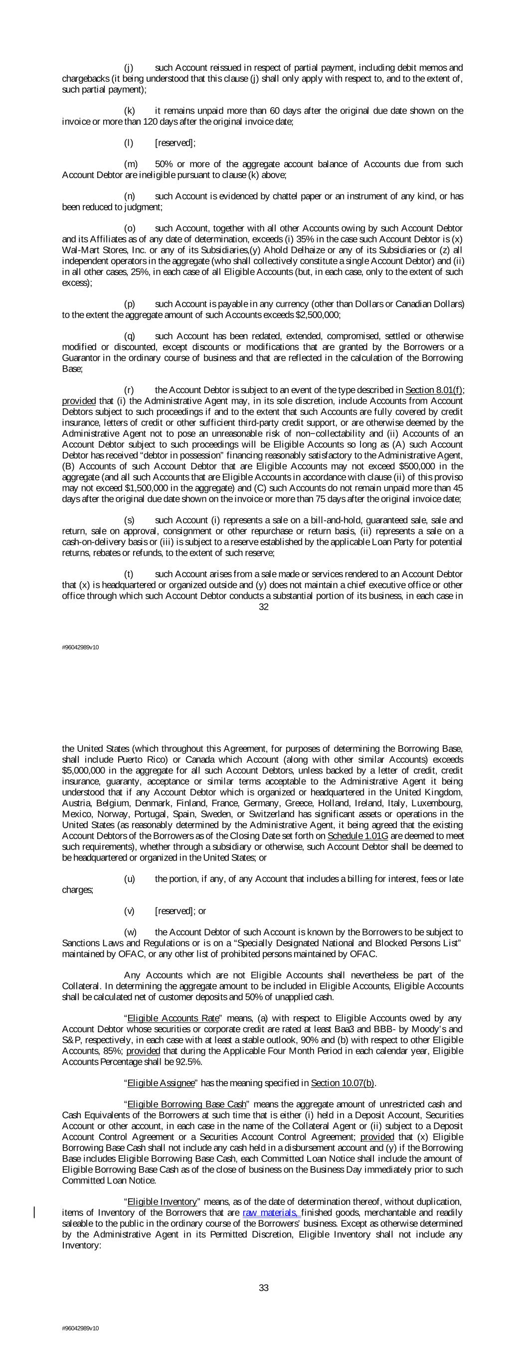 (j) such Account reissued in respect of partial payment, including debit memos and chargebacks (it being understood that this clause (j) shall only apply with respect to, and to the extent of, such partial payment); (k) it remains unpaid more than 60 days after the original due date shown on the invoice or more than 120 days after the original invoice date; (l) [reserved]; (m) 50% or more of the aggregate account balance of Accounts due from such Account Debtor are ineligible pursuant to clause (k) above; (n) such Account is evidenced by chattel paper or an instrument of any kind, or has been reduced to judgment; (o) such Account, together with all other Accounts owing by such Account Debtor and its Affiliates as of any date of determination, exceeds (i) 35% in the case such Account Debtor is (x) Wal-Mart Stores, Inc. or any of its Subsidiaries,(y) Ahold Delhaize or any of its Subsidiaries or (z) all independent operators in the aggregate (who shall collectively constitute a single Account Debtor) and (ii) in all other cases, 25%, in each case of all Eligible Accounts (but, in each case, only to the extent of such excess); (p) such Account is payable in any currency (other than Dollars or Canadian Dollars) to the extent the aggregate amount of such Accounts exceeds $2,500,000; (q) such Account has been redated, extended, compromised, settled or otherwise modified or discounted, except discounts or modifications that are granted by the Borrowers or a Guarantor in the ordinary course of business and that are reflected in the calculation of the Borrowing Base; (r) the Account Debtor is subject to an event of the type described in Section 8.01(f); provided that (i) the Administrative Agent may, in its sole discretion, include Accounts from Account Debtors subject to such proceedings if and to the extent that such Accounts are fully covered by credit insurance, letters of credit or other sufficient third-party credit support, or are otherwise deemed by the Administrative Agent not to pose an unreasonable risk of non−collectability and (ii) Accounts of an Account Debtor subject to such proceedings will be Eligible Accounts so long as (A) such Account Debtor has received “debtor in possession” financing reasonably satisfactory to the Administrative Agent, (B) Accounts of such Account Debtor that are Eligible Accounts may not exceed $500,000 in the aggregate (and all such Accounts that are Eligible Accounts in accordance with clause (ii) of this proviso may not exceed $1,500,000 in the aggregate) and (C) such Accounts do not remain unpaid more than 45 days after the original due date shown on the invoice or more than 75 days after the original invoice date; (s) such Account (i) represents a sale on a bill-and-hold, guaranteed sale, sale and return, sale on approval, consignment or other repurchase or return basis, (ii) represents a sale on a cash-on-delivery basis or (iii) is subject to a reserve established by the applicable Loan Party for potential returns, rebates or refunds, to the extent of such reserve; (t) such Account arises from a sale made or services rendered to an Account Debtor that (x) is headquartered or organized outside and (y) does not maintain a chief executive office or other office through which such Account Debtor conducts a substantial portion of its business, in each case in 32 #96042989v10 the United States (which throughout this Agreement, for purposes of determining the Borrowing Base, shall include Puerto Rico) or Canada which Account (along with other similar Accounts) exceeds $5,000,000 in the aggregate for all such Account Debtors, unless backed by a letter of credit, credit insurance, guaranty, acceptance or similar terms acceptable to the Administrative Agent it being understood that if any Account Debtor which is organized or headquartered in the United Kingdom, Austria, Belgium, Denmark, Finland, France, Germany, Greece, Holland, Ireland, Italy, Luxembourg, Mexico, Norway, Portugal, Spain, Sweden, or Switzerland has significant assets or operations in the United States (as reasonably determined by the Administrative Agent, it being agreed that the existing Account Debtors of the Borrowers as of the Closing Date set forth on Schedule 1.01G are deemed to meet such requirements), whether through a subsidiary or otherwise, such Account Debtor shall be deemed to be headquartered or organized in the United States; or (u) the portion, if any, of any Account that includes a billing for interest, fees or late charges; (v) [reserved]; or (w) the Account Debtor of such Account is known by the Borrowers to be subject to Sanctions Laws and Regulations or is on a “Specially Designated National and Blocked Persons List” maintained by OFAC, or any other list of prohibited persons maintained by OFAC. Any Accounts which are not Eligible Accounts shall nevertheless be part of the Collateral. In determining the aggregate amount to be included in Eligible Accounts, Eligible Accounts shall be calculated net of customer deposits and 50% of unapplied cash. “Eligible Accounts Rate” means, (a) with respect to Eligible Accounts owed by any Account Debtor whose securities or corporate credit are rated at least Baa3 and BBB- by Moody’s and S&P, respectively, in each case with at least a stable outlook, 90% and (b) with respect to other Eligible Accounts, 85%; provided that during the Applicable Four Month Period in each calendar year, Eligible Accounts Percentage shall be 92.5%. “Eligible Assignee” has the meaning specified in Section 10.07(b). “Eligible Borrowing Base Cash” means the aggregate amount of unrestricted cash and Cash Equivalents of the Borrowers at such time that is either (i) held in a Deposit Account, Securities Account or other account, in each case in the name of the Collateral Agent or (ii) subject to a Deposit Account Control Agreement or a Securities Account Control Agreement; provided that (x) Eligible Borrowing Base Cash shall not include any 