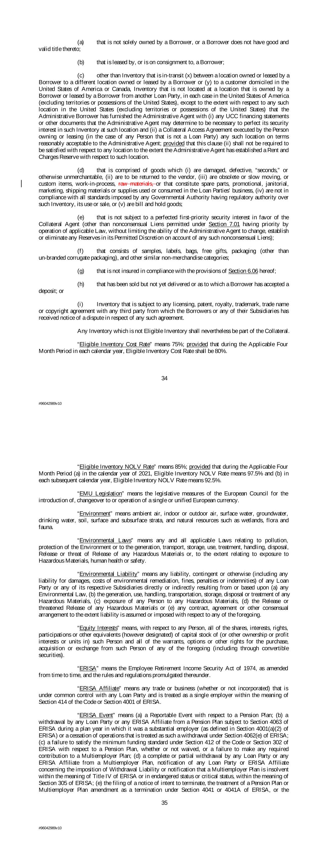 (a) that is not solely owned by a Borrower, or a Borrower does not have good and valid title thereto; (b) that is leased by, or is on consignment to, a Borrower; (c) other than Inventory that is in-transit (x) between a location owned or leased by a Borrower to a different location owned or leased by a Borrower or (y) to a customer domiciled in the United States of America or Canada, Inventory that is not located at a location that is owned by a Borrower or leased by a Borrower from another Loan Party, in each case in the United States of America (excluding territories or possessions of the United States), except to the extent with respect to any such location in the United States (excluding territories or possessions of the United States) that the Administrative Borrower has furnished the Administrative Agent with (i) any UCC financing statements or other documents that the Administrative Agent may determine to be necessary to perfect its security interest in such Inventory at such location and (ii) a Collateral Access Agreement executed by the Person owning or leasing (in the case of any Person that is not a Loan Party) any such location on terms reasonably acceptable to the Administrative Agent; provided that this clause (ii) shall not be required to be satisfied with respect to any location to the extent the Administrative Agent has established a Rent and Charges Reserve with respect to such location. (d) that is comprised of goods which (i) are damaged, defective, “seconds,” or otherwise unmerchantable, (ii) are to be returned to the vendor, (iii) are obsolete or slow moving, or custom items, work-in-process, raw materials, or that constitute spare parts, promotional, janitorial, marketing, shipping materials or supplies used or consumed in the Loan Parties’ business, (iv) are not in compliance with all standards imposed by any Governmental Authority having regulatory authority over such Inventory, its use or sale, or (v) are bill and hold goods; (e) that is not subject to a perfected first-priority security interest in favor of the Collateral Agent (other than nonconsensual Liens permitted under Section 7.01 having priority by operation of applicable Law, without limiting the ability of the Administrative Agent to change, establish or eliminate any Reserves in its Permitted Discretion on account of any such nonconsensual Liens); (f) that consists of samples, labels, bags, free gifts, packaging (other than un-branded corrugate packaging), and other similar non-merchandise categories; (g) that is not insured in compliance with the provisions of Section 6.06 hereof; (h) that has been sold but not yet delivered or as to which a Borrower has accepted a deposit; or (i) Inventory that is subject to any licensing, patent, royalty, trademark, trade name or copyright agreement with any third party from which the Borrowers or any of their Subsidiaries has received notice of a dispute in respect of any such agreement. Any Inventory which is not Eligible Inventory shall nevertheless be part of the Collateral. “Eligible Inventory Cost Rate” means 75%; provided that during the Applicable Four Month Period in each calendar year, Eligible Inventory Cost Rate shall be 80%. 34 #96042989v10 “Eligible Inventory NOLV Rate” means 85%; provided that during the Applicable Four Month Period (a) in the calendar year of 2021, Eligible Inventory NOLV Rate means 97.5% and (b) in each subsequent calendar year, Eligible Inventory NOLV Rate means 92.5%. “EMU Legislation” means the legislative measures of the European Council for the introduction of, changeover to or operation of a single or unified European currency. “Environment” means ambient air, indoor or outdoor air, surface water, groundwater, drinking water, soil, surface and subsurface strata, and natural resources such as wetlands, flora and fauna. “Environmental Laws” means any and all applicable Laws relating to pollution, protection of the Environment or to the generation, transport, storage, use, treatment, handling, disposal, Release or threat of Release of any Hazardous Materials or, to the extent relating to exposure to Hazardous Materials, human health or safety. “Environmental Liability” means any liability, contingent or otherwise (including any liability for damages, costs of environmental remediation, fines, penalties or indemnities) of any Loan Party or any of its respective Subsidiaries directly or indirectly resulting from or based upon (a) any Environmental Law, (b) the generation, use, handling, transportation, storage, disposal or treatment of any Hazardous Materials, (c) exposure of any Person to any Hazardous Materials, (d) the Release or threatened Release of any Hazardous Materials or (e) any contract, agreement or other consensual arrangement to the extent liability is assumed or imposed with respect to any of the foregoing. “Equity Interests” means, with respect to any Person, all of the shares, interests, rights, participations or other equivalents (however designated) of capital stock of (or other ownership or profit interests or units in) such Person and all of the warrants, options or other rights for the purchase, acquisition or exchange from such Person of any of the foregoing (including through convertible securities). “ERISA” means the Employee Retirement Income Security Act of 1974, as amended from time to time, and the rules and regulations promulgated thereunder. “ERISA Affiliate” means any trade or business (whether or not incorporated) that is under common control with any Loan Party and is treated as a single employer within the meaning of Section 414 of the Code or Section 4001 of ERISA. “ERISA Event” means (a) a Reportable Event with respect to a Pension Plan; (b) a withdrawal by any Loan Party or any ERISA Affiliate from a Pension Plan subject to Section 4063 of ERISA during a plan year in which it was a substantial employer (as defined in Section 4001(a)(2) of ERISA) o