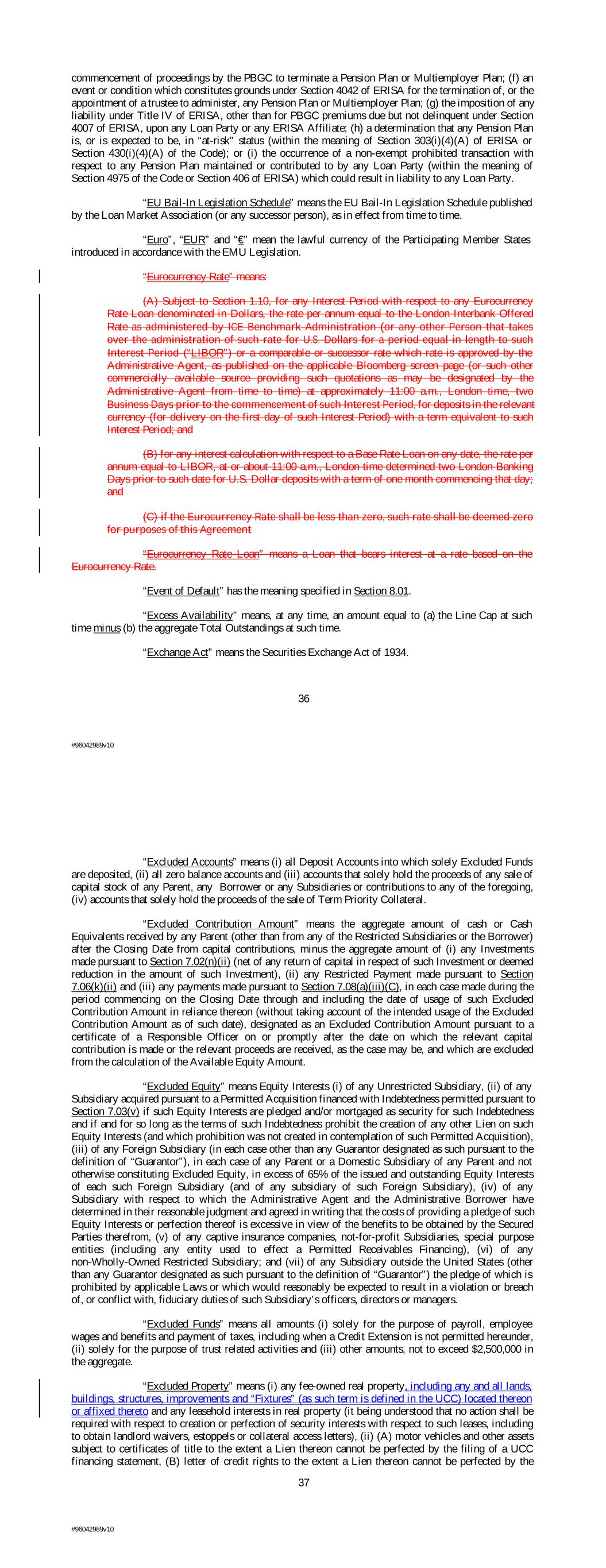 commencement of proceedings by the PBGC to terminate a Pension Plan or Multiemployer Plan; (f) an event or condition which constitutes grounds under Section 4042 of ERISA for the termination of, or the appointment of a trustee to administer, any Pension Plan or Multiemployer Plan; (g) the imposition of any liability under Title IV of ERISA, other than for PBGC premiums due but not delinquent under Section 4007 of ERISA, upon any Loan Party or any ERISA Affiliate; (h) a determination that any Pension Plan is, or is expected to be, in “at-risk” status (within the meaning of Section 303(i)(4)(A) of ERISA or Section 430(i)(4)(A) of the Code); or (i) the occurrence of a non-exempt prohibited transaction with respect to any Pension Plan maintained or contributed to by any Loan Party (within the meaning of Section 4975 of the Code or Section 406 of ERISA) which could result in liability to any Loan Party. “EU Bail-In Legislation Schedule” means the EU Bail-In Legislation Schedule published by the Loan Market Association (or any successor person), as in effect from time to time. “Euro”, “EUR” and “€” mean the lawful currency of the Participating Member States introduced in accordance with the EMU Legislation. “Eurocurrency Rate” means: (A) Subject to Section 1.10, for any Interest Period with respect to any Eurocurrency Rate Loan denominated in Dollars, the rate per annum equal to the London Interbank Offered Rate as administered by ICE Benchmark Administration (or any other Person that takes over the administration of such rate for U.S. Dollars for a period equal in length to such Interest Period (“LIBOR”) or a comparable or successor rate which rate is approved by the Administrative Agent, as published on the applicable Bloomberg screen page (or such other commercially available source providing such quotations as may be designated by the Administrative Agent from time to time) at approximately 11:00 a.m., London time, two Business Days prior to the commencement of such Interest Period, for deposits in the relevant currency (for delivery on the first day of such Interest Period) with a term equivalent to such Interest Period; and (B) for any interest calculation with respect to a Base Rate Loan on any date, the rate per annum equal to LIBOR, at or about 11:00 a.m., London time determined two London Banking Days prior to such date for U.S. Dollar deposits with a term of one month commencing that day; and (C) if the Eurocurrency Rate shall be less than zero, such rate shall be deemed zero for purposes of this Agreement “Eurocurrency Rate Loan” means a Loan that bears interest at a rate based on the Eurocurrency Rate. “Event of Default” has the meaning specified in Section 8.01. “Excess Availability” means, at any time, an amount equal to (a) the Line Cap at such time minus (b) the aggregate Total Outstandings at such time. “Exchange Act” means the Securities Exchange Act of 1934. 36 #96042989v10 “Excluded Accounts” means (i) all Deposit Accounts into which solely Excluded Funds are deposited, (ii) all zero balance accounts and (iii) accounts that solely hold the proceeds of any sale of capital stock of any Parent, any Borrower or any Subsidiaries or contributions to any of the foregoing, (iv) accounts that solely hold the proceeds of the sale of Term Priority Collateral. “Excluded Contribution Amount” means the aggregate amount of cash or Cash Equivalents received by any Parent (other than from any of the Restricted Subsidiaries or the Borrower) after the Closing Date from capital contributions, minus the aggregate amount of (i) any Investments made pursuant to Section 7.02(n)(ii) (net of any return of capital in respect of such Investment or deemed reduction in the amount of such Investment), (ii) any Restricted Payment made pursuant to Section 7.06(k)(ii) and (iii) any payments made pursuant to Section 7.08(a)(iii)(C), in each case made during the period commencing on the Closing Date through and including the date of usage of such Excluded Contribution Amount in reliance thereon (without taking account of the intended usage of the Excluded Contribution Amount as of such date), designated as an Excluded Contribution Amount pursuant to a certificate of a Responsible Officer on or promptly after the date on which the relevant capital contribution is made or the relevant proceeds are received, as the case may be, and which are excluded from the calculation of the Available Equity Amount. “Excluded Equity” means Equity Interests (i) of any Unrestricted Subsidiary, (ii) of any Subsidiary acquired pursuant to a Permitted Acquisition financed with Indebtedness permitted pursuant to Section 7.03(v) if such Equity Interests are pledged and/or mortgaged as security for such Indebtedness and if and for so long as the terms of such Indebtedness prohibit the creation of any other Lien on such Equity Interests (and which prohibition was not created in contemplation of such Permitted Acquisition), (iii) of any Foreign Subsidiary (in each case other than any Guarantor designated as such pursuant to the definition of “Guarantor”), in each case of any Parent or a Domestic Subsidiary of any Parent and not otherwise constituting Excluded Equity, in excess of 65% of the issued and outstanding Equity Interests of each such Foreign Subsidiary (and of any subsidiary of such Foreign Subsidiary), (iv) of any Subsidiary with respect to which the Administrative Agent and the Administrative Borrower have determined in their reasonable judgment and agreed in writing that the costs of providing a pledge of such Equity Interests or perfection thereof is excessive in view of the benefits to be obtained by the Secured Parties therefrom, (v) of any captive insurance companies, not-for-profit Subsidiaries, special purpose entities (including any entity used to effect a Permitted Receivables Financing), (vi) of any non-Wholly-Owned Restricted Subsidiary; and (vii) of a