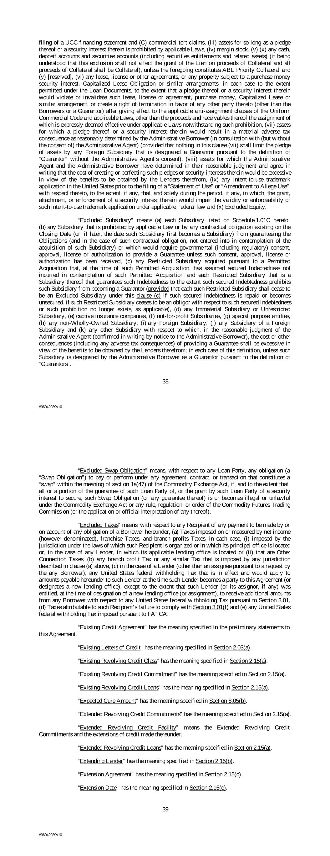 filing of a UCC financing statement and (C) commercial tort claims, (iii) assets for so long as a pledge thereof or a security interest therein is prohibited by applicable Laws, (iv) margin stock, (v) (x) any cash, deposit accounts and securities accounts (including securities entitlements and related assets) (it being understood that this exclusion shall not affect the grant of the Lien on proceeds of Collateral and all proceeds of Collateral shall be Collateral), unless the foregoing constitutes ABL Priority Collateral and (y) [reserved], (vi) any lease, license or other agreements, or any property subject to a purchase money security interest, Capitalized Lease Obligation or similar arrangements, in each case to the extent permitted under the Loan Documents, to the extent that a pledge thereof or a security interest therein would violate or invalidate such lease, license or agreement, purchase money, Capitalized Lease or similar arrangement, or create a right of termination in favor of any other party thereto (other than the Borrowers or a Guarantor) after giving effect to the applicable anti-assignment clauses of the Uniform Commercial Code and applicable Laws, other than the proceeds and receivables thereof the assignment of which is expressly deemed effective under applicable Laws notwithstanding such prohibition, (vii) assets for which a pledge thereof or a security interest therein would result in a material adverse tax consequence as reasonably determined by the Administrative Borrower (in consultation with (but without the consent of) the Administrative Agent) (provided that nothing in this clause (vii) shall limit the pledge of assets by any Foreign Subsidiary that is designated a Guarantor pursuant to the definition of “Guarantor” without the Administrative Agent’s consent), (viii) assets for which the Administrative Agent and the Administrative Borrower have determined in their reasonable judgment and agree in writing that the cost of creating or perfecting such pledges or security interests therein would be excessive in view of the benefits to be obtained by the Lenders therefrom, (ix) any intent-to-use trademark application in the United States prior to the filing of a “Statement of Use” or “Amendment to Allege Use” with respect thereto, to the extent, if any, that, and solely during the period, if any, in which, the grant, attachment, or enforcement of a security interest therein would impair the validity or enforceability of such intent-to-use trademark application under applicable Federal law and (x) Excluded Equity. “Excluded Subsidiary” means (a) each Subsidiary listed on Schedule 1.01C hereto, (b) any Subsidiary that is prohibited by applicable Law or by any contractual obligation existing on the Closing Date (or, if later, the date such Subsidiary first becomes a Subsidiary) from guaranteeing the Obligations (and in the case of such contractual obligation, not entered into in contemplation of the acquisition of such Subsidiary) or which would require governmental (including regulatory) consent, approval, license or authorization to provide a Guarantee unless such consent, approval, license or authorization has been received, (c) any Restricted Subsidiary acquired pursuant to a Permitted Acquisition that, at the time of such Permitted Acquisition, has assumed secured Indebtedness not incurred in contemplation of such Permitted Acquisition and each Restricted Subsidiary that is a Subsidiary thereof that guarantees such Indebtedness to the extent such secured Indebtedness prohibits such Subsidiary from becoming a Guarantor (provided that each such Restricted Subsidiary shall cease to be an Excluded Subsidiary under this clause (c) if such secured Indebtedness is repaid or becomes unsecured, if such Restricted Subsidiary ceases to be an obligor with respect to such secured Indebtedness or such prohibition no longer exists, as applicable), (d) any Immaterial Subsidiary or Unrestricted Subsidiary, (e) captive insurance companies, (f) not-for-profit Subsidiaries, (g) special purpose entities, (h) any non-Wholly-Owned Subsidiary, (i) any Foreign Subsidiary, (j) any Subsidiary of a Foreign Subsidiary and (k) any other Subsidiary with respect to which, in the reasonable judgment of the Administrative Agent (confirmed in writing by notice to the Administrative Borrower), the cost or other consequences (including any adverse tax consequences) of providing a Guarantee shall be excessive in view of the benefits to be obtained by the Lenders therefrom; in each case of this definition, unless such Subsidiary is designated by the Administrative Borrower as a Guarantor pursuant to the definition of “Guarantors”. 38 #96042989v10 “Excluded Swap Obligation” means, with respect to any Loan Party, any obligation (a “Swap Obligation”) to pay or perform under any agreement, contract, or transaction that constitutes a “swap” within the meaning of section 1a(47) of the Commodity Exchange Act, if, and to the extent that, all or a portion of the guarantee of such Loan Party of, or the grant by such Loan Party of a security interest to secure, such Swap Obligation (or any guarantee thereof) is or becomes illegal or unlawful under the Commodity Exchange Act or any rule, regulation, or order of the Commodity Futures Trading Commission (or the application or official interpretation of any thereof). “Excluded Taxes” means, with respect to any Recipient of any payment to be made by or on account of any obligation of a Borrower hereunder, (a) Taxes imposed on or measured by net income (however denominated), franchise Taxes, and branch profits Taxes, in each case, (i) imposed by the jurisdiction under the laws of which such Recipient is organized or in which its principal office is located or, in the case of any Lender, in which its applicable lending office is located or (ii) that are Other Connection Taxes, (b) any branch profit Tax or any similar Tax that is imp
