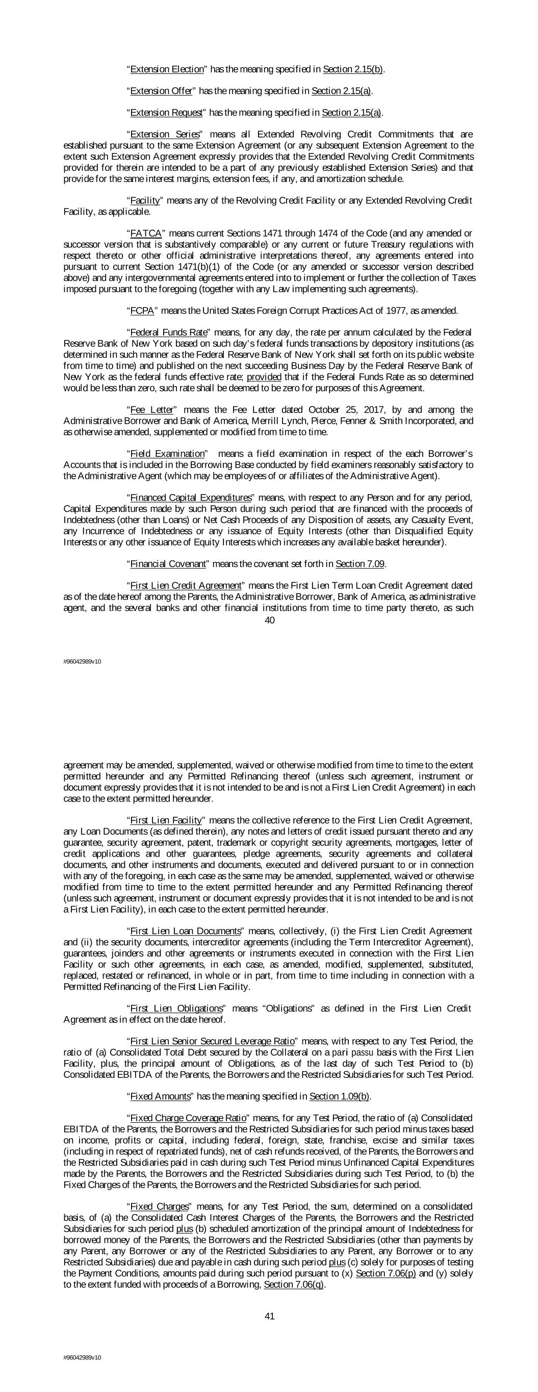“Extension Election” has the meaning specified in Section 2.15(b). “Extension Offer” has the meaning specified in Section 2.15(a). “Extension Request” has the meaning specified in Section 2.15(a). “Extension Series” means all Extended Revolving Credit Commitments that are established pursuant to the same Extension Agreement (or any subsequent Extension Agreement to the extent such Extension Agreement expressly provides that the Extended Revolving Credit Commitments provided for therein are intended to be a part of any previously established Extension Series) and that provide for the same interest margins, extension fees, if any, and amortization schedule. “Facility” means any of the Revolving Credit Facility or any Extended Revolving Credit Facility, as applicable. “FATCA” means current Sections 1471 through 1474 of the Code (and any amended or successor version that is substantively comparable) or any current or future Treasury regulations with respect thereto or other official administrative interpretations thereof, any agreements entered into pursuant to current Section 1471(b)(1) of the Code (or any amended or successor version described above) and any intergovernmental agreements entered into to implement or further the collection of Taxes imposed pursuant to the foregoing (together with any Law implementing such agreements). “FCPA” means the United States Foreign Corrupt Practices Act of 1977, as amended. “Federal Funds Rate” means, for any day, the rate per annum calculated by the Federal Reserve Bank of New York based on such day’s federal funds transactions by depository institutions (as determined in such manner as the Federal Reserve Bank of New York shall set forth on its public website from time to time) and published on the next succeeding Business Day by the Federal Reserve Bank of New York as the federal funds effective rate; provided that if the Federal Funds Rate as so determined would be less than zero, such rate shall be deemed to be zero for purposes of this Agreement. “Fee Letter” means the Fee Letter dated October 25, 2017, by and among the Administrative Borrower and Bank of America, Merrill Lynch, Pierce, Fenner & Smith Incorporated, and as otherwise amended, supplemented or modified from time to time. “Field Examination” means a field examination in respect of the each Borrower’s Accounts that is included in the Borrowing Base conducted by field examiners reasonably satisfactory to the Administrative Agent (which may be employees of or affiliates of the Administrative Agent). “Financed Capital Expenditures” means, with respect to any Person and for any period, Capital Expenditures made by such Person during such period that are financed with the proceeds of Indebtedness (other than Loans) or Net Cash Proceeds of any Disposition of assets, any Casualty Event, any Incurrence of Indebtedness or any issuance of Equity Interests (other than Disqualified Equity Interests or any other issuance of Equity Interests which increases any available basket hereunder). “Financial Covenant” means the covenant set forth in Section 7.09. “First Lien Credit Agreement” means the First Lien Term Loan Credit Agreement dated as of the date hereof among the Parents, the Administrative Borrower, Bank of America, as administrative agent, and the several banks and other financial institutions from time to time party thereto, as such 40 #96042989v10 agreement may be amended, supplemented, waived or otherwise modified from time to time to the extent permitted hereunder and any Permitted Refinancing thereof (unless such agreement, instrument or document expressly provides that it is not intended to be and is not a First Lien Credit Agreement) in each case to the extent permitted hereunder. “First Lien Facility” means the collective reference to the First Lien Credit Agreement, any Loan Documents (as defined therein), any notes and letters of credit issued pursuant thereto and any guarantee, security agreement, patent, trademark or copyright security agreements, mortgages, letter of credit applications and other guarantees, pledge agreements, security agreements and collateral documents, and other instruments and documents, executed and delivered pursuant to or in connection with any of the foregoing, in each case as the same may be amended, supplemented, waived or otherwise modified from time to time to the extent permitted hereunder and any Permitted Refinancing thereof (unless such agreement, instrument or document expressly provides that it is not intended to be and is not a First Lien Facility), in each case to the extent permitted hereunder. “First Lien Loan Documents” means, collectively, (i) the First Lien Credit Agreement and (ii) the security documents, intercreditor agreements (including the Term Intercreditor Agreement), guarantees, joinders and other agreements or instruments executed in connection with the First Lien Facility or such other agreements, in each case, as amended, modified, supplemented, substituted, replaced, restated or refinanced, in whole or in part, from time to time including in connection with a Permitted Refinancing of the First Lien Facility. “First Lien Obligations” means “Obligations” as defined in the First Lien Credit Agreement as in effect on the date hereof. “First Lien Senior Secured Leverage Ratio” means, with respect to any Test Period, the ratio of (a) Consolidated Total Debt secured by the Collateral on a pari passu basis with the First Lien Facility, plus, the principal amount of Obligations, as of the last day of such Test Period to (b) Consolidated EBITDA of the Parents, the Borrowers and the Restricted Subsidiaries for such Test Period. “Fixed Amounts” has the meaning specified in Section 1.09(b). “Fixed Charge Coverage Ratio” means, for any Test Period, the ratio of (a) Consolidated EBITDA of the Parents, the Borrowers and the Restricted Subsidiaries for such