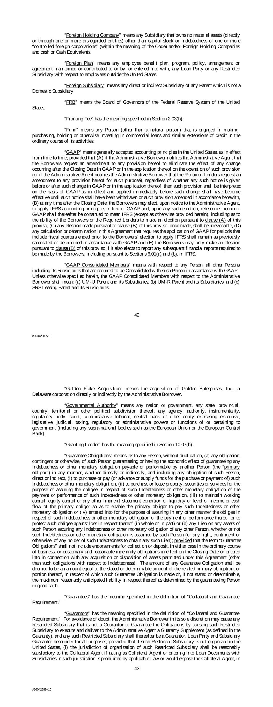 “Foreign Holding Company” means any Subsidiary that owns no material assets (directly or through one or more disregarded entities) other than capital stock or Indebtedness of one or more “controlled foreign corporations” (within the meaning of the Code) and/or Foreign Holding Companies and cash or Cash Equivalents. “Foreign Plan” means any employee benefit plan, program, policy, arrangement or agreement maintained or contributed to or by, or entered into with, any Loan Party or any Restricted Subsidiary with respect to employees outside the United States. “Foreign Subsidiary” means any direct or indirect Subsidiary of any Parent which is not a Domestic Subsidiary. “FRB” means the Board of Governors of the Federal Reserve System of the United States. “Fronting Fee” has the meaning specified in Section 2.03(h). “Fund” means any Person (other than a natural person) that is engaged in making, purchasing, holding or otherwise investing in commercial loans and similar extensions of credit in the ordinary course of its activities. “GAAP” means generally accepted accounting principles in the United States, as in effect from time to time; provided that (A) if the Administrative Borrower notifies the Administrative Agent that the Borrowers request an amendment to any provision hereof to eliminate the effect of any change occurring after the Closing Date in GAAP or in the application thereof on the operation of such provision (or if the Administrative Agent notifies the Administrative Borrower that the Required Lenders request an amendment to any provision hereof for such purpose), regardless of whether any such notice is given before or after such change in GAAP or in the application thereof, then such provision shall be interpreted on the basis of GAAP as in effect and applied immediately before such change shall have become effective until such notice shall have been withdrawn or such provision amended in accordance herewith, (B) at any time after the Closing Date, the Borrowers may elect, upon notice to the Administrative Agent, to apply IFRS accounting principles in lieu of GAAP and, upon any such election, references herein to GAAP shall thereafter be construed to mean IFRS (except as otherwise provided herein), including as to the ability of the Borrowers or the Required Lenders to make an election pursuant to clause (A) of this proviso, (C) any election made pursuant to clause (B) of this proviso, once made, shall be irrevocable, (D) any calculation or determination in this Agreement that requires the application of GAAP for periods that include fiscal quarters ended prior to the Borrowers’ election to apply IFRS shall remain as previously calculated or determined in accordance with GAAP and (E) the Borrowers may only make an election pursuant to clause (B) of this proviso if it also elects to report any subsequent financial reports required to be made by the Borrowers, including pursuant to Sections 6.01(a) and (b), in IFRS. “GAAP Consolidated Members” means with respect to any Person, all other Persons including its Subsidiaries that are required to be Consolidated with such Person in accordance with GAAP. Unless otherwise specified herein, the GAAP Consolidated Members with respect to the Administrative Borrower shall mean: (a) UM-U Parent and its Subsidiaries, (b) UM-R Parent and its Subsidiaries, and (c) SRS Leasing Parent and its Subsidiaries. 42 #96042989v10 “Golden Flake Acquisition” means the acquisition of Golden Enterprises, Inc., a Delaware corporation directly or indirectly by the Administrative Borrower. “Governmental Authority” means any nation or government, any state, provincial, country, territorial or other political subdivision thereof, any agency, authority, instrumentality, regulatory body, court, administrative tribunal, central bank or other entity exercising executive, legislative, judicial, taxing, regulatory or administrative powers or functions of or pertaining to government (including any supra-national bodies such as the European Union or the European Central Bank). “Granting Lender” has the meaning specified in Section 10.07(h). “Guarantee Obligations” means, as to any Person, without duplication, (a) any obligation, contingent or otherwise, of such Person guaranteeing or having the economic effect of guaranteeing any Indebtedness or other monetary obligation payable or performable by another Person (the “primary obligor”) in any manner, whether directly or indirectly, and including any obligation of such Person, direct or indirect, (i) to purchase or pay (or advance or supply funds for the purchase or payment of) such Indebtedness or other monetary obligation, (ii) to purchase or lease property, securities or services for the purpose of assuring the obligee in respect of such Indebtedness or other monetary obligation of the payment or performance of such Indebtedness or other monetary obligation, (iii) to maintain working capital, equity capital or any other financial statement condition or liquidity or level of income or cash flow of the primary obligor so as to enable the primary obligor to pay such Indebtedness or other monetary obligation or (iv) entered into for the purpose of assuring in any other manner the obligee in respect of such Indebtedness or other monetary obligation of the payment or performance thereof or to protect such obligee against loss in respect thereof (in whole or in part) or (b) any Lien on any assets of such Person securing any Indebtedness or other monetary obligation of any other Person, whether or not such Indebtedness or other monetary obligation is assumed by such Person (or any right, contingent or otherwise, of any holder of such Indebtedness to obtain any such Lien); provided that the term “Guarantee Obligations” shall not include endorsements for collection or deposit, in either case in the ordinary course of business, or customary and reasonable indemnity oblig