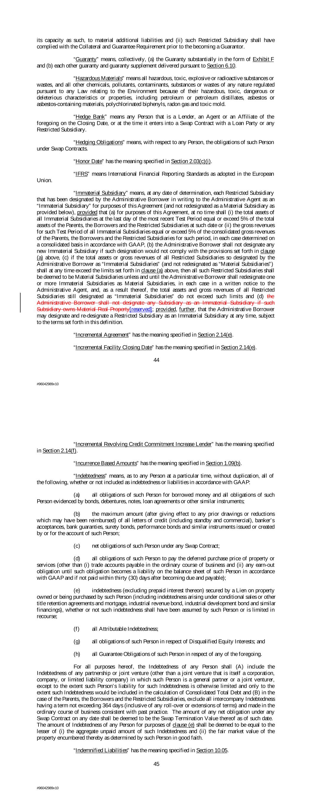 its capacity as such, to material additional liabilities and (ii) such Restricted Subsidiary shall have complied with the Collateral and Guarantee Requirement prior to the becoming a Guarantor. “Guaranty” means, collectively, (a) the Guaranty substantially in the form of Exhibit F and (b) each other guaranty and guaranty supplement delivered pursuant to Section 6.10. “Hazardous Materials” means all hazardous, toxic, explosive or radioactive substances or wastes, and all other chemicals, pollutants, contaminants, substances or wastes of any nature regulated pursuant to any Law relating to the Environment because of their hazardous, toxic, dangerous or deleterious characteristics or properties, including petroleum or petroleum distillates, asbestos or asbestos-containing materials, polychlorinated biphenyls, radon gas and toxic mold. “Hedge Bank” means any Person that is a Lender, an Agent or an Affiliate of the foregoing on the Closing Date, or at the time it enters into a Swap Contract with a Loan Party or any Restricted Subsidiary. “Hedging Obligations” means, with respect to any Person, the obligations of such Person under Swap Contracts. “Honor Date” has the meaning specified in Section 2.03(c)(i). “IFRS” means International Financial Reporting Standards as adopted in the European Union. “Immaterial Subsidiary” means, at any date of determination, each Restricted Subsidiary that has been designated by the Administrative Borrower in writing to the Administrative Agent as an “Immaterial Subsidiary” for purposes of this Agreement (and not redesignated as a Material Subsidiary as provided below), provided that (a) for purposes of this Agreement, at no time shall (i) the total assets of all Immaterial Subsidiaries at the last day of the most recent Test Period equal or exceed 5% of the total assets of the Parents, the Borrowers and the Restricted Subsidiaries at such date or (ii) the gross revenues for such Test Period of all Immaterial Subsidiaries equal or exceed 5% of the consolidated gross revenues of the Parents, the Borrowers and the Restricted Subsidiaries for such period, in each case determined on a consolidated basis in accordance with GAAP, (b) the Administrative Borrower shall not designate any new Immaterial Subsidiary if such designation would not comply with the provisions set forth in clause (a) above, (c) if the total assets or gross revenues of all Restricted Subsidiaries so designated by the Administrative Borrower as “Immaterial Subsidiaries” (and not redesignated as “Material Subsidiaries”) shall at any time exceed the limits set forth in clause (a) above, then all such Restricted Subsidiaries shall be deemed to be Material Subsidiaries unless and until the Administrative Borrower shall redesignate one or more Immaterial Subsidiaries as Material Subsidiaries, in each case in a written notice to the Administrative Agent, and, as a result thereof, the total assets and gross revenues of all Restricted Subsidiaries still designated as “Immaterial Subsidiaries” do not exceed such limits and (d) the Administrative Borrower shall not designate any Subsidiary as an Immaterial Subsidiary if such Subsidiary owns Material Real Property[reserved]; provided, further, that the Administrative Borrower may designate and re-designate a Restricted Subsidiary as an Immaterial Subsidiary at any time, subject to the terms set forth in this definition. “Incremental Agreement” has the meaning specified in Section 2.14(e). “Incremental Facility Closing Date” has the meaning specified in Section 2.14(e). 44 #96042989v10 “Incremental Revolving Credit Commitment Increase Lender” has the meaning specified in Section 2.14(f). “Incurrence Based Amounts” has the meaning specified in Section 1.09(b). “Indebtedness” means, as to any Person at a particular time, without duplication, all of the following, whether or not included as indebtedness or liabilities in accordance with GAAP: (a) all obligations of such Person for borrowed money and all obligations of such Person evidenced by bonds, debentures, notes, loan agreements or other similar instruments; (b) the maximum amount (after giving effect to any prior drawings or reductions which may have been reimbursed) of all letters of credit (including standby and commercial), banker’s acceptances, bank guaranties, surety bonds, performance bonds and similar instruments issued or created by or for the account of such Person; (c) net obligations of such Person under any Swap Contract; (d) all obligations of such Person to pay the deferred purchase price of property or services (other than (i) trade accounts payable in the ordinary course of business and (ii) any earn-out obligation until such obligation becomes a liability on the balance sheet of such Person in accordance with GAAP and if not paid within thirty (30) days after becoming due and payable); (e) indebtedness (excluding prepaid interest thereon) secured by a Lien on property owned or being purchased by such Person (including indebtedness arising under conditional sales or other title retention agreements and mortgage, industrial revenue bond, industrial development bond and similar financings), whether or not such indebtedness shall have been assumed by such Person or is limited in recourse; (f) all Attributable Indebtedness; (g) all obligations of such Person in respect of Disqualified Equity Interests; and (h) all Guarantee Obligations of such Person in respect of any of the foregoing. For all purposes hereof, the Indebtedness of any Person shall (A) include the Indebtedness of any partnership or joint venture (other than a joint venture that is itself a corporation, company, or limited liability company) in which such Person is a general partner or a joint venturer, except to the extent such Person’s liability for such Indebtedness is otherwise limited and only to the extent such Indebtedness would be included in the calculati