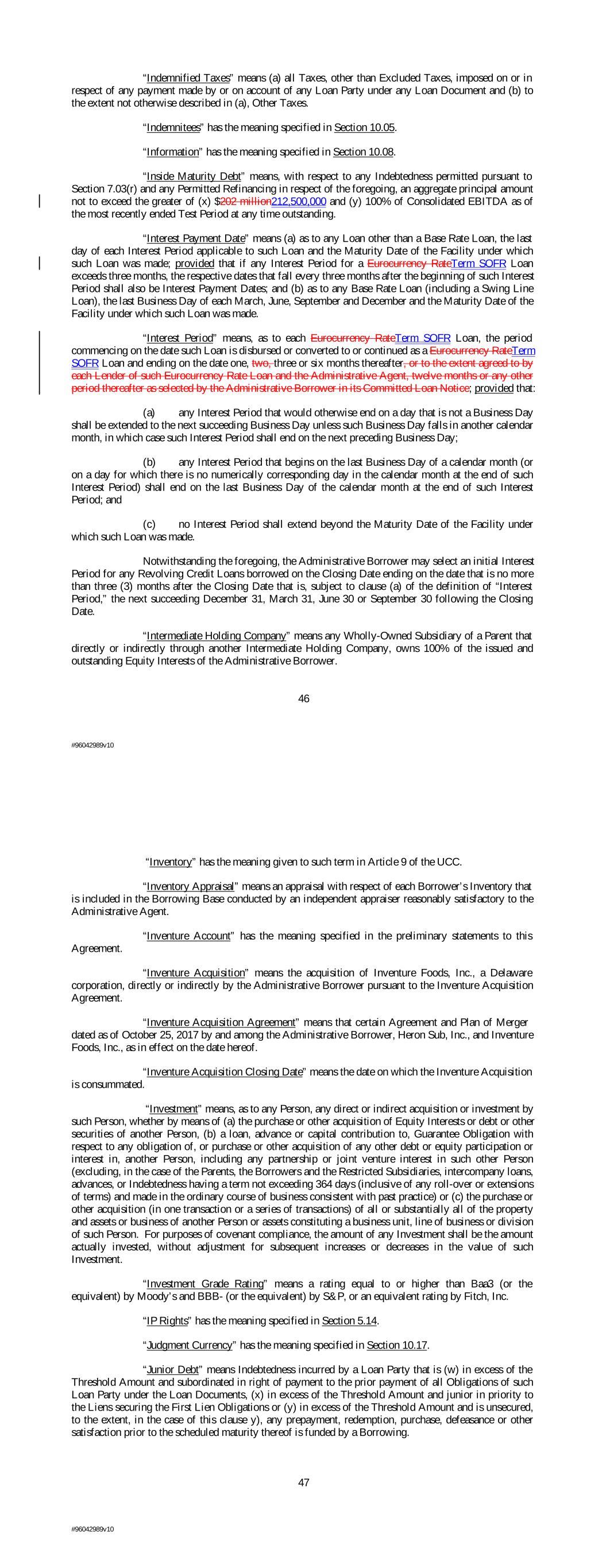 “Indemnified Taxes” means (a) all Taxes, other than Excluded Taxes, imposed on or in respect of any payment made by or on account of any Loan Party under any Loan Document and (b) to the extent not otherwise described in (a), Other Taxes. “Indemnitees” has the meaning specified in Section 10.05. “Information” has the meaning specified in Section 10.08. “Inside Maturity Debt” means, with respect to any Indebtedness permitted pursuant to Section 7.03(r) and any Permitted Refinancing in respect of the foregoing, an aggregate principal amount not to exceed the greater of (x) $202 million212,500,000 and (y) 100% of Consolidated EBITDA as of the most recently ended Test Period at any time outstanding. “Interest Payment Date” means (a) as to any Loan other than a Base Rate Loan, the last day of each Interest Period applicable to such Loan and the Maturity Date of the Facility under which such Loan was made; provided that if any Interest Period for a Eurocurrency RateTerm SOFR Loan exceeds three months, the respective dates that fall every three months after the beginning of such Interest Period shall also be Interest Payment Dates; and (b) as to any Base Rate Loan (including a Swing Line Loan), the last Business Day of each March, June, September and December and the Maturity Date of the Facility under which such Loan was made. “Interest Period” means, as to each Eurocurrency RateTerm SOFR Loan, the period commencing on the date such Loan is disbursed or converted to or continued as a Eurocurrency RateTerm SOFR Loan and ending on the date one, two, three or six months thereafter, or to the extent agreed to by each Lender of such Eurocurrency Rate Loan and the Administrative Agent, twelve months or any other period thereafter as selected by the Administrative Borrower in its Committed Loan Notice; provided that: (a) any Interest Period that would otherwise end on a day that is not a Business Day shall be extended to the next succeeding Business Day unless such Business Day falls in another calendar month, in which case such Interest Period shall end on the next preceding Business Day; (b) any Interest Period that begins on the last Business Day of a calendar month (or on a day for which there is no numerically corresponding day in the calendar month at the end of such Interest Period) shall end on the last Business Day of the calendar month at the end of such Interest Period; and (c) no Interest Period shall extend beyond the Maturity Date of the Facility under which such Loan was made. Notwithstanding the foregoing, the Administrative Borrower may select an initial Interest Period for any Revolving Credit Loans borrowed on the Closing Date ending on the date that is no more than three (3) months after the Closing Date that is, subject to clause (a) of the definition of “Interest Period,” the next succeeding December 31, March 31, June 30 or September 30 following the Closing Date. “Intermediate Holding Company” means any Wholly-Owned Subsidiary of a Parent that directly or indirectly through another Intermediate Holding Company, owns 100% of the issued and outstanding Equity Interests of the Administrative Borrower. 46 #96042989v10 “Inventory” has the meaning given to such term in Article 9 of the UCC. “Inventory Appraisal” means an appraisal with respect of each Borrower’s Inventory that is included in the Borrowing Base conducted by an independent appraiser reasonably satisfactory to the Administrative Agent. “Inventure Account” has the meaning specified in the preliminary statements to this Agreement. “Inventure Acquisition” means the acquisition of Inventure Foods, Inc., a Delaware corporation, directly or indirectly by the Administrative Borrower pursuant to the Inventure Acquisition Agreement. “Inventure Acquisition Agreement” means that certain Agreement and Plan of Merger dated as of October 25, 2017 by and among the Administrative Borrower, Heron Sub, Inc., and Inventure Foods, Inc., as in effect on the date hereof. “Inventure Acquisition Closing Date” means the date on which the Inventure Acquisition is consummated. “Investment” means, as to any Person, any direct or indirect acquisition or investment by such Person, whether by means of (a) the purchase or other acquisition of Equity Interests or debt or other securities of another Person, (b) a loan, advance or capital contribution to, Guarantee Obligation with respect to any obligation of, or purchase or other acquisition of any other debt or equity participation or interest in, another Person, including any partnership or joint venture interest in such other Person (excluding, in the case of the Parents, the Borrowers and the Restricted Subsidiaries, intercompany loans, advances, or Indebtedness having a term not exceeding 364 days (inclusive of any roll-over or extensions of terms) and made in the ordinary course of business consistent with past practice) or (c) the purchase or other acquisition (in one transaction or a series of transactions) of all or substantially all of the property and assets or business of another Person or assets constituting a business unit, line of business or division of such Person. For purposes of covenant compliance, the amount of any Investment shall be the amount actually invested, without adjustment for subsequent increases or decreases in the value of such Investment. “Investment Grade Rating” means a rating equal to or higher than Baa3 (or the equivalent) by Moody’s and BBB- (or the equivalent) by S&P, or an equivalent rating by Fitch, Inc. “IP Rights” has the meaning specified in Section 5.14. “Judgment Currency” has the meaning specified in Section 10.17. “Junior Debt” means Indebtedness incurred by a Loan Party that is (w) in excess of the Threshold Amount and subordinated in right of payment to the prior payment of all Obligations of such Loan Party under the Loan Documents, (x) in excess of the Threshold Amount a