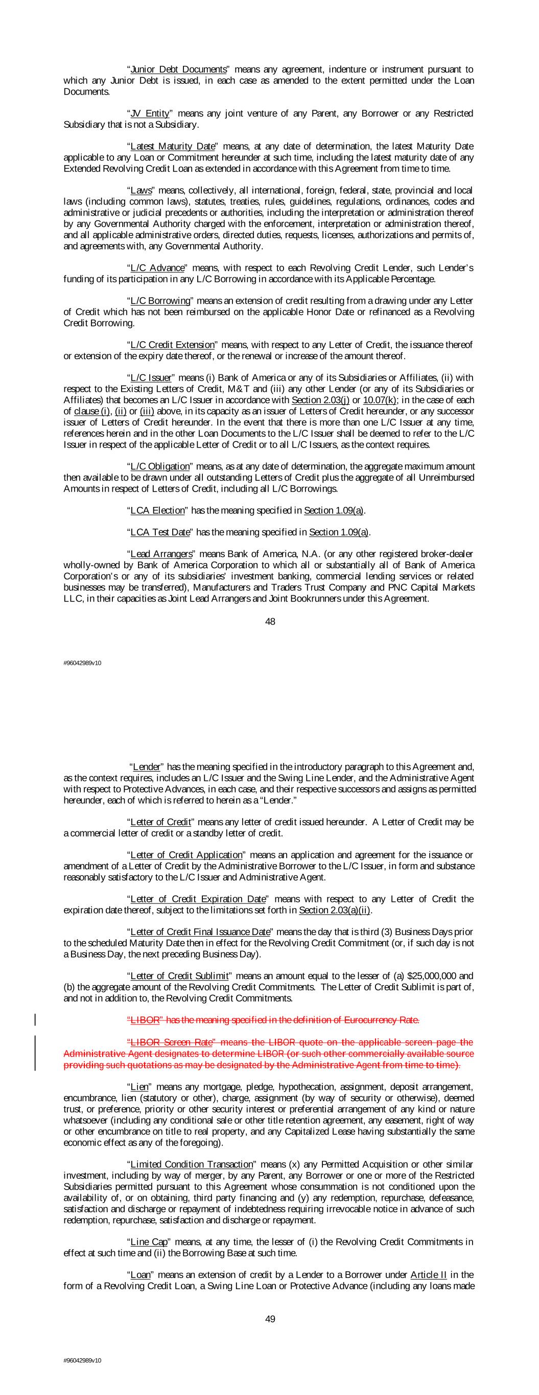 “Junior Debt Documents” means any agreement, indenture or instrument pursuant to which any Junior Debt is issued, in each case as amended to the extent permitted under the Loan Documents. “JV Entity” means any joint venture of any Parent, any Borrower or any Restricted Subsidiary that is not a Subsidiary. “Latest Maturity Date” means, at any date of determination, the latest Maturity Date applicable to any Loan or Commitment hereunder at such time, including the latest maturity date of any Extended Revolving Credit Loan as extended in accordance with this Agreement from time to time. “Laws” means, collectively, all international, foreign, federal, state, provincial and local laws (including common laws), statutes, treaties, rules, guidelines, regulations, ordinances, codes and administrative or judicial precedents or authorities, including the interpretation or administration thereof by any Governmental Authority charged with the enforcement, interpretation or administration thereof, and all applicable administrative orders, directed duties, requests, licenses, authorizations and permits of, and agreements with, any Governmental Authority. “L/C Advance” means, with respect to each Revolving Credit Lender, such Lender’s funding of its participation in any L/C Borrowing in accordance with its Applicable Percentage. “L/C Borrowing” means an extension of credit resulting from a drawing under any Letter of Credit which has not been reimbursed on the applicable Honor Date or refinanced as a Revolving Credit Borrowing. “L/C Credit Extension” means, with respect to any Letter of Credit, the issuance thereof or extension of the expiry date thereof, or the renewal or increase of the amount thereof. “L/C Issuer” means (i) Bank of America or any of its Subsidiaries or Affiliates, (ii) with respect to the Existing Letters of Credit, M&T and (iii) any other Lender (or any of its Subsidiaries or Affiliates) that becomes an L/C Issuer in accordance with Section 2.03(j) or 10.07(k); in the case of each of clause (i), (ii) or (iii) above, in its capacity as an issuer of Letters of Credit hereunder, or any successor issuer of Letters of Credit hereunder. In the event that there is more than one L/C Issuer at any time, references herein and in the other Loan Documents to the L/C Issuer shall be deemed to refer to the L/C Issuer in respect of the applicable Letter of Credit or to all L/C Issuers, as the context requires. “L/C Obligation” means, as at any date of determination, the aggregate maximum amount then available to be drawn under all outstanding Letters of Credit plus the aggregate of all Unreimbursed Amounts in respect of Letters of Credit, including all L/C Borrowings. “LCA Election” has the meaning specified in Section 1.09(a). “LCA Test Date” has the meaning specified in Section 1.09(a). “Lead Arrangers” means Bank of America, N.A. (or any other registered broker-dealer wholly-owned by Bank of America Corporation to which all or substantially all of Bank of America Corporation’s or any of its subsidiaries’ investment banking, commercial lending services or related businesses may be transferred), Manufacturers and Traders Trust Company and PNC Capital Markets LLC, in their capacities as Joint Lead Arrangers and Joint Bookrunners under this Agreement. 48 #96042989v10 “Lender” has the meaning specified in the introductory paragraph to this Agreement and, as the context requires, includes an L/C Issuer and the Swing Line Lender, and the Administrative Agent with respect to Protective Advances, in each case, and their respective successors and assigns as permitted hereunder, each of which is referred to herein as a “Lender.” “Letter of Credit” means any letter of credit issued hereunder. A Letter of Credit may be a commercial letter of credit or a standby letter of credit. “Letter of Credit Application” means an application and agreement for the issuance or amendment of a Letter of Credit by the Administrative Borrower to the L/C Issuer, in form and substance reasonably satisfactory to the L/C Issuer and Administrative Agent. “Letter of Credit Expiration Date” means with respect to any Letter of Credit the expiration date thereof, subject to the limitations set forth in Section 2.03(a)(ii). “Letter of Credit Final Issuance Date” means the day that is third (3) Business Days prior to the scheduled Maturity Date then in effect for the Revolving Credit Commitment (or, if such day is not a Business Day, the next preceding Business Day). “Letter of Credit Sublimit” means an amount equal to the lesser of (a) $25,000,000 and (b) the aggregate amount of the Revolving Credit Commitments. The Letter of Credit Sublimit is part of, and not in addition to, the Revolving Credit Commitments. “LIBOR” has the meaning specified in the definition of Eurocurrency Rate. “LIBOR Screen Rate” means the LIBOR quote on the applicable screen page the Administrative Agent designates to determine LIBOR (or such other commercially available source providing such quotations as may be designated by the Administrative Agent from time to time). “Lien” means any mortgage, pledge, hypothecation, assignment, deposit arrangement, encumbrance, lien (statutory or other), charge, assignment (by way of security or otherwise), deemed trust, or preference, priority or other security interest or preferential arrangement of any kind or nature whatsoever (including any conditional sale or other title retention agreement, any easement, right of way or other encumbrance on title to real property, and any Capitalized Lease having substantially the same economic effect as any of the foregoing). “Limited Condition Transaction” means (x) any Permitted Acquisition or other similar investment, including by way of merger, by any Parent, any Borrower or one or more of the Restricted Subsidiaries permitted pursuant to this Agreement whose consummation is not con