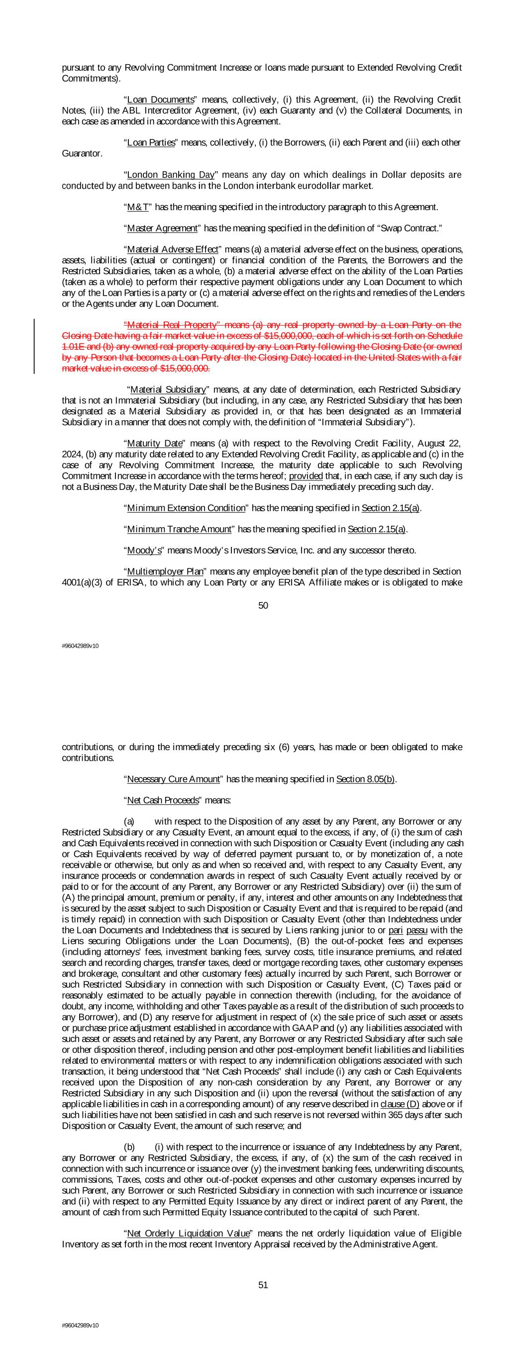 pursuant to any Revolving Commitment Increase or loans made pursuant to Extended Revolving Credit Commitments). “Loan Documents” means, collectively, (i) this Agreement, (ii) the Revolving Credit Notes, (iii) the ABL Intercreditor Agreement, (iv) each Guaranty and (v) the Collateral Documents, in each case as amended in accordance with this Agreement. “Loan Parties” means, collectively, (i) the Borrowers, (ii) each Parent and (iii) each other Guarantor. “London Banking Day” means any day on which dealings in Dollar deposits are conducted by and between banks in the London interbank eurodollar market. “M&T” has the meaning specified in the introductory paragraph to this Agreement. “Master Agreement” has the meaning specified in the definition of “Swap Contract.” “Material Adverse Effect” means (a) a material adverse effect on the business, operations, assets, liabilities (actual or contingent) or financial condition of the Parents, the Borrowers and the Restricted Subsidiaries, taken as a whole, (b) a material adverse effect on the ability of the Loan Parties (taken as a whole) to perform their respective payment obligations under any Loan Document to which any of the Loan Parties is a party or (c) a material adverse effect on the rights and remedies of the Lenders or the Agents under any Loan Document. “Material Real Property” means (a) any real property owned by a Loan Party on the Closing Date having a fair market value in excess of $15,000,000, each of which is set forth on Schedule 1.01E and (b) any owned real property acquired by any Loan Party following the Closing Date (or owned by any Person that becomes a Loan Party after the Closing Date) located in the United States with a fair market value in excess of $15,000,000. “Material Subsidiary” means, at any date of determination, each Restricted Subsidiary that is not an Immaterial Subsidiary (but including, in any case, any Restricted Subsidiary that has been designated as a Material Subsidiary as provided in, or that has been designated as an Immaterial Subsidiary in a manner that does not comply with, the definition of “Immaterial Subsidiary”). “Maturity Date” means (a) with respect to the Revolving Credit Facility, August 22, 2024, (b) any maturity date related to any Extended Revolving Credit Facility, as applicable and (c) in the case of any Revolving Commitment Increase, the maturity date applicable to such Revolving Commitment Increase in accordance with the terms hereof; provided that, in each case, if any such day is not a Business Day, the Maturity Date shall be the Business Day immediately preceding such day. “Minimum Extension Condition” has the meaning specified in Section 2.15(a). “Minimum Tranche Amount” has the meaning specified in Section 2.15(a). “Moody’s” means Moody’s Investors Service, Inc. and any successor thereto. “Multiemployer Plan” means any employee benefit plan of the type described in Section 4001(a)(3) of ERISA, to which any Loan Party or any ERISA Affiliate makes or is obligated to make 50 #96042989v10 contributions, or during the immediately preceding six (6) years, has made or been obligated to make contributions. “Necessary Cure Amount” has the meaning specified in Section 8.05(b). “Net Cash Proceeds” means: (a) with respect to the Disposition of any asset by any Parent, any Borrower or any Restricted Subsidiary or any Casualty Event, an amount equal to the excess, if any, of (i) the sum of cash and Cash Equivalents received in connection with such Disposition or Casualty Event (including any cash or Cash Equivalents received by way of deferred payment pursuant to, or by monetization of, a note receivable or otherwise, but only as and when so received and, with respect to any Casualty Event, any insurance proceeds or condemnation awards in respect of such Casualty Event actually received by or paid to or for the account of any Parent, any Borrower or any Restricted Subsidiary) over (ii) the sum of (A) the principal amount, premium or penalty, if any, interest and other amounts on any Indebtedness that is secured by the asset subject to such Disposition or Casualty Event and that is required to be repaid (and is timely repaid) in connection with such Disposition or Casualty Event (other than Indebtedness under the Loan Documents and Indebtedness that is secured by Liens ranking junior to or pari passu with the Liens securing Obligations under the Loan Documents), (B) the out-of-pocket fees and expenses (including attorneys’ fees, investment banking fees, survey costs, title insurance premiums, and related search and recording charges, transfer taxes, deed or mortgage recording taxes, other customary expenses and brokerage, consultant and other customary fees) actually incurred by such Parent, such Borrower or such Restricted Subsidiary in connection with such Disposition or Casualty Event, (C) Taxes paid or reasonably estimated to be actually payable in connection therewith (including, for the avoidance of doubt, any income, withholding and other Taxes payable as a result of the distribution of such proceeds to any Borrower), and (D) any reserve for adjustment in respect of (x) the sale price of such asset or assets or purchase price adjustment established in accordance with GAAP and (y) any liabilities associated with such asset or assets and retained by any Parent, any Borrower or any Restricted Subsidiary after such sale or other disposition thereof, including pension and other post-employment benefit liabilities and liabilities related to environmental matters or with respect to any indemnification obligations associated with such transaction, it being understood that “Net Cash Proceeds” shall include (i) any cash or Cash Equivalents received upon the Disposition of any non-cash consideration by any Parent, any Borrower or any Restricted Subsidiary in any such Disposition and (ii) upon the reversal (without the satisf