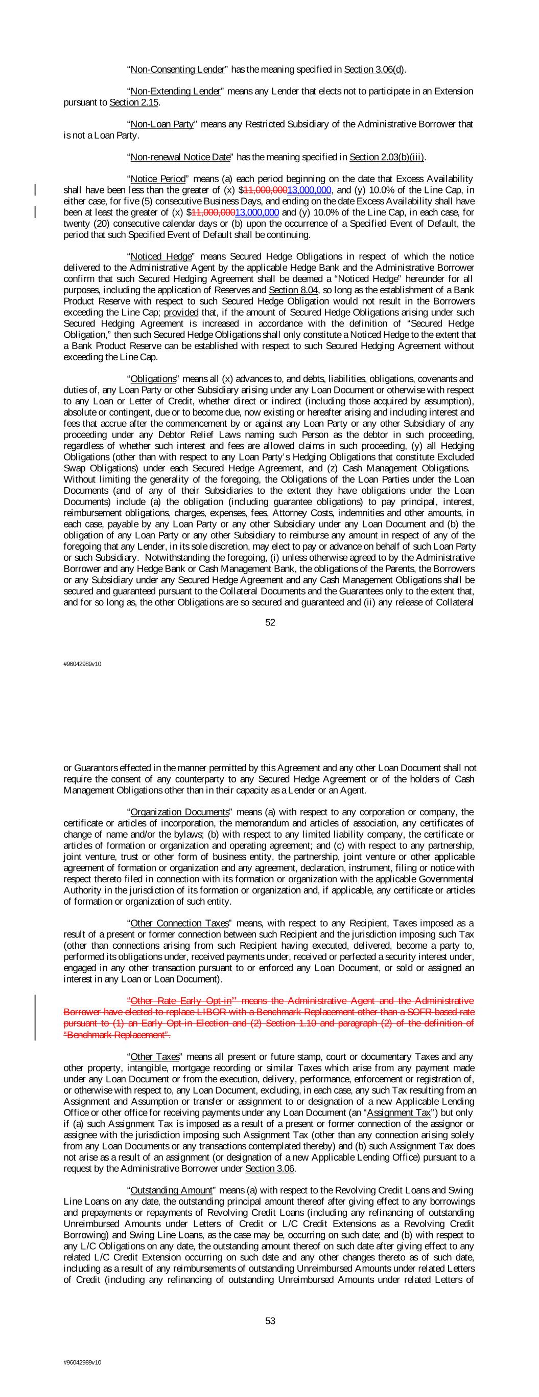“Non-Consenting Lender” has the meaning specified in Section 3.06(d). “Non-Extending Lender” means any Lender that elects not to participate in an Extension pursuant to Section 2.15. “Non-Loan Party” means any Restricted Subsidiary of the Administrative Borrower that is not a Loan Party. “Non-renewal Notice Date” has the meaning specified in Section 2.03(b)(iii). “Notice Period” means (a) each period beginning on the date that Excess Availability shall have been less than the greater of (x) $11,000,00013,000,000, and (y) 10.0% of the Line Cap, in either case, for five (5) consecutive Business Days, and ending on the date Excess Availability shall have been at least the greater of (x) $11,000,00013,000,000 and (y) 10.0% of the Line Cap, in each case, for twenty (20) consecutive calendar days or (b) upon the occurrence of a Specified Event of Default, the period that such Specified Event of Default shall be continuing. “Noticed Hedge” means Secured Hedge Obligations in respect of which the notice delivered to the Administrative Agent by the applicable Hedge Bank and the Administrative Borrower confirm that such Secured Hedging Agreement shall be deemed a “Noticed Hedge” hereunder for all purposes, including the application of Reserves and Section 8.04, so long as the establishment of a Bank Product Reserve with respect to such Secured Hedge Obligation would not result in the Borrowers exceeding the Line Cap; provided that, if the amount of Secured Hedge Obligations arising under such Secured Hedging Agreement is increased in accordance with the definition of “Secured Hedge Obligation,” then such Secured Hedge Obligations shall only constitute a Noticed Hedge to the extent that a Bank Product Reserve can be established with respect to such Secured Hedging Agreement without exceeding the Line Cap. “Obligations” means all (x) advances to, and debts, liabilities, obligations, covenants and duties of, any Loan Party or other Subsidiary arising under any Loan Document or otherwise with respect to any Loan or Letter of Credit, whether direct or indirect (including those acquired by assumption), absolute or contingent, due or to become due, now existing or hereafter arising and including interest and fees that accrue after the commencement by or against any Loan Party or any other Subsidiary of any proceeding under any Debtor Relief Laws naming such Person as the debtor in such proceeding, regardless of whether such interest and fees are allowed claims in such proceeding, (y) all Hedging Obligations (other than with respect to any Loan Party’s Hedging Obligations that constitute Excluded Swap Obligations) under each Secured Hedge Agreement, and (z) Cash Management Obligations. Without limiting the generality of the foregoing, the Obligations of the Loan Parties under the Loan Documents (and of any of their Subsidiaries to the extent they have obligations under the Loan Documents) include (a) the obligation (including guarantee obligations) to pay principal, interest, reimbursement obligations, charges, expenses, fees, Attorney Costs, indemnities and other amounts, in each case, payable by any Loan Party or any other Subsidiary under any Loan Document and (b) the obligation of any Loan Party or any other Subsidiary to reimburse any amount in respect of any of the foregoing that any Lender, in its sole discretion, may elect to pay or advance on behalf of such Loan Party or such Subsidiary. Notwithstanding the foregoing, (i) unless otherwise agreed to by the Administrative Borrower and any Hedge Bank or Cash Management Bank, the obligations of the Parents, the Borrowers or any Subsidiary under any Secured Hedge Agreement and any Cash Management Obligations shall be secured and guaranteed pursuant to the Collateral Documents and the Guarantees only to the extent that, and for so long as, the other Obligations are so secured and guaranteed and (ii) any release of Collateral 52 #96042989v10 or Guarantors effected in the manner permitted by this Agreement and any other Loan Document shall not require the consent of any counterparty to any Secured Hedge Agreement or of the holders of Cash Management Obligations other than in their capacity as a Lender or an Agent. “Organization Documents” means (a) with respect to any corporation or company, the certificate or articles of incorporation, the memorandum and articles of association, any certificates of change of name and/or the bylaws; (b) with respect to any limited liability company, the certificate or articles of formation or organization and operating agreement; and (c) with respect to any partnership, joint venture, trust or other form of business entity, the partnership, joint venture or other applicable agreement of formation or organization and any agreement, declaration, instrument, filing or notice with respect thereto filed in connection with its formation or organization with the applicable Governmental Authority in the jurisdiction of its formation or organization and, if applicable, any certificate or articles of formation or organization of such entity. “Other Connection Taxes” means, with respect to any Recipient, Taxes imposed as a result of a present or former connection between such Recipient and the jurisdiction imposing such Tax (other than connections arising from such Recipient having executed, delivered, become a party to, performed its obligations under, received payments under, received or perfected a security interest under, engaged in any other transaction pursuant to or enforced any Loan Document, or sold or assigned an interest in any Loan or Loan Document). “Other Rate Early Opt-in” means the Administrative Agent and the Administrative Borrower have elected to replace LIBOR with a Benchmark Replacement other than a SOFR-based rate pursuant to (1) an Early Opt-in Election and (2) Section 1.10 and paragraph (2) of the definition of “Benchmark Replacement”. “Other Taxes” me
