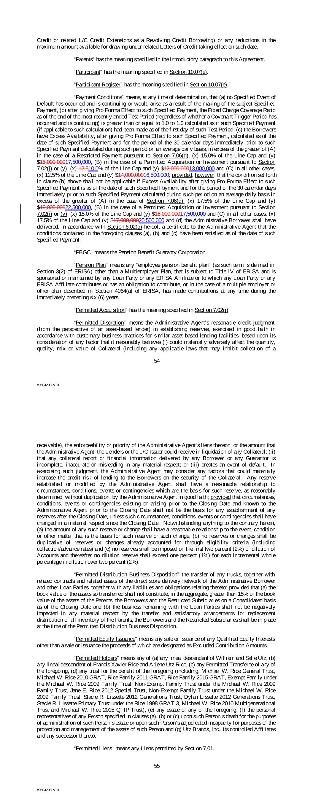Credit or related L/C Credit Extensions as a Revolving Credit Borrowing) or any reductions in the maximum amount available for drawing under related Letters of Credit taking effect on such date. “Parents” has the meaning specified in the introductory paragraph to this Agreement. “Participant” has the meaning specified in Section 10.07(e). “Participant Register” has the meaning specified in Section 10.07(e). “Payment Conditions” means, at any time of determination, that (a) no Specified Event of Default has occurred and is continuing or would arise as a result of the making of the subject Specified Payment, (b) after giving Pro Forma Effect to such Specified Payment, the Fixed Charge Coverage Ratio as of the end of the most recently ended Test Period (regardless of whether a Covenant Trigger Period has occurred and is continuing) is greater than or equal to 1.0 to 1.0 calculated as if such Specified Payment (if applicable to such calculation) had been made as of the first day of such Test Period, (c) the Borrowers have Excess Availability, after giving Pro Forma Effect to such Specified Payment, calculated as of the date of such Specified Payment and for the period of the 30 calendar days immediately prior to such Specified Payment calculated during such period on an average daily basis, in excess of the greater of (A) in the case of a Restricted Payment pursuant to Section 7.06(q), (x) 15.0% of the Line Cap and (y) $15,000,00017,500,000, (B) in the case of a Permitted Acquisition or Investment pursuant to Section 7.02(j) or (y), (x) 12.510.0% of the Line Cap and (y) $12,000,00013,000,000 and (C) in all other cases, (x) 12.5% of the Line Cap and (y) $14,000,00016,500,000; provided, however, that the condition set forth in clause (b) above shall not be applicable if Excess Availability after giving Pro Forma Effect to such Specified Payment is as of the date of such Specified Payment and for the period of the 30 calendar days immediately prior to such Specified Payment calculated during such period on an average daily basis in excess of the greater of (A) in the case of Section 7.06(q), (x) 17.5% of the Line Cap and (y) $19,000,00022,500,000, (B) in the case of a Permitted Acquisition or Investment pursuant to Section 7.02(j) or (y), (x) 15.0% of the Line Cap and (y) $16,000,00017,500,000 and (C) in all other cases, (x) 17.5% of the Line Cap and (y) $17,000,00020,500,000 and (d) the Administrative Borrower shall have delivered, in accordance with Section 6.02(g) hereof, a certificate to the Administrative Agent that the conditions contained in the foregoing clauses (a), (b) and (c) have been satisfied as of the date of such Specified Payment. “PBGC” means the Pension Benefit Guaranty Corporation. “Pension Plan” means any “employee pension benefit plan” (as such term is defined in Section 3(2) of ERISA) other than a Multiemployer Plan, that is subject to Title IV of ERISA and is sponsored or maintained by any Loan Party or any ERISA Affiliate or to which any Loan Party or any ERISA Affiliate contributes or has an obligation to contribute, or in the case of a multiple employer or other plan described in Section 4064(a) of ERISA, has made contributions at any time during the immediately preceding six (6) years. “Permitted Acquisition” has the meaning specified in Section 7.02(j). “Permitted Discretion” means the Administrative Agent’s reasonable credit judgment (from the perspective of an asset-based lender) in establishing reserves, exercised in good faith in accordance with customary business practices for similar asset based lending facilities, based upon its consideration of any factor that it reasonably believes (i) could materially adversely affect the quantity, quality, mix or value of Collateral (including any applicable laws that may inhibit collection of a 54 #96042989v10 receivable), the enforceability or priority of the Administrative Agent’s liens thereon, or the amount that the Administrative Agent, the Lenders or the L/C Issuer could receive in liquidation of any Collateral; (ii) that any collateral report or financial information delivered by any Borrower or any Guarantor is incomplete, inaccurate or misleading in any material respect; or (iii) creates an event of default. In exercising such judgment, the Administrative Agent may consider any factors that could materially increase the credit risk of lending to the Borrowers on the security of the Collateral. Any reserve established or modified by the Administrative Agent shall have a reasonable relationship to circumstances, conditions, events or contingencies which are the basis for such reserve, as reasonably determined, without duplication, by the Administrative Agent in good faith; provided that circumstances, conditions, events or contingencies existing or arising prior to the Closing Date and known to the Administrative Agent prior to the Closing Date shall not be the basis for any establishment of any reserves after the Closing Date, unless such circumstances, conditions, events or contingencies shall have changed in a material respect since the Closing Date. Notwithstanding anything to the contrary herein, (a) the amount of any such reserve or change shall have a reasonable relationship to the event, condition or other matter that is the basis for such reserve or such change, (b) no reserves or changes shall be duplicative of reserves or changes already accounted for through eligibility criteria (including collection/advance rates) and (c) no reserves shall be imposed on the first two percent (2%) of dilution of Accounts and thereafter no dilution reserve shall exceed one percent (1%) for each incremental whole percentage in dilution over two percent (2%). “Permitted Distribution Business Disposition” the transfer of any trucks, together with related contracts and related assets of the direct store delivery network of the Administrative Borrower and other Loan Parties, togeth