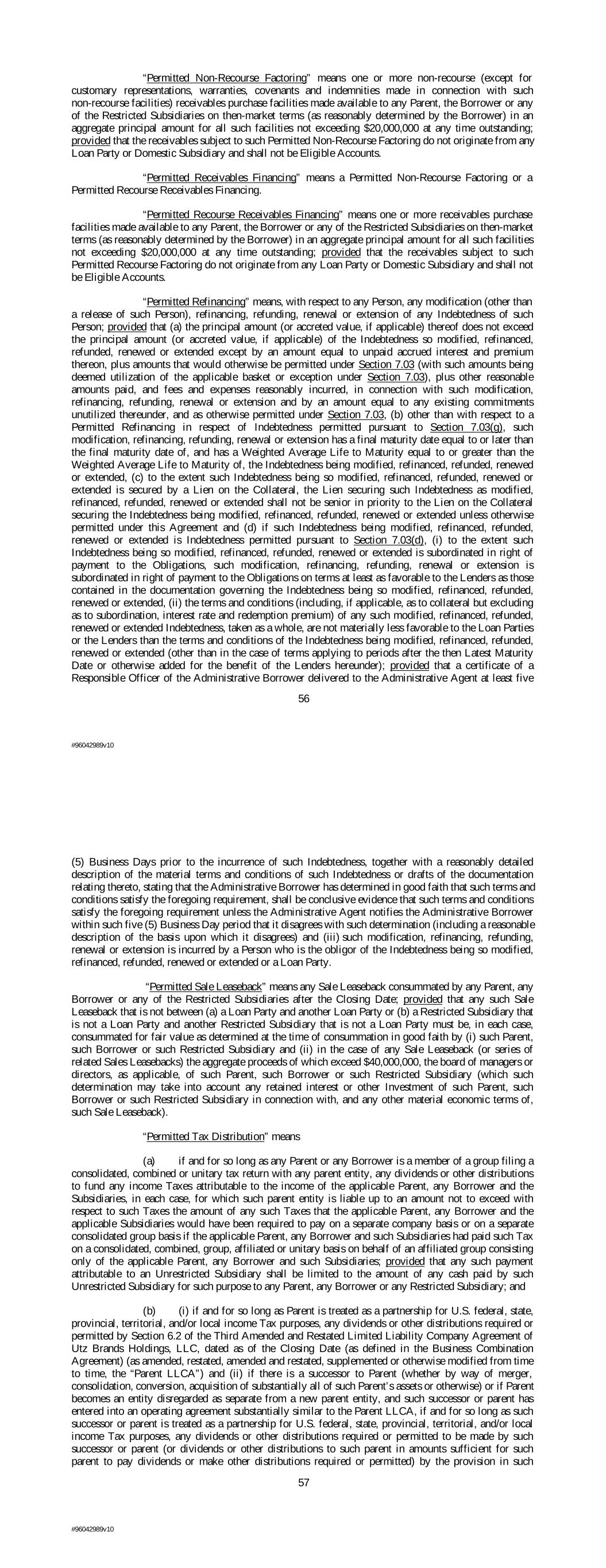 “Permitted Non-Recourse Factoring” means one or more non-recourse (except for customary representations, warranties, covenants and indemnities made in connection with such non-recourse facilities) receivables purchase facilities made available to any Parent, the Borrower or any of the Restricted Subsidiaries on then-market terms (as reasonably determined by the Borrower) in an aggregate principal amount for all such facilities not exceeding $20,000,000 at any time outstanding; provided that the receivables subject to such Permitted Non-Recourse Factoring do not originate from any Loan Party or Domestic Subsidiary and shall not be Eligible Accounts. “Permitted Receivables Financing” means a Permitted Non-Recourse Factoring or a Permitted Recourse Receivables Financing. “Permitted Recourse Receivables Financing” means one or more receivables purchase facilities made available to any Parent, the Borrower or any of the Restricted Subsidiaries on then-market terms (as reasonably determined by the Borrower) in an aggregate principal amount for all such facilities not exceeding $20,000,000 at any time outstanding; provided that the receivables subject to such Permitted Recourse Factoring do not originate from any Loan Party or Domestic Subsidiary and shall not be Eligible Accounts. “Permitted Refinancing” means, with respect to any Person, any modification (other than a release of such Person), refinancing, refunding, renewal or extension of any Indebtedness of such Person; provided that (a) the principal amount (or accreted value, if applicable) thereof does not exceed the principal amount (or accreted value, if applicable) of the Indebtedness so modified, refinanced, refunded, renewed or extended except by an amount equal to unpaid accrued interest and premium thereon, plus amounts that would otherwise be permitted under Section 7.03 (with such amounts being deemed utilization of the applicable basket or exception under Section 7.03), plus other reasonable amounts paid, and fees and expenses reasonably incurred, in connection with such modification, refinancing, refunding, renewal or extension and by an amount equal to any existing commitments unutilized thereunder, and as otherwise permitted under Section 7.03, (b) other than with respect to a Permitted Refinancing in respect of Indebtedness permitted pursuant to Section 7.03(g), such modification, refinancing, refunding, renewal or extension has a final maturity date equal to or later than the final maturity date of, and has a Weighted Average Life to Maturity equal to or greater than the Weighted Average Life to Maturity of, the Indebtedness being modified, refinanced, refunded, renewed or extended, (c) to the extent such Indebtedness being so modified, refinanced, refunded, renewed or extended is secured by a Lien on the Collateral, the Lien securing such Indebtedness as modified, refinanced, refunded, renewed or extended shall not be senior in priority to the Lien on the Collateral securing the Indebtedness being modified, refinanced, refunded, renewed or extended unless otherwise permitted under this Agreement and (d) if such Indebtedness being modified, refinanced, refunded, renewed or extended is Indebtedness permitted pursuant to Section 7.03(d), (i) to the extent such Indebtedness being so modified, refinanced, refunded, renewed or extended is subordinated in right of payment to the Obligations, such modification, refinancing, refunding, renewal or extension is subordinated in right of payment to the Obligations on terms at least as favorable to the Lenders as those contained in the documentation governing the Indebtedness being so modified, refinanced, refunded, renewed or extended, (ii) the terms and conditions (including, if applicable, as to collateral but excluding as to subordination, interest rate and redemption premium) of any such modified, refinanced, refunded, renewed or extended Indebtedness, taken as a whole, are not materially less favorable to the Loan Parties or the Lenders than the terms and conditions of the Indebtedness being modified, refinanced, refunded, renewed or extended (other than in the case of terms applying to periods after the then Latest Maturity Date or otherwise added for the benefit of the Lenders hereunder); provided that a certificate of a Responsible Officer of the Administrative Borrower delivered to the Administrative Agent at least five 56 #96042989v10 (5) Business Days prior to the incurrence of such Indebtedness, together with a reasonably detailed description of the material terms and conditions of such Indebtedness or drafts of the documentation relating thereto, stating that the Administrative Borrower has determined in good faith that such terms and conditions satisfy the foregoing requirement, shall be conclusive evidence that such terms and conditions satisfy the foregoing requirement unless the Administrative Agent notifies the Administrative Borrower within such five (5) Business Day period that it disagrees with such determination (including a reasonable description of the basis upon which it disagrees) and (iii) such modification, refinancing, refunding, renewal or extension is incurred by a Person who is the obligor of the Indebtedness being so modified, refinanced, refunded, renewed or extended or a Loan Party. “Permitted Sale Leaseback” means any Sale Leaseback consummated by any Parent, any Borrower or any of the Restricted Subsidiaries after the Closing Date; provided that any such Sale Leaseback that is not between (a) a Loan Party and another Loan Party or (b) a Restricted Subsidiary that is not a Loan Party and another Restricted Subsidiary that is not a Loan Party must be, in each case, consummated for fair value as determined at the time of consummation in good faith by (i) such Parent, such Borrower or such Restricted Subsidiary and (ii) in the case of any Sale Leaseback (or series of related Sales Leasebacks) the aggregate proceeds of which exceed $