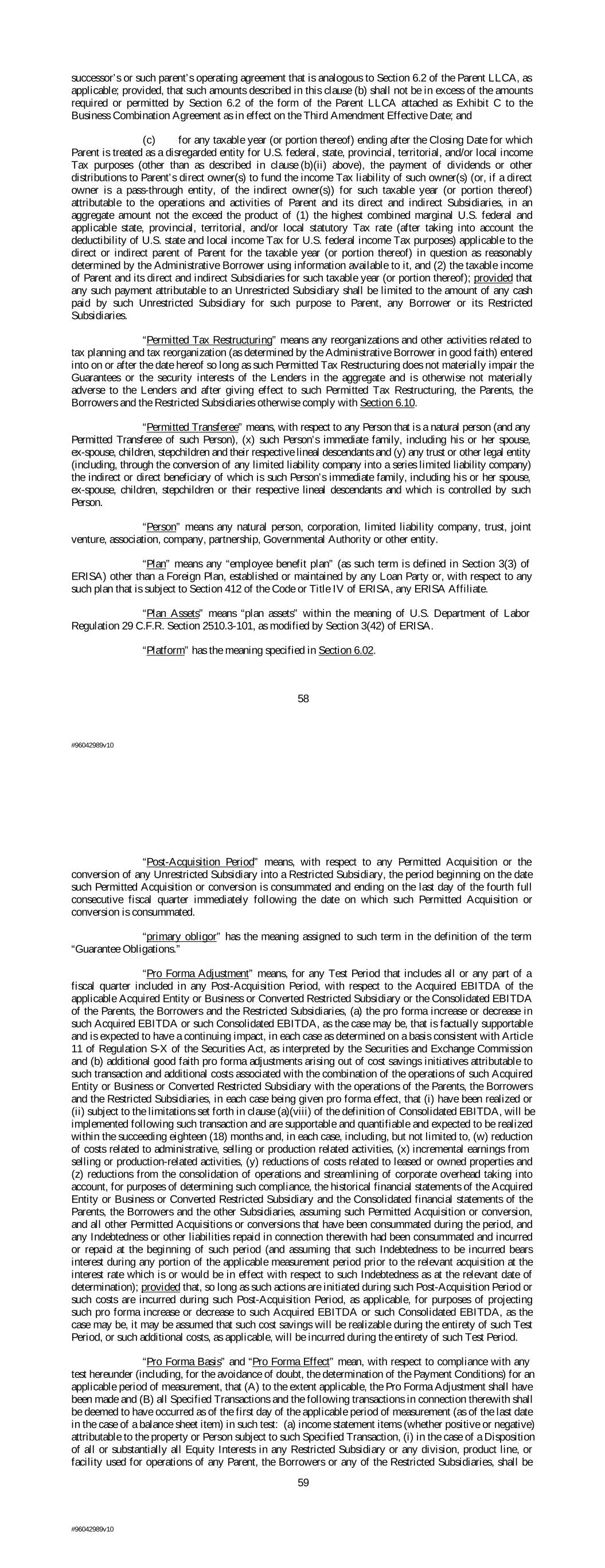 successor’s or such parent’s operating agreement that is analogous to Section 6.2 of the Parent LLCA, as applicable; provided, that such amounts described in this clause (b) shall not be in excess of the amounts required or permitted by Section 6.2 of the form of the Parent LLCA attached as Exhibit C to the Business Combination Agreement as in effect on the Third Amendment Effective Date; and (c) for any taxable year (or portion thereof) ending after the Closing Date for which Parent is treated as a disregarded entity for U.S. federal, state, provincial, territorial, and/or local income Tax purposes (other than as described in clause (b)(ii) above), the payment of dividends or other distributions to Parent’s direct owner(s) to fund the income Tax liability of such owner(s) (or, if a direct owner is a pass-through entity, of the indirect owner(s)) for such taxable year (or portion thereof) attributable to the operations and activities of Parent and its direct and indirect Subsidiaries, in an aggregate amount not the exceed the product of (1) the highest combined marginal U.S. federal and applicable state, provincial, territorial, and/or local statutory Tax rate (after taking into account the deductibility of U.S. state and local income Tax for U.S. federal income Tax purposes) applicable to the direct or indirect parent of Parent for the taxable year (or portion thereof) in question as reasonably determined by the Administrative Borrower using information available to it, and (2) the taxable income of Parent and its direct and indirect Subsidiaries for such taxable year (or portion thereof); provided that any such payment attributable to an Unrestricted Subsidiary shall be limited to the amount of any cash paid by such Unrestricted Subsidiary for such purpose to Parent, any Borrower or its Restricted Subsidiaries. “Permitted Tax Restructuring” means any reorganizations and other activities related to tax planning and tax reorganization (as determined by the Administrative Borrower in good faith) entered into on or after the date hereof so long as such Permitted Tax Restructuring does not materially impair the Guarantees or the security interests of the Lenders in the aggregate and is otherwise not materially adverse to the Lenders and after giving effect to such Permitted Tax Restructuring, the Parents, the Borrowers and the Restricted Subsidiaries otherwise comply with Section 6.10. “Permitted Transferee” means, with respect to any Person that is a natural person (and any Permitted Transferee of such Person), (x) such Person’s immediate family, including his or her spouse, ex-spouse, children, stepchildren and their respective lineal descendants and (y) any trust or other legal entity (including, through the conversion of any limited liability company into a series limited liability company) the indirect or direct beneficiary of which is such Person’s immediate family, including his or her spouse, ex-spouse, children, stepchildren or their respective lineal descendants and which is controlled by such Person. “Person” means any natural person, corporation, limited liability company, trust, joint venture, association, company, partnership, Governmental Authority or other entity. “Plan” means any “employee benefit plan” (as such term is defined in Section 3(3) of ERISA) other than a Foreign Plan, established or maintained by any Loan Party or, with respect to any such plan that is subject to Section 412 of the Code or Title IV of ERISA, any ERISA Affiliate. “Plan Assets” means “plan assets” within the meaning of U.S. Department of Labor Regulation 29 C.F.R. Section 2510.3-101, as modified by Section 3(42) of ERISA. “Platform” has the meaning specified in Section 6.02. 58 #96042989v10 “Post-Acquisition Period” means, with respect to any Permitted Acquisition or the conversion of any Unrestricted Subsidiary into a Restricted Subsidiary, the period beginning on the date such Permitted Acquisition or conversion is consummated and ending on the last day of the fourth full consecutive fiscal quarter immediately following the date on which such Permitted Acquisition or conversion is consummated. “primary obligor” has the meaning assigned to such term in the definition of the term “Guarantee Obligations.” “Pro Forma Adjustment” means, for any Test Period that includes all or any part of a fiscal quarter included in any Post-Acquisition Period, with respect to the Acquired EBITDA of the applicable Acquired Entity or Business or Converted Restricted Subsidiary or the Consolidated EBITDA of the Parents, the Borrowers and the Restricted Subsidiaries, (a) the pro forma increase or decrease in such Acquired EBITDA or such Consolidated EBITDA, as the case may be, that is factually supportable and is expected to have a continuing impact, in each case as determined on a basis consistent with Article 11 of Regulation S-X of the Securities Act, as interpreted by the Securities and Exchange Commission and (b) additional good faith pro forma adjustments arising out of cost savings initiatives attributable to such transaction and additional costs associated with the combination of the operations of such Acquired Entity or Business or Converted Restricted Subsidiary with the operations of the Parents, the Borrowers and the Restricted Subsidiaries, in each case being given pro forma effect, that (i) have been realized or (ii) subject to the limitations set forth in clause (a)(viii) of the definition of Consolidated EBITDA, will be implemented following such transaction and are supportable and quantifiable and expected to be realized within the succeeding eighteen (18) months and, in each case, including, but not limited to, (w) reduction of costs related to administrative, selling or production related activities, (x) incremental earnings from selling or production-related activities, (y) reductions of costs related to leased or owned properties and (z) red