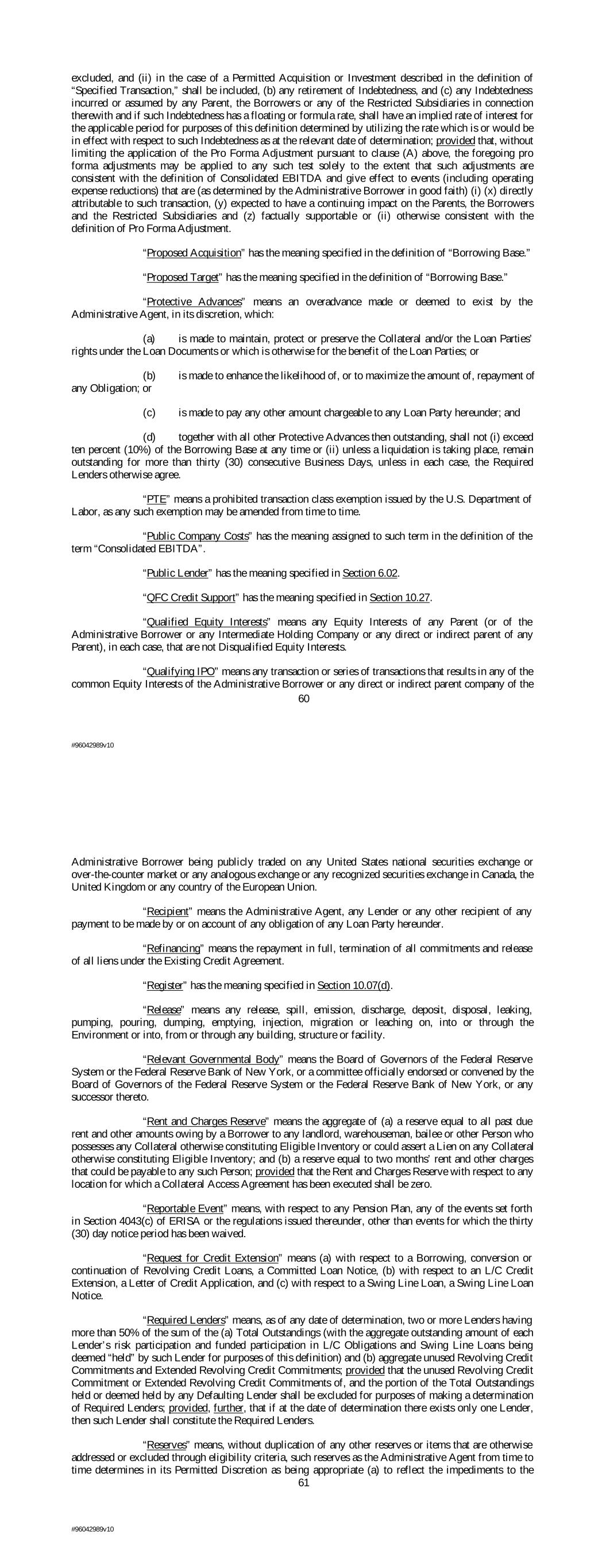 excluded, and (ii) in the case of a Permitted Acquisition or Investment described in the definition of “Specified Transaction,” shall be included, (b) any retirement of Indebtedness, and (c) any Indebtedness incurred or assumed by any Parent, the Borrowers or any of the Restricted Subsidiaries in connection therewith and if such Indebtedness has a floating or formula rate, shall have an implied rate of interest for the applicable period for purposes of this definition determined by utilizing the rate which is or would be in effect with respect to such Indebtedness as at the relevant date of determination; provided that, without limiting the application of the Pro Forma Adjustment pursuant to clause (A) above, the foregoing pro forma adjustments may be applied to any such test solely to the extent that such adjustments are consistent with the definition of Consolidated EBITDA and give effect to events (including operating expense reductions) that are (as determined by the Administrative Borrower in good faith) (i) (x) directly attributable to such transaction, (y) expected to have a continuing impact on the Parents, the Borrowers and the Restricted Subsidiaries and (z) factually supportable or (ii) otherwise consistent with the definition of Pro Forma Adjustment. “Proposed Acquisition” has the meaning specified in the definition of “Borrowing Base.” “Proposed Target” has the meaning specified in the definition of “Borrowing Base.” “Protective Advances” means an overadvance made or deemed to exist by the Administrative Agent, in its discretion, which: (a) is made to maintain, protect or preserve the Collateral and/or the Loan Parties’ rights under the Loan Documents or which is otherwise for the benefit of the Loan Parties; or (b) is made to enhance the likelihood of, or to maximize the amount of, repayment of any Obligation; or (c) is made to pay any other amount chargeable to any Loan Party hereunder; and (d) together with all other Protective Advances then outstanding, shall not (i) exceed ten percent (10%) of the Borrowing Base at any time or (ii) unless a liquidation is taking place, remain outstanding for more than thirty (30) consecutive Business Days, unless in each case, the Required Lenders otherwise agree. “PTE” means a prohibited transaction class exemption issued by the U.S. Department of Labor, as any such exemption may be amended from time to time. “Public Company Costs” has the meaning assigned to such term in the definition of the term “Consolidated EBITDA”. “Public Lender” has the meaning specified in Section 6.02. “QFC Credit Support” has the meaning specified in Section 10.27. “Qualified Equity Interests” means any Equity Interests of any Parent (or of the Administrative Borrower or any Intermediate Holding Company or any direct or indirect parent of any Parent), in each case, that are not Disqualified Equity Interests. “Qualifying IPO” means any transaction or series of transactions that results in any of the common Equity Interests of the Administrative Borrower or any direct or indirect parent company of the 60 #96042989v10 Administrative Borrower being publicly traded on any United States national securities exchange or over-the-counter market or any analogous exchange or any recognized securities exchange in Canada, the United Kingdom or any country of the European Union. “Recipient” means the Administrative Agent, any Lender or any other recipient of any payment to be made by or on account of any obligation of any Loan Party hereunder. “Refinancing” means the repayment in full, termination of all commitments and release of all liens under the Existing Credit Agreement. “Register” has the meaning specified in Section 10.07(d). “Release” means any release, spill, emission, discharge, deposit, disposal, leaking, pumping, pouring, dumping, emptying, injection, migration or leaching on, into or through the Environment or into, from or through any building, structure or facility. “Relevant Governmental Body” means the Board of Governors of the Federal Reserve System or the Federal Reserve Bank of New York, or a committee officially endorsed or convened by the Board of Governors of the Federal Reserve System or the Federal Reserve Bank of New York, or any successor thereto. “Rent and Charges Reserve” means the aggregate of (a) a reserve equal to all past due rent and other amounts owing by a Borrower to any landlord, warehouseman, bailee or other Person who possesses any Collateral otherwise constituting Eligible Inventory or could assert a Lien on any Collateral otherwise constituting Eligible Inventory; and (b) a reserve equal to two months’ rent and other charges that could be payable to any such Person; provided that the Rent and Charges Reserve with respect to any location for which a Collateral Access Agreement has been executed shall be zero. “Reportable Event” means, with respect to any Pension Plan, any of the events set forth in Section 4043(c) of ERISA or the regulations issued thereunder, other than events for which the thirty (30) day notice period has been waived. “Request for Credit Extension” means (a) with respect to a Borrowing, conversion or continuation of Revolving Credit Loans, a Committed Loan Notice, (b) with respect to an L/C Credit Extension, a Letter of Credit Application, and (c) with respect to a Swing Line Loan, a Swing Line Loan Notice. “Required Lenders” means, as of any date of determination, two or more Lenders having more than 50% of the sum of the (a) Total Outstandings (with the aggregate outstanding amount of each Lender’s risk participation and funded participation in L/C Obligations and Swing Line Loans being deemed “held” by such Lender for purposes of this definition) and (b) aggregate unused Revolving Credit Commitments and Extended Revolving Credit Commitments; provided that the unused Revolving Credit Commitment or Extended Revolv