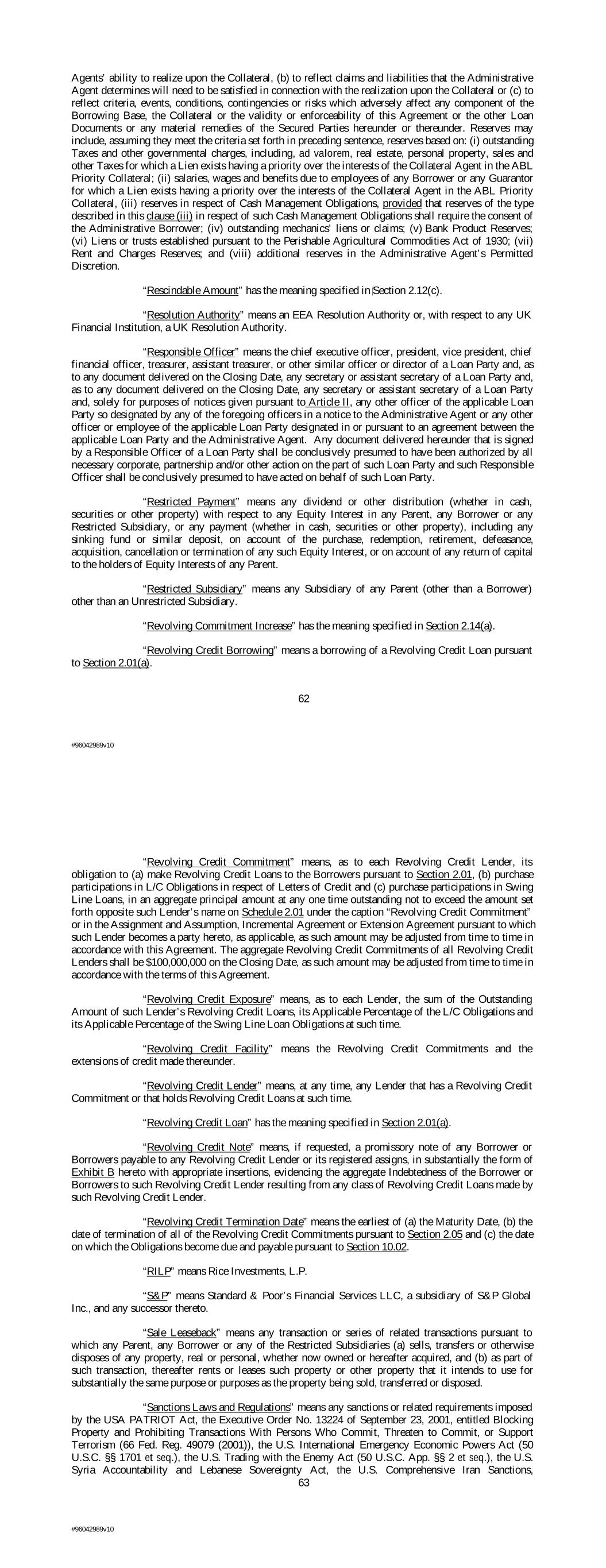 Agents’ ability to realize upon the Collateral, (b) to reflect claims and liabilities that the Administrative Agent determines will need to be satisfied in connection with the realization upon the Collateral or (c) to reflect criteria, events, conditions, contingencies or risks which adversely affect any component of the Borrowing Base, the Collateral or the validity or enforceability of this Agreement or the other Loan Documents or any material remedies of the Secured Parties hereunder or thereunder. Reserves may include, assuming they meet the criteria set forth in preceding sentence, reserves based on: (i) outstanding Taxes and other governmental charges, including, ad valorem, real estate, personal property, sales and other Taxes for which a Lien exists having a priority over the interests of the Collateral Agent in the ABL Priority Collateral; (ii) salaries, wages and benefits due to employees of any Borrower or any Guarantor for which a Lien exists having a priority over the interests of the Collateral Agent in the ABL Priority Collateral, (iii) reserves in respect of Cash Management Obligations, provided that reserves of the type described in this clause (iii) in respect of such Cash Management Obligations shall require the consent of the Administrative Borrower; (iv) outstanding mechanics’ liens or claims; (v) Bank Product Reserves; (vi) Liens or trusts established pursuant to the Perishable Agricultural Commodities Act of 1930; (vii) Rent and Charges Reserves; and (viii) additional reserves in the Administrative Agent’s Permitted Discretion. “Rescindable Amount” has the meaning specified in ‎Section 2.12(c). “Resolution Authority” means an EEA Resolution Authority or, with respect to any UK Financial Institution, a UK Resolution Authority. “Responsible Officer” means the chief executive officer, president, vice president, chief financial officer, treasurer, assistant treasurer, or other similar officer or director of a Loan Party and, as to any document delivered on the Closing Date, any secretary or assistant secretary of a Loan Party and, as to any document delivered on the Closing Date, any secretary or assistant secretary of a Loan Party and, solely for purposes of notices given pursuant to Article II, any other officer of the applicable Loan Party so designated by any of the foregoing officers in a notice to the Administrative Agent or any other officer or employee of the applicable Loan Party designated in or pursuant to an agreement between the applicable Loan Party and the Administrative Agent. Any document delivered hereunder that is signed by a Responsible Officer of a Loan Party shall be conclusively presumed to have been authorized by all necessary corporate, partnership and/or other action on the part of such Loan Party and such Responsible Officer shall be conclusively presumed to have acted on behalf of such Loan Party. “Restricted Payment” means any dividend or other distribution (whether in cash, securities or other property) with respect to any Equity Interest in any Parent, any Borrower or any Restricted Subsidiary, or any payment (whether in cash, securities or other property), including any sinking fund or similar deposit, on account of the purchase, redemption, retirement, defeasance, acquisition, cancellation or termination of any such Equity Interest, or on account of any return of capital to the holders of Equity Interests of any Parent. “Restricted Subsidiary” means any Subsidiary of any Parent (other than a Borrower) other than an Unrestricted Subsidiary. “Revolving Commitment Increase” has the meaning specified in Section 2.14(a). “Revolving Credit Borrowing” means a borrowing of a Revolving Credit Loan pursuant to Section 2.01(a). 62 #96042989v10 “Revolving Credit Commitment” means, as to each Revolving Credit Lender, its obligation to (a) make Revolving Credit Loans to the Borrowers pursuant to Section 2.01, (b) purchase participations in L/C Obligations in respect of Letters of Credit and (c) purchase participations in Swing Line Loans, in an aggregate principal amount at any one time outstanding not to exceed the amount set forth opposite such Lender’s name on Schedule 2.01 under the caption “Revolving Credit Commitment” or in the Assignment and Assumption, Incremental Agreement or Extension Agreement pursuant to which such Lender becomes a party hereto, as applicable, as such amount may be adjusted from time to time in accordance with this Agreement. The aggregate Revolving Credit Commitments of all Revolving Credit Lenders shall be $100,000,000 on the Closing Date, as such amount may be adjusted from time to time in accordance with the terms of this Agreement. “Revolving Credit Exposure” means, as to each Lender, the sum of the Outstanding Amount of such Lender’s Revolving Credit Loans, its Applicable Percentage of the L/C Obligations and its Applicable Percentage of the Swing Line Loan Obligations at such time. “Revolving Credit Facility” means the Revolving Credit Commitments and the extensions of credit made thereunder. “Revolving Credit Lender” means, at any time, any Lender that has a Revolving Credit Commitment or that holds Revolving Credit Loans at such time. “Revolving Credit Loan” has the meaning specified in Section 2.01(a). “Revolving Credit Note” means, if requested, a promissory note of any Borrower or Borrowers payable to any Revolving Credit Lender or its registered assigns, in substantially the form of Exhibit B hereto with appropriate insertions, evidencing the aggregate Indebtedness of the Borrower or Borrowers to such Revolving Credit Lender resulting from any class of Revolving Credit Loans made by such Revolving Credit Lender. “Revolving Credit Termination Date” means the earliest of (a) the Maturity Date, (b) the date of termination of all of the Revolving Credit Commitments pursuant to Section 2.05 and (c) the date on which the Obligations become due 
