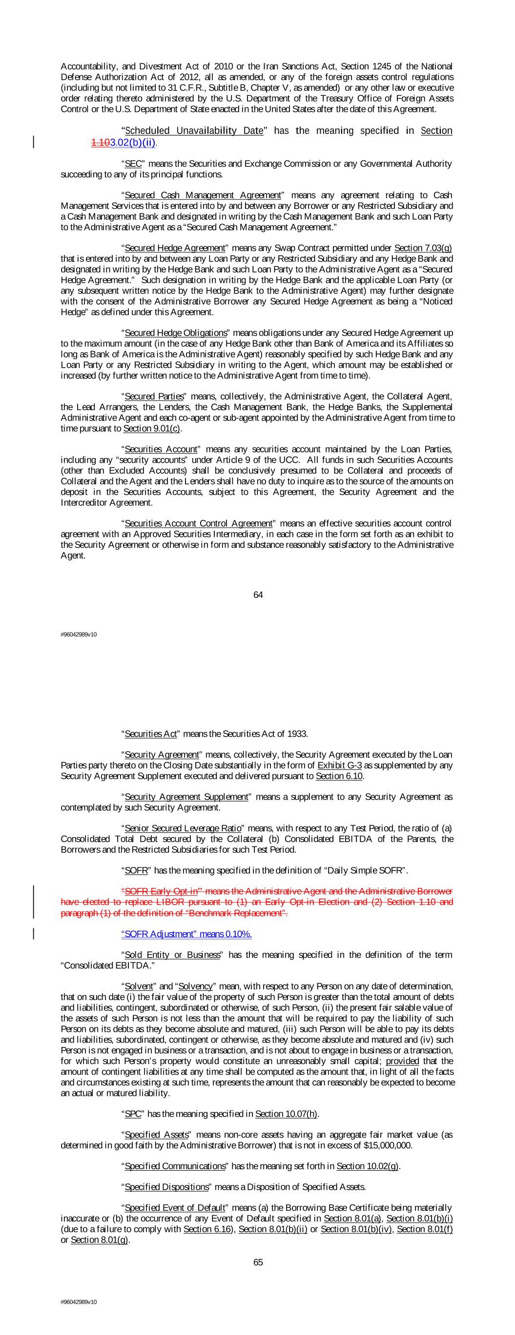 Accountability, and Divestment Act of 2010 or the Iran Sanctions Act, Section 1245 of the National Defense Authorization Act of 2012, all as amended, or any of the foreign assets control regulations (including but not limited to 31 C.F.R., Subtitle B, Chapter V, as amended) or any other law or executive order relating thereto administered by the U.S. Department of the Treasury Office of Foreign Assets Control or the U.S. Department of State enacted in the United States after the date of this Agreement. “Scheduled Unavailability Date” has the meaning specified in Section 1.103.02(b)(ii). “SEC” means the Securities and Exchange Commission or any Governmental Authority succeeding to any of its principal functions. “Secured Cash Management Agreement” means any agreement relating to Cash Management Services that is entered into by and between any Borrower or any Restricted Subsidiary and a Cash Management Bank and designated in writing by the Cash Management Bank and such Loan Party to the Administrative Agent as a “Secured Cash Management Agreement.” “Secured Hedge Agreement” means any Swap Contract permitted under Section 7.03(g) that is entered into by and between any Loan Party or any Restricted Subsidiary and any Hedge Bank and designated in writing by the Hedge Bank and such Loan Party to the Administrative Agent as a “Secured Hedge Agreement.” Such designation in writing by the Hedge Bank and the applicable Loan Party (or any subsequent written notice by the Hedge Bank to the Administrative Agent) may further designate with the consent of the Administrative Borrower any Secured Hedge Agreement as being a “Noticed Hedge” as defined under this Agreement. “Secured Hedge Obligations” means obligations under any Secured Hedge Agreement up to the maximum amount (in the case of any Hedge Bank other than Bank of America and its Affiliates so long as Bank of America is the Administrative Agent) reasonably specified by such Hedge Bank and any Loan Party or any Restricted Subsidiary in writing to the Agent, which amount may be established or increased (by further written notice to the Administrative Agent from time to time). “Secured Parties” means, collectively, the Administrative Agent, the Collateral Agent, the Lead Arrangers, the Lenders, the Cash Management Bank, the Hedge Banks, the Supplemental Administrative Agent and each co-agent or sub-agent appointed by the Administrative Agent from time to time pursuant to Section 9.01(c). “Securities Account” means any securities account maintained by the Loan Parties, including any “security accounts” under Article 9 of the UCC. All funds in such Securities Accounts (other than Excluded Accounts) shall be conclusively presumed to be Collateral and proceeds of Collateral and the Agent and the Lenders shall have no duty to inquire as to the source of the amounts on deposit in the Securities Accounts, subject to this Agreement, the Security Agreement and the Intercreditor Agreement. “Securities Account Control Agreement” means an effective securities account control agreement with an Approved Securities Intermediary, in each case in the form set forth as an exhibit to the Security Agreement or otherwise in form and substance reasonably satisfactory to the Administrative Agent. 64 #96042989v10 “Securities Act” means the Securities Act of 1933. “Security Agreement” means, collectively, the Security Agreement executed by the Loan Parties party thereto on the Closing Date substantially in the form of Exhibit G-3 as supplemented by any Security Agreement Supplement executed and delivered pursuant to Section 6.10. “Security Agreement Supplement” means a supplement to any Security Agreement as contemplated by such Security Agreement. “Senior Secured Leverage Ratio” means, with respect to any Test Period, the ratio of (a) Consolidated Total Debt secured by the Collateral (b) Consolidated EBITDA of the Parents, the Borrowers and the Restricted Subsidiaries for such Test Period. “SOFR” has the meaning specified in the definition of “Daily Simple SOFR”. “SOFR Early Opt-in” means the Administrative Agent and the Administrative Borrower have elected to replace LIBOR pursuant to (1) an Early Opt-in Election and (2) Section 1.10 and paragraph (1) of the definition of “Benchmark Replacement”. “SOFR Adjustment” means 0.10%. “Sold Entity or Business” has the meaning specified in the definition of the term “Consolidated EBITDA.” “Solvent” and “Solvency” mean, with respect to any Person on any date of determination, that on such date (i) the fair value of the property of such Person is greater than the total amount of debts and liabilities, contingent, subordinated or otherwise, of such Person, (ii) the present fair salable value of the assets of such Person is not less than the amount that will be required to pay the liability of such Person on its debts as they become absolute and matured, (iii) such Person will be able to pay its debts and liabilities, subordinated, contingent or otherwise, as they become absolute and matured and (iv) such Person is not engaged in business or a transaction, and is not about to engage in business or a transaction, for which such Person’s property would constitute an unreasonably small capital; provided that the amount of contingent liabilities at any time shall be computed as the amount that, in light of all the facts and circumstances existing at such time, represents the amount that can reasonably be expected to become an actual or matured liability. “SPC” has the meaning specified in Section 10.07(h). “Specified Assets” means non-core assets having an aggregate fair market value (as determined in good faith by the Administrative Borrower) that is not in excess of $15,000,000. “Specified Communications” has the meaning set forth in Section 10.02(g). “Specified Dispositions” means a Disposition of Specified Assets. “