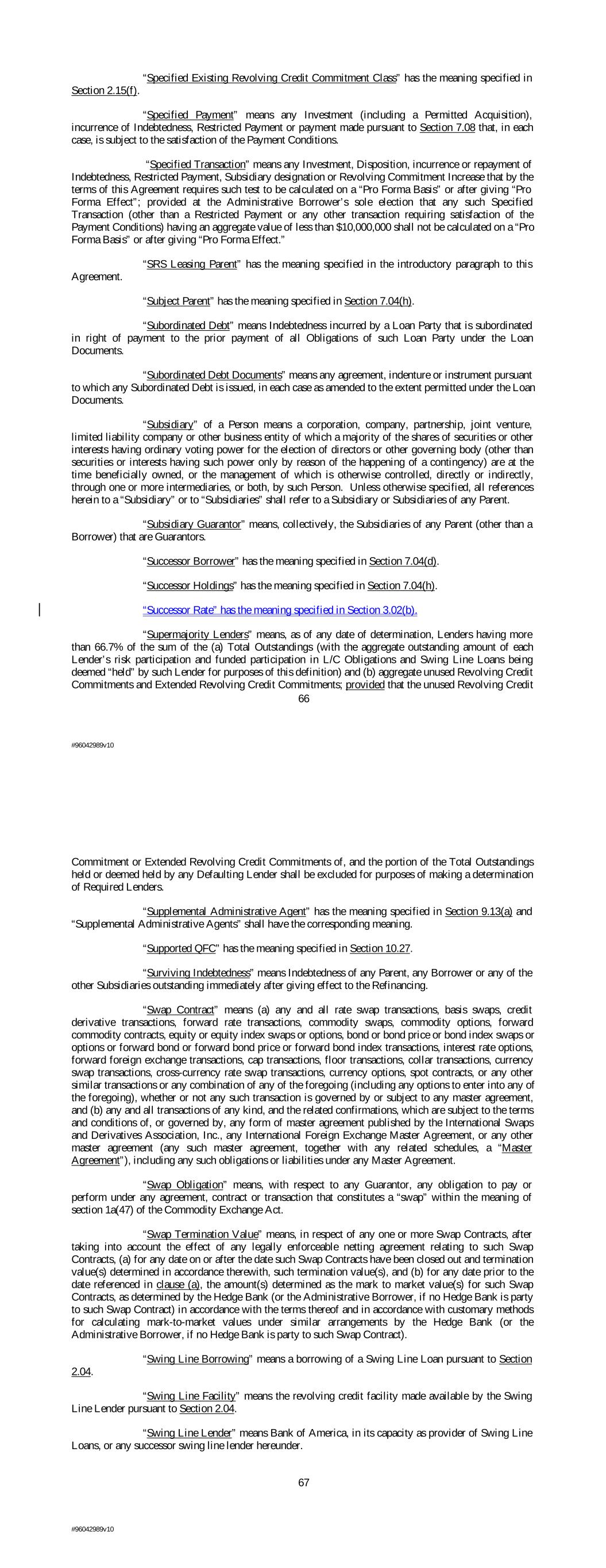 “Specified Existing Revolving Credit Commitment Class” has the meaning specified in Section 2.15(f). “Specified Payment” means any Investment (including a Permitted Acquisition), incurrence of Indebtedness, Restricted Payment or payment made pursuant to Section 7.08 that, in each case, is subject to the satisfaction of the Payment Conditions. “Specified Transaction” means any Investment, Disposition, incurrence or repayment of Indebtedness, Restricted Payment, Subsidiary designation or Revolving Commitment Increase that by the terms of this Agreement requires such test to be calculated on a “Pro Forma Basis” or after giving “Pro Forma Effect”; provided at the Administrative Borrower’s sole election that any such Specified Transaction (other than a Restricted Payment or any other transaction requiring satisfaction of the Payment Conditions) having an aggregate value of less than $10,000,000 shall not be calculated on a “Pro Forma Basis” or after giving “Pro Forma Effect.” “SRS Leasing Parent” has the meaning specified in the introductory paragraph to this Agreement. “Subject Parent” has the meaning specified in Section 7.04(h). “Subordinated Debt” means Indebtedness incurred by a Loan Party that is subordinated in right of payment to the prior payment of all Obligations of such Loan Party under the Loan Documents. “Subordinated Debt Documents” means any agreement, indenture or instrument pursuant to which any Subordinated Debt is issued, in each case as amended to the extent permitted under the Loan Documents. “Subsidiary” of a Person means a corporation, company, partnership, joint venture, limited liability company or other business entity of which a majority of the shares of securities or other interests having ordinary voting power for the election of directors or other governing body (other than securities or interests having such power only by reason of the happening of a contingency) are at the time beneficially owned, or the management of which is otherwise controlled, directly or indirectly, through one or more intermediaries, or both, by such Person. Unless otherwise specified, all references herein to a “Subsidiary” or to “Subsidiaries” shall refer to a Subsidiary or Subsidiaries of any Parent. “Subsidiary Guarantor” means, collectively, the Subsidiaries of any Parent (other than a Borrower) that are Guarantors. “Successor Borrower” has the meaning specified in Section 7.04(d). “Successor Holdings” has the meaning specified in Section 7.04(h). “Successor Rate” has the meaning specified in Section 3.02(b). “Supermajority Lenders” means, as of any date of determination, Lenders having more than 66.7% of the sum of the (a) Total Outstandings (with the aggregate outstanding amount of each Lender’s risk participation and funded participation in L/C Obligations and Swing Line Loans being deemed “held” by such Lender for purposes of this definition) and (b) aggregate unused Revolving Credit Commitments and Extended Revolving Credit Commitments; provided that the unused Revolving Credit 66 #96042989v10 Commitment or Extended Revolving Credit Commitments of, and the portion of the Total Outstandings held or deemed held by any Defaulting Lender shall be excluded for purposes of making a determination of Required Lenders. “Supplemental Administrative Agent” has the meaning specified in Section 9.13(a) and “Supplemental Administrative Agents” shall have the corresponding meaning. “Supported QFC” has the meaning specified in Section 10.27. “Surviving Indebtedness” means Indebtedness of any Parent, any Borrower or any of the other Subsidiaries outstanding immediately after giving effect to the Refinancing. “Swap Contract” means (a) any and all rate swap transactions, basis swaps, credit derivative transactions, forward rate transactions, commodity swaps, commodity options, forward commodity contracts, equity or equity index swaps or options, bond or bond price or bond index swaps or options or forward bond or forward bond price or forward bond index transactions, interest rate options, forward foreign exchange transactions, cap transactions, floor transactions, collar transactions, currency swap transactions, cross-currency rate swap transactions, currency options, spot contracts, or any other similar transactions or any combination of any of the foregoing (including any options to enter into any of the foregoing), whether or not any such transaction is governed by or subject to any master agreement, and (b) any and all transactions of any kind, and the related confirmations, which are subject to the terms and conditions of, or governed by, any form of master agreement published by the International Swaps and Derivatives Association, Inc., any International Foreign Exchange Master Agreement, or any other master agreement (any such master agreement, together with any related schedules, a “Master Agreement”), including any such obligations or liabilities under any Master Agreement. “Swap Obligation” means, with respect to any Guarantor, any obligation to pay or perform under any agreement, contract or transaction that constitutes a “swap” within the meaning of section 1a(47) of the Commodity Exchange Act. “Swap Termination Value” means, in respect of any one or more Swap Contracts, after taking into account the effect of any legally enforceable netting agreement relating to such Swap Contracts, (a) for any date on or after the date such Swap Contracts have been closed out and termination value(s) determined in accordance therewith, such termination value(s), and (b) for any date prior to the date referenced in clause (a), the amount(s) determined as the mark to market value(s) for such Swap Contracts, as determined by the Hedge Bank (or the Administrative Borrower, if no Hedge Bank is party to such Swap Contract) in accordance with the terms thereof and in accordance with cus