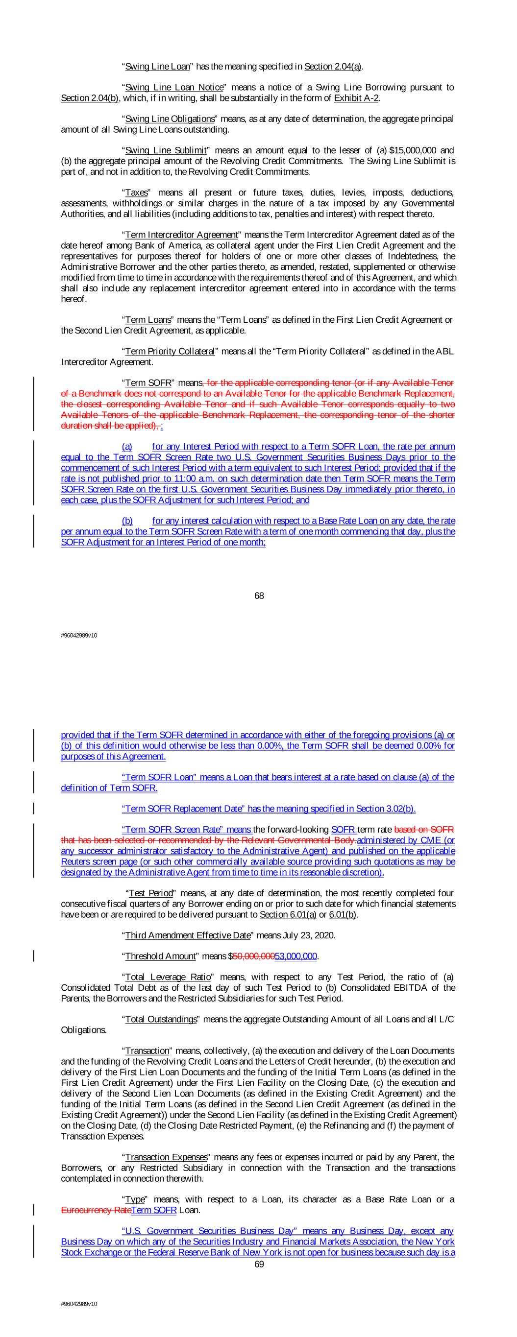 “Swing Line Loan” has the meaning specified in Section 2.04(a). “Swing Line Loan Notice” means a notice of a Swing Line Borrowing pursuant to Section 2.04(b), which, if in writing, shall be substantially in the form of Exhibit A-2. “Swing Line Obligations” means, as at any date of determination, the aggregate principal amount of all Swing Line Loans outstanding. “Swing Line Sublimit” means an amount equal to the lesser of (a) $15,000,000 and (b) the aggregate principal amount of the Revolving Credit Commitments. The Swing Line Sublimit is part of, and not in addition to, the Revolving Credit Commitments. “Taxes” means all present or future taxes, duties, levies, imposts, deductions, assessments, withholdings or similar charges in the nature of a tax imposed by any Governmental Authorities, and all liabilities (including additions to tax, penalties and interest) with respect thereto. “Term Intercreditor Agreement” means the Term Intercreditor Agreement dated as of the date hereof among Bank of America, as collateral agent under the First Lien Credit Agreement and the representatives for purposes thereof for holders of one or more other classes of Indebtedness, the Administrative Borrower and the other parties thereto, as amended, restated, supplemented or otherwise modified from time to time in accordance with the requirements thereof and of this Agreement, and which shall also include any replacement intercreditor agreement entered into in accordance with the terms hereof. “Term Loans” means the “Term Loans” as defined in the First Lien Credit Agreement or the Second Lien Credit Agreement, as applicable. “Term Priority Collateral” means all the “Term Priority Collateral” as defined in the ABL Intercreditor Agreement. “Term SOFR” means, for the applicable corresponding tenor (or if any Available Tenor of a Benchmark does not correspond to an Available Tenor for the applicable Benchmark Replacement, the closest corresponding Available Tenor and if such Available Tenor corresponds equally to two Available Tenors of the applicable Benchmark Replacement, the corresponding tenor of the shorter duration shall be applied), : (a) for any Interest Period with respect to a Term SOFR Loan, the rate per annum equal to the Term SOFR Screen Rate two U.S. Government Securities Business Days prior to the commencement of such Interest Period with a term equivalent to such Interest Period; provided that if the rate is not published prior to 11:00 a.m. on such determination date then Term SOFR means the Term SOFR Screen Rate on the first U.S. Government Securities Business Day immediately prior thereto, in each case, plus the SOFR Adjustment for such Interest Period; and (b) for any interest calculation with respect to a Base Rate Loan on any date, the rate per annum equal to the Term SOFR Screen Rate with a term of one month commencing that day, plus the SOFR Adjustment for an Interest Period of one month; 68 #96042989v10 provided that if the Term SOFR determined in accordance with either of the foregoing provisions (a) or (b) of this definition would otherwise be less than 0.00%, the Term SOFR shall be deemed 0.00% for purposes of this Agreement. “Term SOFR Loan” means a Loan that bears interest at a rate based on clause (a) of the definition of Term SOFR. “Term SOFR Replacement Date” has the meaning specified in Section 3.02(b). “Term SOFR Screen Rate” means the forward-looking SOFR term rate based on SOFR that has been selected or recommended by the Relevant Governmental Body.administered by CME (or any successor administrator satisfactory to the Administrative Agent) and published on the applicable Reuters screen page (or such other commercially available source providing such quotations as may be designated by the Administrative Agent from time to time in its reasonable discretion). “Test Period” means, at any date of determination, the most recently completed four consecutive fiscal quarters of any Borrower ending on or prior to such date for which financial statements have been or are required to be delivered pursuant to Section 6.01(a) or 6.01(b). “Third Amendment Effective Date” means July 23, 2020. “Threshold Amount” means $50,000,00053,000,000. “Total Leverage Ratio” means, with respect to any Test Period, the ratio of (a) Consolidated Total Debt as of the last day of such Test Period to (b) Consolidated EBITDA of the Parents, the Borrowers and the Restricted Subsidiaries for such Test Period. “Total Outstandings” means the aggregate Outstanding Amount of all Loans and all L/C Obligations. “Transaction” means, collectively, (a) the execution and delivery of the Loan Documents and the funding of the Revolving Credit Loans and the Letters of Credit hereunder, (b) the execution and delivery of the First Lien Loan Documents and the funding of the Initial Term Loans (as defined in the First Lien Credit Agreement) under the First Lien Facility on the Closing Date, (c) the execution and delivery of the Second Lien Loan Documents (as defined in the Existing Credit Agreement) and the funding of the Initial Term Loans (as defined in the Second Lien Credit Agreement (as defined in the Existing Credit Agreement)) under the Second Lien Facility (as defined in the Existing Credit Agreement) on the Closing Date, (d) the Closing Date Restricted Payment, (e) the Refinancing and (f) the payment of Transaction Expenses. “Transaction Expenses” means any fees or expenses incurred or paid by any Parent, the Borrowers, or any Restricted Subsidiary in connection with the Transaction and the transactions contemplated in connection therewith. “Type” means, with respect to a Loan, its character as a Base Rate Loan or a Eurocurrency RateTerm SOFR Loan. “U.S. Government Securities Business Day” means any Business Day, except any Business Day on which any of the Securities Industry and Financial Markets Association, the New York Stock
