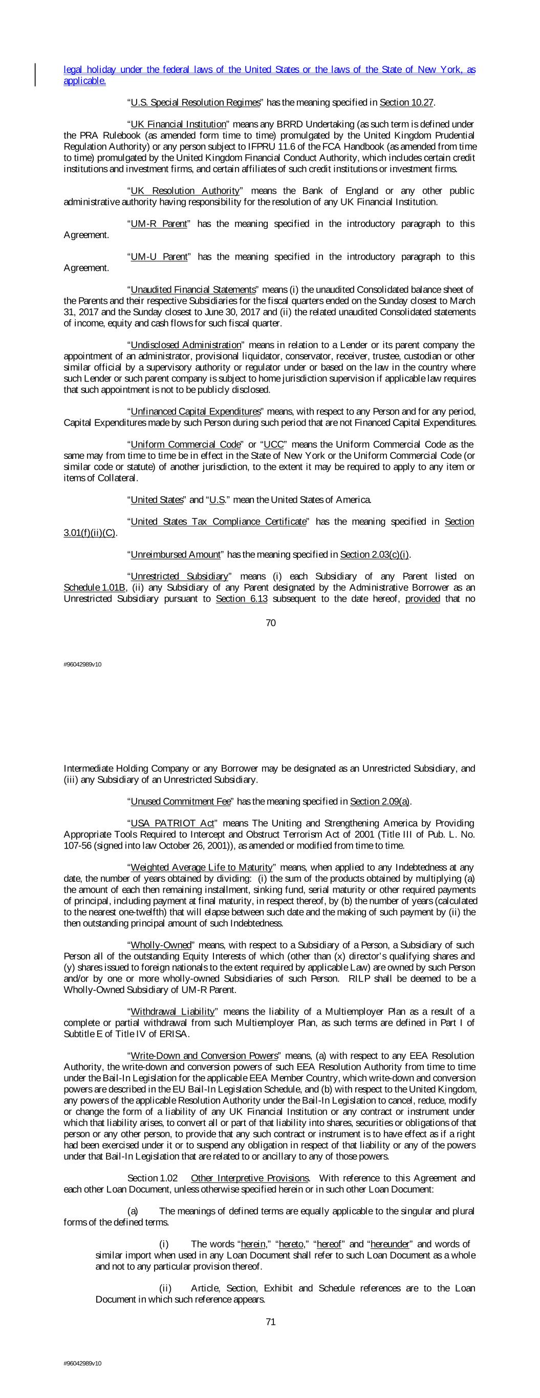 legal holiday under the federal laws of the United States or the laws of the State of New York, as applicable. “U.S. Special Resolution Regimes” has the meaning specified in Section 10.27. “UK Financial Institution” means any BRRD Undertaking (as such term is defined under the PRA Rulebook (as amended form time to time) promulgated by the United Kingdom Prudential Regulation Authority) or any person subject to IFPRU 11.6 of the FCA Handbook (as amended from time to time) promulgated by the United Kingdom Financial Conduct Authority, which includes certain credit institutions and investment firms, and certain affiliates of such credit institutions or investment firms. “UK Resolution Authority” means the Bank of England or any other public administrative authority having responsibility for the resolution of any UK Financial Institution. “UM-R Parent” has the meaning specified in the introductory paragraph to this Agreement. “UM-U Parent” has the meaning specified in the introductory paragraph to this Agreement. “Unaudited Financial Statements” means (i) the unaudited Consolidated balance sheet of the Parents and their respective Subsidiaries for the fiscal quarters ended on the Sunday closest to March 31, 2017 and the Sunday closest to June 30, 2017 and (ii) the related unaudited Consolidated statements of income, equity and cash flows for such fiscal quarter. “Undisclosed Administration” means in relation to a Lender or its parent company the appointment of an administrator, provisional liquidator, conservator, receiver, trustee, custodian or other similar official by a supervisory authority or regulator under or based on the law in the country where such Lender or such parent company is subject to home jurisdiction supervision if applicable law requires that such appointment is not to be publicly disclosed. “Unfinanced Capital Expenditures” means, with respect to any Person and for any period, Capital Expenditures made by such Person during such period that are not Financed Capital Expenditures. “Uniform Commercial Code” or “UCC” means the Uniform Commercial Code as the same may from time to time be in effect in the State of New York or the Uniform Commercial Code (or similar code or statute) of another jurisdiction, to the extent it may be required to apply to any item or items of Collateral. “United States” and “U.S.” mean the United States of America. “United States Tax Compliance Certificate” has the meaning specified in Section 3.01(f)(ii)(C). “Unreimbursed Amount” has the meaning specified in Section 2.03(c)(i). “Unrestricted Subsidiary” means (i) each Subsidiary of any Parent listed on Schedule 1.01B, (ii) any Subsidiary of any Parent designated by the Administrative Borrower as an Unrestricted Subsidiary pursuant to Section 6.13 subsequent to the date hereof, provided that no 70 #96042989v10 Intermediate Holding Company or any Borrower may be designated as an Unrestricted Subsidiary, and (iii) any Subsidiary of an Unrestricted Subsidiary. “Unused Commitment Fee” has the meaning specified in Section 2.09(a). “USA PATRIOT Act” means The Uniting and Strengthening America by Providing Appropriate Tools Required to Intercept and Obstruct Terrorism Act of 2001 (Title III of Pub. L. No. 107-56 (signed into law October 26, 2001)), as amended or modified from time to time. “Weighted Average Life to Maturity” means, when applied to any Indebtedness at any date, the number of years obtained by dividing: (i) the sum of the products obtained by multiplying (a) the amount of each then remaining installment, sinking fund, serial maturity or other required payments of principal, including payment at final maturity, in respect thereof, by (b) the number of years (calculated to the nearest one-twelfth) that will elapse between such date and the making of such payment by (ii) the then outstanding principal amount of such Indebtedness. “Wholly-Owned” means, with respect to a Subsidiary of a Person, a Subsidiary of such Person all of the outstanding Equity Interests of which (other than (x) director’s qualifying shares and (y) shares issued to foreign nationals to the extent required by applicable Law) are owned by such Person and/or by one or more wholly-owned Subsidiaries of such Person. RILP shall be deemed to be a Wholly-Owned Subsidiary of UM-R Parent. “Withdrawal Liability” means the liability of a Multiemployer Plan as a result of a complete or partial withdrawal from such Multiemployer Plan, as such terms are defined in Part I of Subtitle E of Title IV of ERISA. “Write-Down and Conversion Powers” means, (a) with respect to any EEA Resolution Authority, the write-down and conversion powers of such EEA Resolution Authority from time to time under the Bail-In Legislation for the applicable EEA Member Country, which write-down and conversion powers are described in the EU Bail-In Legislation Schedule, and (b) with respect to the United Kingdom, any powers of the applicable Resolution Authority under the Bail-In Legislation to cancel, reduce, modify or change the form of a liability of any UK Financial Institution or any contract or instrument under which that liability arises, to convert all or part of that liability into shares, securities or obligations of that person or any other person, to provide that any such contract or instrument is to have effect as if a right had been exercised under it or to suspend any obligation in respect of that liability or any of the powers under that Bail-In Legislation that are related to or ancillary to any of those powers. Section 1.02 Other Interpretive Provisions. With reference to this Agreement and each other Loan Document, unless otherwise specified herein or in such other Loan Document: (a) The meanings of defined terms are equally applicable to the singular and plural forms of the defined terms. (i) The words “herein,” “hereto,” “hereof” and “hereunder