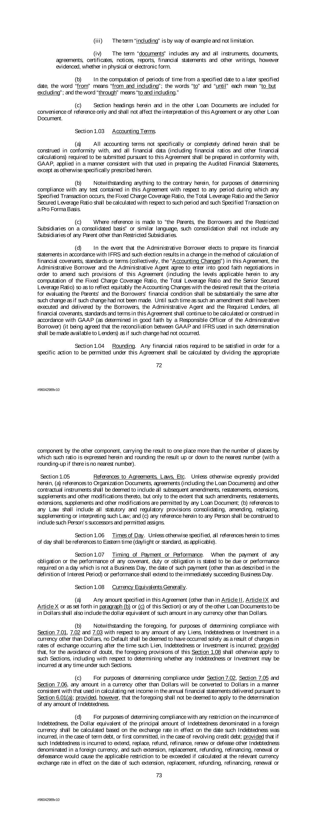 (iii) The term “including” is by way of example and not limitation. (iv) The term “documents” includes any and all instruments, documents, agreements, certificates, notices, reports, financial statements and other writings, however evidenced, whether in physical or electronic form. (b) In the computation of periods of time from a specified date to a later specified date, the word “from” means “from and including”; the words “to” and “until” each mean “to but excluding”; and the word “through” means “to and including.” (c) Section headings herein and in the other Loan Documents are included for convenience of reference only and shall not affect the interpretation of this Agreement or any other Loan Document. Section 1.03 Accounting Terms. (a) All accounting terms not specifically or completely defined herein shall be construed in conformity with, and all financial data (including financial ratios and other financial calculations) required to be submitted pursuant to this Agreement shall be prepared in conformity with, GAAP, applied in a manner consistent with that used in preparing the Audited Financial Statements, except as otherwise specifically prescribed herein. (b) Notwithstanding anything to the contrary herein, for purposes of determining compliance with any test contained in this Agreement with respect to any period during which any Specified Transaction occurs, the Fixed Charge Coverage Ratio, the Total Leverage Ratio and the Senior Secured Leverage Ratio shall be calculated with respect to such period and such Specified Transaction on a Pro Forma Basis. (c) Where reference is made to “the Parents, the Borrowers and the Restricted Subsidiaries on a consolidated basis” or similar language, such consolidation shall not include any Subsidiaries of any Parent other than Restricted Subsidiaries. (d) In the event that the Administrative Borrower elects to prepare its financial statements in accordance with IFRS and such election results in a change in the method of calculation of financial covenants, standards or terms (collectively, the “Accounting Changes”) in this Agreement, the Administrative Borrower and the Administrative Agent agree to enter into good faith negotiations in order to amend such provisions of this Agreement (including the levels applicable herein to any computation of the Fixed Charge Coverage Ratio, the Total Leverage Ratio and the Senior Secured Leverage Ratio) so as to reflect equitably the Accounting Changes with the desired result that the criteria for evaluating the Parents’ and the Borrowers’ financial condition shall be substantially the same after such change as if such change had not been made. Until such time as such an amendment shall have been executed and delivered by the Borrowers, the Administrative Agent and the Required Lenders, all financial covenants, standards and terms in this Agreement shall continue to be calculated or construed in accordance with GAAP (as determined in good faith by a Responsible Officer of the Administrative Borrower) (it being agreed that the reconciliation between GAAP and IFRS used in such determination shall be made available to Lenders) as if such change had not occurred. Section 1.04 Rounding. Any financial ratios required to be satisfied in order for a specific action to be permitted under this Agreement shall be calculated by dividing the appropriate 72 #96042989v10 component by the other component, carrying the result to one place more than the number of places by which such ratio is expressed herein and rounding the result up or down to the nearest number (with a rounding-up if there is no nearest number). Section 1.05 References to Agreements, Laws, Etc. Unless otherwise expressly provided herein, (a) references to Organization Documents, agreements (including the Loan Documents) and other contractual instruments shall be deemed to include all subsequent amendments, restatements, extensions, supplements and other modifications thereto, but only to the extent that such amendments, restatements, extensions, supplements and other modifications are permitted by any Loan Document; (b) references to any Law shall include all statutory and regulatory provisions consolidating, amending, replacing, supplementing or interpreting such Law; and (c) any reference herein to any Person shall be construed to include such Person’s successors and permitted assigns. Section 1.06 Times of Day. Unless otherwise specified, all references herein to times of day shall be references to Eastern time (daylight or standard, as applicable). Section 1.07 Timing of Payment or Performance. When the payment of any obligation or the performance of any covenant, duty or obligation is stated to be due or performance required on a day which is not a Business Day, the date of such payment (other than as described in the definition of Interest Period) or performance shall extend to the immediately succeeding Business Day. Section 1.08 Currency Equivalents Generally. (a) Any amount specified in this Agreement (other than in Article II, Article IX and Article X or as set forth in paragraph (b) or (c) of this Section) or any of the other Loan Documents to be in Dollars shall also include the dollar equivalent of such amount in any currency other than Dollars. (b) Notwithstanding the foregoing, for purposes of determining compliance with Section 7.01, 7.02 and 7.03 with respect to any amount of any Liens, Indebtedness or Investment in a currency other than Dollars, no Default shall be deemed to have occurred solely as a result of changes in rates of exchange occurring after the time such Lien, Indebtedness or Investment is incurred; provided that, for the avoidance of doubt, the foregoing provisions of this Section 1.08 shall otherwise apply to such Sections, including with respect to determining whether any Indebtedness or Investment may be incurred at any time under such Sections. (c) For purposes of de