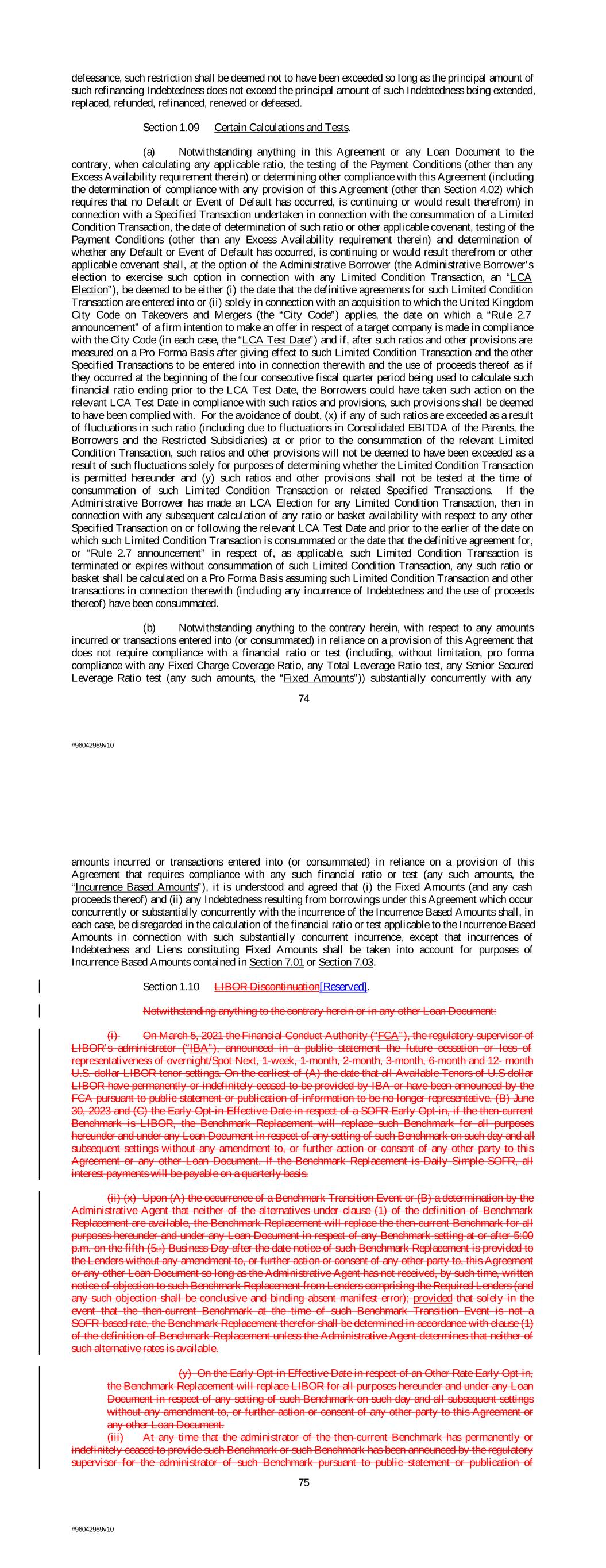 defeasance, such restriction shall be deemed not to have been exceeded so long as the principal amount of such refinancing Indebtedness does not exceed the principal amount of such Indebtedness being extended, replaced, refunded, refinanced, renewed or defeased. Section 1.09 Certain Calculations and Tests. (a) Notwithstanding anything in this Agreement or any Loan Document to the contrary, when calculating any applicable ratio, the testing of the Payment Conditions (other than any Excess Availability requirement therein) or determining other compliance with this Agreement (including the determination of compliance with any provision of this Agreement (other than Section 4.02) which requires that no Default or Event of Default has occurred, is continuing or would result therefrom) in connection with a Specified Transaction undertaken in connection with the consummation of a Limited Condition Transaction, the date of determination of such ratio or other applicable covenant, testing of the Payment Conditions (other than any Excess Availability requirement therein) and determination of whether any Default or Event of Default has occurred, is continuing or would result therefrom or other applicable covenant shall, at the option of the Administrative Borrower (the Administrative Borrower’s election to exercise such option in connection with any Limited Condition Transaction, an “LCA Election”), be deemed to be either (i) the date that the definitive agreements for such Limited Condition Transaction are entered into or (ii) solely in connection with an acquisition to which the United Kingdom City Code on Takeovers and Mergers (the “City Code”) applies, the date on which a “Rule 2.7 announcement” of a firm intention to make an offer in respect of a target company is made in compliance with the City Code (in each case, the “LCA Test Date”) and if, after such ratios and other provisions are measured on a Pro Forma Basis after giving effect to such Limited Condition Transaction and the other Specified Transactions to be entered into in connection therewith and the use of proceeds thereof as if they occurred at the beginning of the four consecutive fiscal quarter period being used to calculate such financial ratio ending prior to the LCA Test Date, the Borrowers could have taken such action on the relevant LCA Test Date in compliance with such ratios and provisions, such provisions shall be deemed to have been complied with. For the avoidance of doubt, (x) if any of such ratios are exceeded as a result of fluctuations in such ratio (including due to fluctuations in Consolidated EBITDA of the Parents, the Borrowers and the Restricted Subsidiaries) at or prior to the consummation of the relevant Limited Condition Transaction, such ratios and other provisions will not be deemed to have been exceeded as a result of such fluctuations solely for purposes of determining whether the Limited Condition Transaction is permitted hereunder and (y) such ratios and other provisions shall not be tested at the time of consummation of such Limited Condition Transaction or related Specified Transactions. If the Administrative Borrower has made an LCA Election for any Limited Condition Transaction, then in connection with any subsequent calculation of any ratio or basket availability with respect to any other Specified Transaction on or following the relevant LCA Test Date and prior to the earlier of the date on which such Limited Condition Transaction is consummated or the date that the definitive agreement for, or “Rule 2.7 announcement” in respect of, as applicable, such Limited Condition Transaction is terminated or expires without consummation of such Limited Condition Transaction, any such ratio or basket shall be calculated on a Pro Forma Basis assuming such Limited Condition Transaction and other transactions in connection therewith (including any incurrence of Indebtedness and the use of proceeds thereof) have been consummated. (b) Notwithstanding anything to the contrary herein, with respect to any amounts incurred or transactions entered into (or consummated) in reliance on a provision of this Agreement that does not require compliance with a financial ratio or test (including, without limitation, pro forma compliance with any Fixed Charge Coverage Ratio, any Total Leverage Ratio test, any Senior Secured Leverage Ratio test (any such amounts, the “Fixed Amounts”)) substantially concurrently with any 74 #96042989v10 amounts incurred or transactions entered into (or consummated) in reliance on a provision of this Agreement that requires compliance with any such financial ratio or test (any such amounts, the “Incurrence Based Amounts”), it is understood and agreed that (i) the Fixed Amounts (and any cash proceeds thereof) and (ii) any Indebtedness resulting from borrowings under this Agreement which occur concurrently or substantially concurrently with the incurrence of the Incurrence Based Amounts shall, in each case, be disregarded in the calculation of the financial ratio or test applicable to the Incurrence Based Amounts in connection with such substantially concurrent incurrence, except that incurrences of Indebtedness and Liens constituting Fixed Amounts shall be taken into account for purposes of Incurrence Based Amounts contained in Section 7.01 or Section 7.03. Section 1.10 LIBOR Discontinuation[Reserved]. Notwithstanding anything to the contrary herein or in any other Loan Document: (i) On March 5, 2021 the Financial Conduct Authority (“FCA”), the regulatory supervisor of LIBOR’s administrator (“IBA”), announced in a public statement the future cessation or loss of representativeness of overnight/Spot Next, 1-week, 1-month, 2-month, 3-month, 6-month and 12- month U.S. dollar LIBOR tenor settings. On the earliest of (A) the date that all Available Tenors of U.S dollar LIBOR have permanently or indefinitely ceased to be provided by IBA or have been announced by th