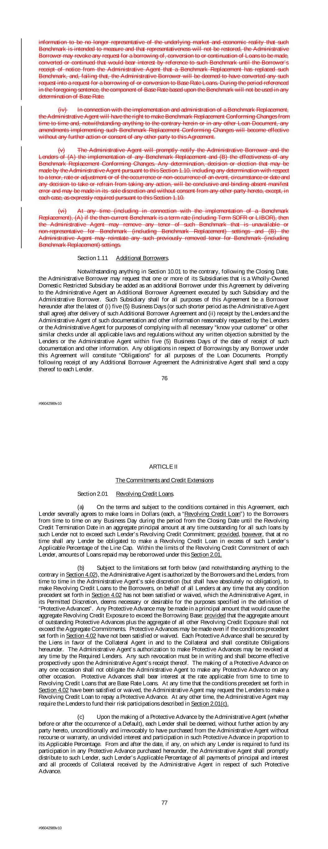 information to be no longer representative of the underlying market and economic reality that such Benchmark is intended to measure and that representativeness will not be restored, the Administrative Borrower may revoke any request for a borrowing of, conversion to or continuation of Loans to be made, converted or continued that would bear interest by reference to such Benchmark until the Borrower’s receipt of notice from the Administrative Agent that a Benchmark Replacement has replaced such Benchmark, and, failing that, the Administrative Borrower will be deemed to have converted any such request into a request for a borrowing of or conversion to Base Rate Loans. During the period referenced in the foregoing sentence, the component of Base Rate based upon the Benchmark will not be used in any determination of Base Rate. (iv) In connection with the implementation and administration of a Benchmark Replacement, the Administrative Agent will have the right to make Benchmark Replacement Conforming Changes from time to time and, notwithstanding anything to the contrary herein or in any other Loan Document, any amendments implementing such Benchmark Replacement Conforming Changes will become effective without any further action or consent of any other party to this Agreement. (v) The Administrative Agent will promptly notify the Administrative Borrower and the Lenders of (A) the implementation of any Benchmark Replacement and (B) the effectiveness of any Benchmark Replacement Conforming Changes. Any determination, decision or election that may be made by the Administrative Agent pursuant to this Section 1.10, including any determination with respect to a tenor, rate or adjustment or of the occurrence or non-occurrence of an event, circumstance or date and any decision to take or refrain from taking any action, will be conclusive and binding absent manifest error and may be made in its sole discretion and without consent from any other party hereto, except, in each case, as expressly required pursuant to this Section 1.10. (vi) At any time (including in connection with the implementation of a Benchmark Replacement), (A) if the then-current Benchmark is a term rate (including Term SOFR or LIBOR), then the Administrative Agent may remove any tenor of such Benchmark that is unavailable or non-representative for Benchmark (including Benchmark Replacement) settings and (B) the Administrative Agent may reinstate any such previously removed tenor for Benchmark (including Benchmark Replacement) settings. Section 1.11 Additional Borrowers. Notwithstanding anything in Section 10.01 to the contrary, following the Closing Date, the Administrative Borrower may request that one or more of its Subsidiaries that is a Wholly-Owned Domestic Restricted Subsidiary be added as an additional Borrower under this Agreement by delivering to the Administrative Agent an Additional Borrower Agreement executed by such Subsidiary and the Administrative Borrower. Such Subsidiary shall for all purposes of this Agreement be a Borrower hereunder after the latest of (i) five (5) Business Days (or such shorter period as the Administrative Agent shall agree) after delivery of such Additional Borrower Agreement and (ii) receipt by the Lenders and the Administrative Agent of such documentation and other information reasonably requested by the Lenders or the Administrative Agent for purposes of complying with all necessary “know your customer” or other similar checks under all applicable laws and regulations without any written objection submitted by the Lenders or the Administrative Agent within five (5) Business Days of the date of receipt of such documentation and other information. Any obligations in respect of Borrowings by any Borrower under this Agreement will constitute “Obligations” for all purposes of the Loan Documents. Promptly following receipt of any Additional Borrower Agreement the Administrative Agent shall send a copy thereof to each Lender. 76 #96042989v10 ARTICLE II The Commitments and Credit Extensions Section 2.01 Revolving Credit Loans. (a) On the terms and subject to the conditions contained in this Agreement, each Lender severally agrees to make loans in Dollars (each, a “Revolving Credit Loan”) to the Borrowers from time to time on any Business Day during the period from the Closing Date until the Revolving Credit Termination Date in an aggregate principal amount at any time outstanding for all such loans by such Lender not to exceed such Lender’s Revolving Credit Commitment; provided, however, that at no time shall any Lender be obligated to make a Revolving Credit Loan in excess of such Lender’s Applicable Percentage of the Line Cap. Within the limits of the Revolving Credit Commitment of each Lender, amounts of Loans repaid may be reborrowed under this Section 2.01. (b) Subject to the limitations set forth below (and notwithstanding anything to the contrary in Section 4.02), the Administrative Agent is authorized by the Borrowers and the Lenders, from time to time in the Administrative Agent’s sole discretion (but shall have absolutely no obligation), to make Revolving Credit Loans to the Borrowers, on behalf of all Lenders at any time that any condition precedent set forth in Section 4.02 has not been satisfied or waived, which the Administrative Agent, in its Permitted Discretion, deems necessary or desirable for the purposes specified in the definition of “Protective Advances”. Any Protective Advance may be made in a principal amount that would cause the aggregate Revolving Credit Exposure to exceed the Borrowing Base; provided that the aggregate amount of outstanding Protective Advances plus the aggregate of all other Revolving Credit Exposure shall not exceed the Aggregate Commitments. Protective Advances may be made even if the conditions precedent set forth in Section 4.02 have not been satisfied or waived. Each Protective Advance shall be secured by the Liens in favor of 