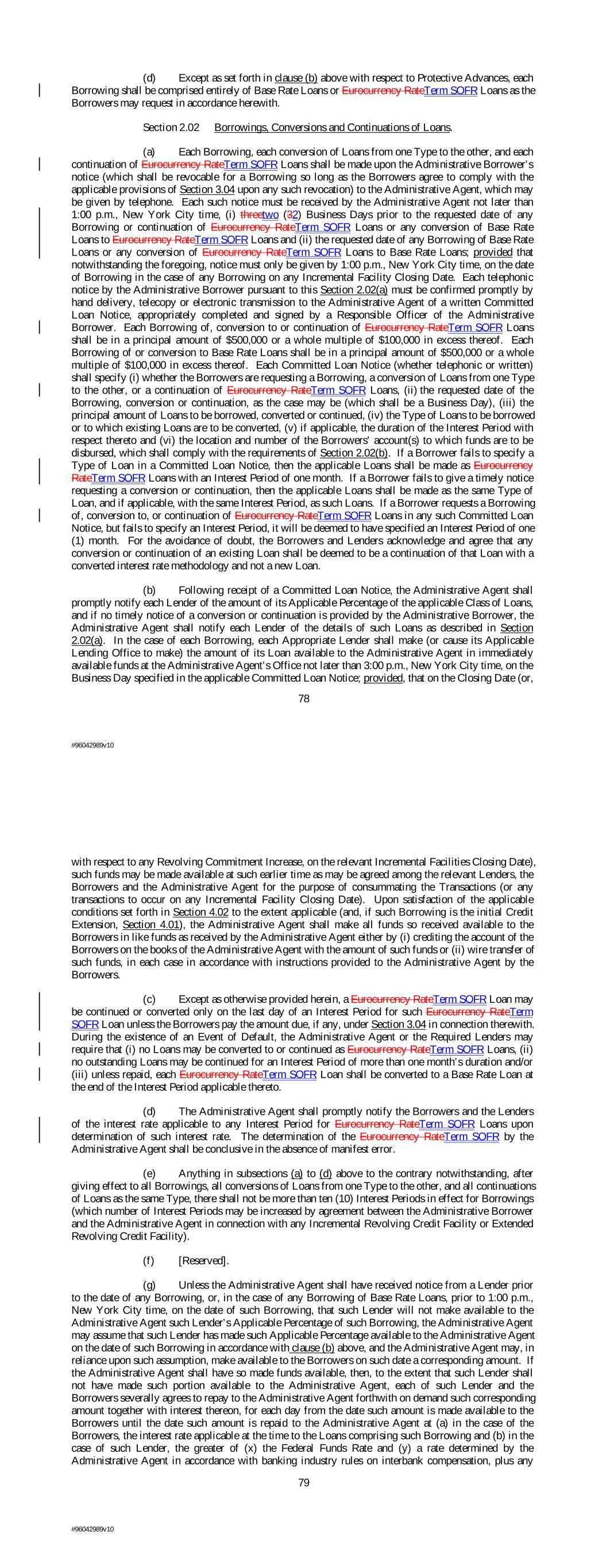 (d) Except as set forth in clause (b) above with respect to Protective Advances, each Borrowing shall be comprised entirely of Base Rate Loans or Eurocurrency RateTerm SOFR Loans as the Borrowers may request in accordance herewith. Section 2.02 Borrowings, Conversions and Continuations of Loans. (a) Each Borrowing, each conversion of Loans from one Type to the other, and each continuation of Eurocurrency RateTerm SOFR Loans shall be made upon the Administrative Borrower’s notice (which shall be revocable for a Borrowing so long as the Borrowers agree to comply with the applicable provisions of Section 3.04 upon any such revocation) to the Administrative Agent, which may be given by telephone. Each such notice must be received by the Administrative Agent not later than 1:00 p.m., New York City time, (i) threetwo (32) Business Days prior to the requested date of any Borrowing or continuation of Eurocurrency RateTerm SOFR Loans or any conversion of Base Rate Loans to Eurocurrency RateTerm SOFR Loans and (ii) the requested date of any Borrowing of Base Rate Loans or any conversion of Eurocurrency RateTerm SOFR Loans to Base Rate Loans; provided that notwithstanding the foregoing, notice must only be given by 1:00 p.m., New York City time, on the date of Borrowing in the case of any Borrowing on any Incremental Facility Closing Date. Each telephonic notice by the Administrative Borrower pursuant to this Section 2.02(a) must be confirmed promptly by hand delivery, telecopy or electronic transmission to the Administrative Agent of a written Committed Loan Notice, appropriately completed and signed by a Responsible Officer of the Administrative Borrower. Each Borrowing of, conversion to or continuation of Eurocurrency RateTerm SOFR Loans shall be in a principal amount of $500,000 or a whole multiple of $100,000 in excess thereof. Each Borrowing of or conversion to Base Rate Loans shall be in a principal amount of $500,000 or a whole multiple of $100,000 in excess thereof. Each Committed Loan Notice (whether telephonic or written) shall specify (i) whether the Borrowers are requesting a Borrowing, a conversion of Loans from one Type to the other, or a continuation of Eurocurrency RateTerm SOFR Loans, (ii) the requested date of the Borrowing, conversion or continuation, as the case may be (which shall be a Business Day), (iii) the principal amount of Loans to be borrowed, converted or continued, (iv) the Type of Loans to be borrowed or to which existing Loans are to be converted, (v) if applicable, the duration of the Interest Period with respect thereto and (vi) the location and number of the Borrowers’ account(s) to which funds are to be disbursed, which shall comply with the requirements of Section 2.02(b). If a Borrower fails to specify a Type of Loan in a Committed Loan Notice, then the applicable Loans shall be made as Eurocurrency RateTerm SOFR Loans with an Interest Period of one month. If a Borrower fails to give a timely notice requesting a conversion or continuation, then the applicable Loans shall be made as the same Type of Loan, and if applicable, with the same Interest Period, as such Loans. If a Borrower requests a Borrowing of, conversion to, or continuation of Eurocurrency RateTerm SOFR Loans in any such Committed Loan Notice, but fails to specify an Interest Period, it will be deemed to have specified an Interest Period of one (1) month. For the avoidance of doubt, the Borrowers and Lenders acknowledge and agree that any conversion or continuation of an existing Loan shall be deemed to be a continuation of that Loan with a converted interest rate methodology and not a new Loan. (b) Following receipt of a Committed Loan Notice, the Administrative Agent shall promptly notify each Lender of the amount of its Applicable Percentage of the applicable Class of Loans, and if no timely notice of a conversion or continuation is provided by the Administrative Borrower, the Administrative Agent shall notify each Lender of the details of such Loans as described in Section 2.02(a). In the case of each Borrowing, each Appropriate Lender shall make (or cause its Applicable Lending Office to make) the amount of its Loan available to the Administrative Agent in immediately available funds at the Administrative Agent’s Office not later than 3:00 p.m., New York City time, on the Business Day specified in the applicable Committed Loan Notice; provided, that on the Closing Date (or, 78 #96042989v10 with respect to any Revolving Commitment Increase, on the relevant Incremental Facilities Closing Date), such funds may be made available at such earlier time as may be agreed among the relevant Lenders, the Borrowers and the Administrative Agent for the purpose of consummating the Transactions (or any transactions to occur on any Incremental Facility Closing Date). Upon satisfaction of the applicable conditions set forth in Section 4.02 to the extent applicable (and, if such Borrowing is the initial Credit Extension, Section 4.01), the Administrative Agent shall make all funds so received available to the Borrowers in like funds as received by the Administrative Agent either by (i) crediting the account of the Borrowers on the books of the Administrative Agent with the amount of such funds or (ii) wire transfer of such funds, in each case in accordance with instructions provided to the Administrative Agent by the Borrowers. (c) Except as otherwise provided herein, a Eurocurrency RateTerm SOFR Loan may be continued or converted only on the last day of an Interest Period for such Eurocurrency RateTerm SOFR Loan unless the Borrowers pay the amount due, if any, under Section 3.04 in connection therewith. During the existence of an Event of Default, the Administrative Agent or the Required Lenders may require that (i) no Loans may be converted to or continued as Eurocurrency RateTerm SOFR Loans, (ii) no outstanding Loans may be continued for an Interest Period of more than one month’s duration and/or (