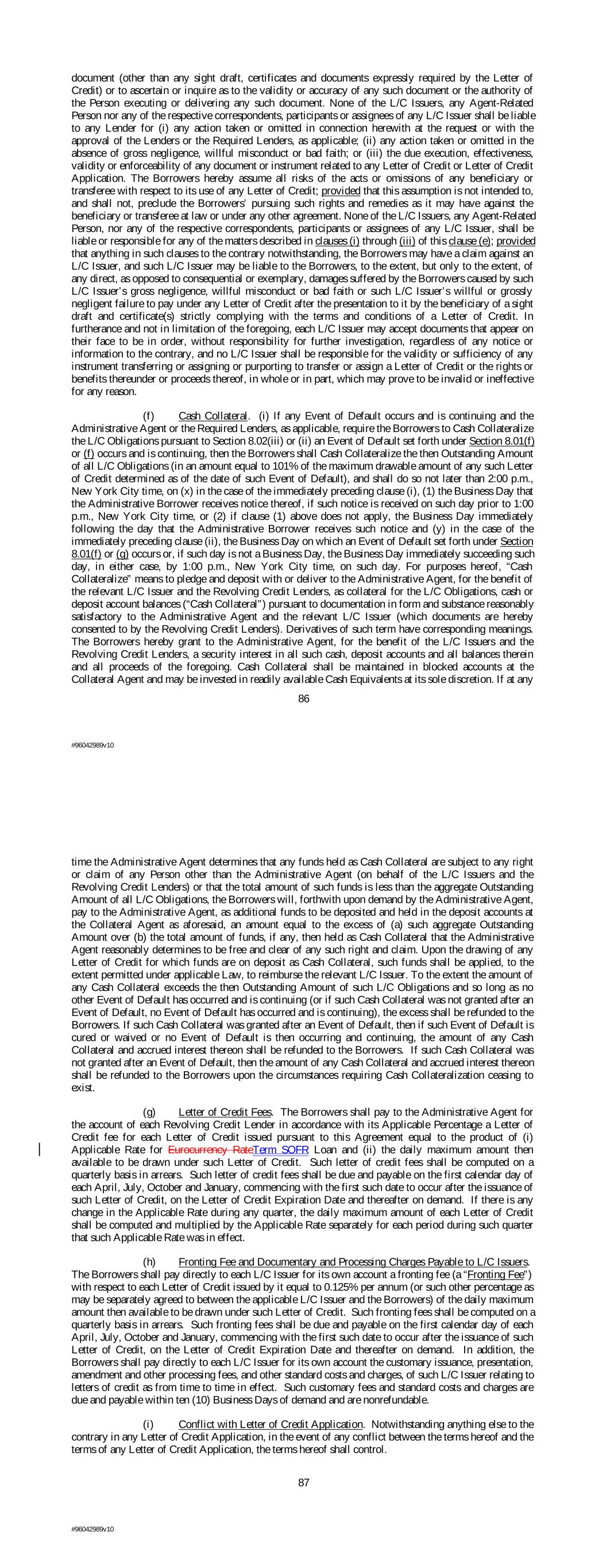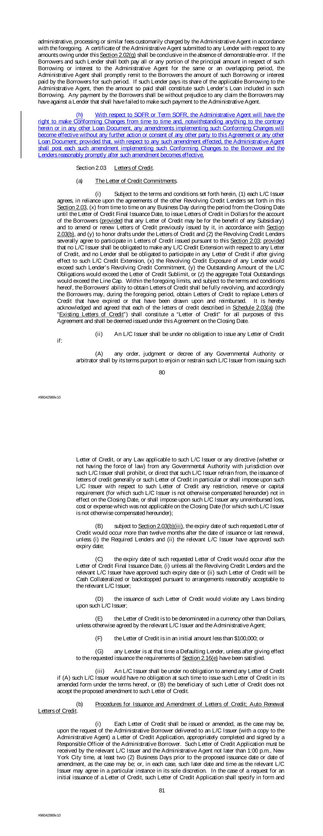 administrative, processing or similar fees customarily charged by the Administrative Agent in accordance with the foregoing. A certificate of the Administrative Agent submitted to any Lender with respect to any amounts owing under this Section 2.02(g) shall be conclusive in the absence of demonstrable error. If the Borrowers and such Lender shall both pay all or any portion of the principal amount in respect of such Borrowing or interest to the Administrative Agent for the same or an overlapping period, the Administrative Agent shall promptly remit to the Borrowers the amount of such Borrowing or interest paid by the Borrowers for such period. If such Lender pays its share of the applicable Borrowing to the Administrative Agent, then the amount so paid shall constitute such Lender’s Loan included in such Borrowing. Any payment by the Borrowers shall be without prejudice to any claim the Borrowers may have against a Lender that shall have failed to make such payment to the Administrative Agent. (h) With respect to SOFR or Term SOFR, the Administrative Agent will have the right to make Conforming Changes from time to time and, notwithstanding anything to the contrary herein or in any other Loan Document, any amendments implementing such Conforming Changes will become effective without any further action or consent of any other party to this Agreement or any other Loan Document; provided that, with respect to any such amendment effected, the Administrative Agent shall post each such amendment implementing such Conforming Changes to the Borrower and the Lenders reasonably promptly after such amendment becomes effective. Section 2.03 Letters of Credit. (a) The Letter of Credit Commitments. (i) Subject to the terms and conditions set forth herein, (1) each L/C Issuer agrees, in reliance upon the agreements of the other Revolving Credit Lenders set forth in this Section 2.03, (x) from time to time on any Business Day during the period from the Closing Date until the Letter of Credit Final Issuance Date, to issue Letters of Credit in Dollars for the account of the Borrowers (provided that any Letter of Credit may be for the benefit of any Subsidiary) and to amend or renew Letters of Credit previously issued by it, in accordance with Section 2.03(b), and (y) to honor drafts under the Letters of Credit and (2) the Revolving Credit Lenders severally agree to participate in Letters of Credit issued pursuant to this Section 2.03; provided that no L/C Issuer shall be obligated to make any L/C Credit Extension with respect to any Letter of Credit, and no Lender shall be obligated to participate in any Letter of Credit if after giving effect to such L/C Credit Extension, (x) the Revolving Credit Exposure of any Lender would exceed such Lender’s Revolving Credit Commitment, (y) the Outstanding Amount of the L/C Obligations would exceed the Letter of Credit Sublimit, or (z) the aggregate Total Outstandings would exceed the Line Cap. Within the foregoing limits, and subject to the terms and conditions hereof, the Borrowers’ ability to obtain Letters of Credit shall be fully revolving, and accordingly the Borrowers may, during the foregoing period, obtain Letters of Credit to replace Letters of Credit that have expired or that have been drawn upon and reimbursed. It is hereby acknowledged and agreed that each of the letters of credit described in Schedule 2.03(a) (the “Existing Letters of Credit”) shall constitute a “Letter of Credit” for all purposes of this Agreement and shall be deemed issued under this Agreement on the Closing Date. (ii) An L/C Issuer shall be under no obligation to issue any Letter of Credit if: (A) any order, judgment or decree of any Governmental Authority or arbitrator shall by its terms purport to enjoin or restrain such L/C Issuer from issuing such 80 #96042989v10 Letter of Credit, or any Law applicable to such L/C Issuer or any directive (whether or not having the force of law) from any Governmental Authority with jurisdiction over such L/C Issuer shall prohibit, or direct that such L/C Issuer refrain from, the issuance of letters of credit generally or such Letter of Credit in particular or shall impose upon such L/C Issuer with respect to such Letter of Credit any restriction, reserve or capital requirement (for which such L/C Issuer is not otherwise compensated hereunder) not in effect on the Closing Date, or shall impose upon such L/C Issuer any unreimbursed loss, cost or expense which was not applicable on the Closing Date (for which such L/C Issuer is not otherwise compensated hereunder); (B) subject to Section 2.03(b)(iii), the expiry date of such requested Letter of Credit would occur more than twelve months after the date of issuance or last renewal, unless (i) the Required Lenders and (ii) the relevant L/C Issuer have approved such expiry date; (C) the expiry date of such requested Letter of Credit would occur after the Letter of Credit Final Issuance Date, (i) unless all the Revolving Credit Lenders and the relevant L/C Issuer have approved such expiry date or (ii) such Letter of Credit will be Cash Collateralized or backstopped pursuant to arrangements reasonably acceptable to the relevant L/C Issuer; (D) the issuance of such Letter of Credit would violate any Laws binding upon such L/C Issuer; (E) the Letter of Credit is to be denominated in a currency other than Dollars, unless otherwise agreed by the relevant L/C Issuer and the Administrative Agent; (F) the Letter of Credit is in an initial amount less than $100,000; or (G) any Lender is at that time a Defaulting Lender, unless after giving effect to the requested issuance the requirements of Section 2.16(e) have been satisfied. (iii) An L/C Issuer shall be under no obligation to amend any Letter of Credit if (A) such L/C Issuer would have no obligation at such time to issue such Letter of Credit in its amended form under the terms hereof, or (B) the beneficiary of such Letter of Credit does not accep