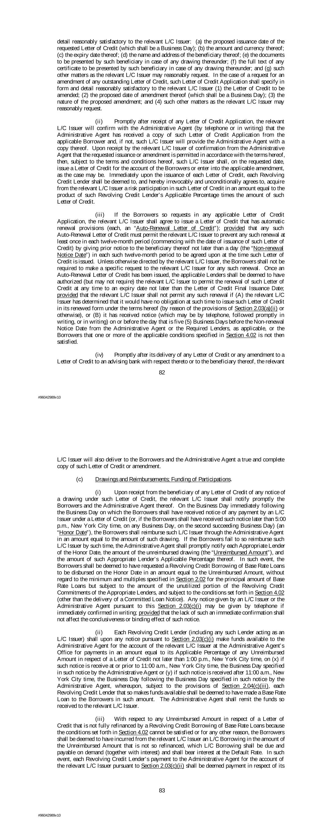 detail reasonably satisfactory to the relevant L/C Issuer: (a) the proposed issuance date of the requested Letter of Credit (which shall be a Business Day); (b) the amount and currency thereof; (c) the expiry date thereof; (d) the name and address of the beneficiary thereof; (e) the documents to be presented by such beneficiary in case of any drawing thereunder; (f) the full text of any certificate to be presented by such beneficiary in case of any drawing thereunder; and (g) such other matters as the relevant L/C Issuer may reasonably request. In the case of a request for an amendment of any outstanding Letter of Credit, such Letter of Credit Application shall specify in form and detail reasonably satisfactory to the relevant L/C Issuer (1) the Letter of Credit to be amended; (2) the proposed date of amendment thereof (which shall be a Business Day); (3) the nature of the proposed amendment; and (4) such other matters as the relevant L/C Issuer may reasonably request. (ii) Promptly after receipt of any Letter of Credit Application, the relevant L/C Issuer will confirm with the Administrative Agent (by telephone or in writing) that the Administrative Agent has received a copy of such Letter of Credit Application from the applicable Borrower and, if not, such L/C Issuer will provide the Administrative Agent with a copy thereof. Upon receipt by the relevant L/C Issuer of confirmation from the Administrative Agent that the requested issuance or amendment is permitted in accordance with the terms hereof, then, subject to the terms and conditions hereof, such L/C Issuer shall, on the requested date, issue a Letter of Credit for the account of the Borrowers or enter into the applicable amendment, as the case may be. Immediately upon the issuance of each Letter of Credit, each Revolving Credit Lender shall be deemed to, and hereby irrevocably and unconditionally agrees to, acquire from the relevant L/C Issuer a risk participation in such Letter of Credit in an amount equal to the product of such Revolving Credit Lender’s Applicable Percentage times the amount of such Letter of Credit. (iii) If the Borrowers so requests in any applicable Letter of Credit Application, the relevant L/C Issuer shall agree to issue a Letter of Credit that has automatic renewal provisions (each, an “Auto-Renewal Letter of Credit”); provided that any such Auto-Renewal Letter of Credit must permit the relevant L/C Issuer to prevent any such renewal at least once in each twelve-month period (commencing with the date of issuance of such Letter of Credit) by giving prior notice to the beneficiary thereof not later than a day (the “Non-renewal Notice Date”) in each such twelve-month period to be agreed upon at the time such Letter of Credit is issued. Unless otherwise directed by the relevant L/C Issuer, the Borrowers shall not be required to make a specific request to the relevant L/C Issuer for any such renewal. Once an Auto-Renewal Letter of Credit has been issued, the applicable Lenders shall be deemed to have authorized (but may not require) the relevant L/C Issuer to permit the renewal of such Letter of Credit at any time to an expiry date not later than the Letter of Credit Final Issuance Date; provided that the relevant L/C Issuer shall not permit any such renewal if (A) the relevant L/C Issuer has determined that it would have no obligation at such time to issue such Letter of Credit in its renewed form under the terms hereof (by reason of the provisions of Section 2.03(a)(ii) or otherwise), or (B) it has received notice (which may be by telephone, followed promptly in writing, or in writing) on or before the day that is five (5) Business Days before the Non-renewal Notice Date from the Administrative Agent or the Required Lenders, as applicable, or the Borrowers that one or more of the applicable conditions specified in Section 4.02 is not then satisfied. (iv) Promptly after its delivery of any Letter of Credit or any amendment to a Letter of Credit to an advising bank with respect thereto or to the beneficiary thereof, the relevant 82 #96042989v10 L/C Issuer will also deliver to the Borrowers and the Administrative Agent a true and complete copy of such Letter of Credit or amendment. (c) Drawings and Reimbursements; Funding of Participations. (i) Upon receipt from the beneficiary of any Letter of Credit of any notice of a drawing under such Letter of Credit, the relevant L/C Issuer shall notify promptly the Borrowers and the Administrative Agent thereof. On the Business Day immediately following the Business Day on which the Borrowers shall have received notice of any payment by an L/C Issuer under a Letter of Credit (or, if the Borrowers shall have received such notice later than 5:00 p.m., New York City time, on any Business Day, on the second succeeding Business Day) (an “Honor Date”), the Borrowers shall reimburse such L/C Issuer through the Administrative Agent in an amount equal to the amount of such drawing. If the Borrowers fail to so reimburse such L/C Issuer by such time, the Administrative Agent shall promptly notify each Appropriate Lender of the Honor Date, the amount of the unreimbursed drawing (the “Unreimbursed Amount”), and the amount of such Appropriate Lender’s Applicable Percentage thereof. In such event, the Borrowers shall be deemed to have requested a Revolving Credit Borrowing of Base Rate Loans to be disbursed on the Honor Date in an amount equal to the Unreimbursed Amount, without regard to the minimum and multiples specified in Section 2.02 for the principal amount of Base Rate Loans but subject to the amount of the unutilized portion of the Revolving Credit Commitments of the Appropriate Lenders, and subject to the conditions set forth in Section 4.02 (other than the delivery of a Committed Loan Notice). Any notice given by an L/C Issuer or the Administrative Agent pursuant to this Section 2.03(c)(i) may be given by telephone if immediately confirmed in writing; pr