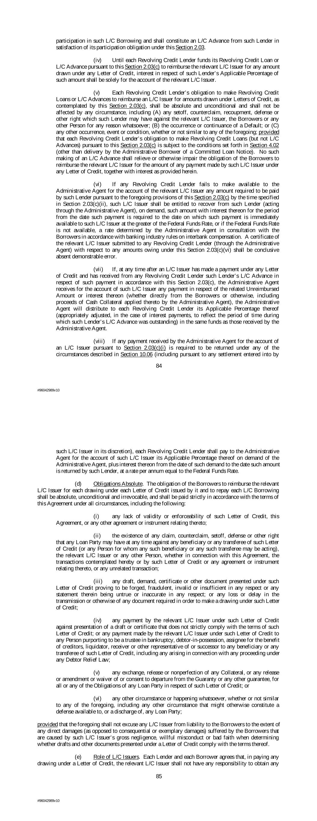 participation in such L/C Borrowing and shall constitute an L/C Advance from such Lender in satisfaction of its participation obligation under this Section 2.03. (iv) Until each Revolving Credit Lender funds its Revolving Credit Loan or L/C Advance pursuant to this Section 2.03(c) to reimburse the relevant L/C Issuer for any amount drawn under any Letter of Credit, interest in respect of such Lender’s Applicable Percentage of such amount shall be solely for the account of the relevant L/C Issuer. (v) Each Revolving Credit Lender’s obligation to make Revolving Credit Loans or L/C Advances to reimburse an L/C Issuer for amounts drawn under Letters of Credit, as contemplated by this Section 2.03(c), shall be absolute and unconditional and shall not be affected by any circumstance, including (A) any setoff, counterclaim, recoupment, defense or other right which such Lender may have against the relevant L/C Issuer, the Borrowers or any other Person for any reason whatsoever; (B) the occurrence or continuance of a Default; or (C) any other occurrence, event or condition, whether or not similar to any of the foregoing; provided that each Revolving Credit Lender’s obligation to make Revolving Credit Loans (but not L/C Advances) pursuant to this Section 2.03(c) is subject to the conditions set forth in Section 4.02 (other than delivery by the Administrative Borrower of a Committed Loan Notice). No such making of an L/C Advance shall relieve or otherwise impair the obligation of the Borrowers to reimburse the relevant L/C Issuer for the amount of any payment made by such L/C Issuer under any Letter of Credit, together with interest as provided herein. (vi) If any Revolving Credit Lender fails to make available to the Administrative Agent for the account of the relevant L/C Issuer any amount required to be paid by such Lender pursuant to the foregoing provisions of this Section 2.03(c) by the time specified in Section 2.03(c)(ii), such L/C Issuer shall be entitled to recover from such Lender (acting through the Administrative Agent), on demand, such amount with interest thereon for the period from the date such payment is required to the date on which such payment is immediately available to such L/C Issuer at the greater of the Federal Funds Rate, or if the Federal Funds Rate is not available, a rate determined by the Administrative Agent in consultation with the Borrowers in accordance with banking industry rules on interbank compensation. A certificate of the relevant L/C Issuer submitted to any Revolving Credit Lender (through the Administrative Agent) with respect to any amounts owing under this Section 2.03(c)(vi) shall be conclusive absent demonstrable error. (vii) If, at any time after an L/C Issuer has made a payment under any Letter of Credit and has received from any Revolving Credit Lender such Lender’s L/C Advance in respect of such payment in accordance with this Section 2.03(c), the Administrative Agent receives for the account of such L/C Issuer any payment in respect of the related Unreimbursed Amount or interest thereon (whether directly from the Borrowers or otherwise, including proceeds of Cash Collateral applied thereto by the Administrative Agent), the Administrative Agent will distribute to each Revolving Credit Lender its Applicable Percentage thereof (appropriately adjusted, in the case of interest payments, to reflect the period of time during which such Lender’s L/C Advance was outstanding) in the same funds as those received by the Administrative Agent. (viii) If any payment received by the Administrative Agent for the account of an L/C Issuer pursuant to Section 2.03(c)(i) is required to be returned under any of the circumstances described in Section 10.06 (including pursuant to any settlement entered into by 84 #96042989v10 such L/C Issuer in its discretion), each Revolving Credit Lender shall pay to the Administrative Agent for the account of such L/C Issuer its Applicable Percentage thereof on demand of the Administrative Agent, plus interest thereon from the date of such demand to the date such amount is returned by such Lender, at a rate per annum equal to the Federal Funds Rate. (d) Obligations Absolute. The obligation of the Borrowers to reimburse the relevant L/C Issuer for each drawing under each Letter of Credit issued by it and to repay each L/C Borrowing shall be absolute, unconditional and irrevocable, and shall be paid strictly in accordance with the terms of this Agreement under all circumstances, including the following: (i) any lack of validity or enforceability of such Letter of Credit, this Agreement, or any other agreement or instrument relating thereto; (ii) the existence of any claim, counterclaim, setoff, defense or other right that any Loan Party may have at any time against any beneficiary or any transferee of such Letter of Credit (or any Person for whom any such beneficiary or any such transferee may be acting), the relevant L/C Issuer or any other Person, whether in connection with this Agreement, the transactions contemplated hereby or by such Letter of Credit or any agreement or instrument relating thereto, or any unrelated transaction; (iii) any draft, demand, certificate or other document presented under such Letter of Credit proving to be forged, fraudulent, invalid or insufficient in any respect or any statement therein being untrue or inaccurate in any respect; or any loss or delay in the transmission or otherwise of any document required in order to make a drawing under such Letter of Credit; (iv) any payment by the relevant L/C Issuer under such Letter of Credit against presentation of a draft or certificate that does not strictly comply with the terms of such Letter of Credit; or any payment made by the relevant L/C Issuer under such Letter of Credit to any Person purporting to be a trustee in bankruptcy, debtor-in-possession, assignee for the benefit of creditors, liquidator, receiver or other representative of or success