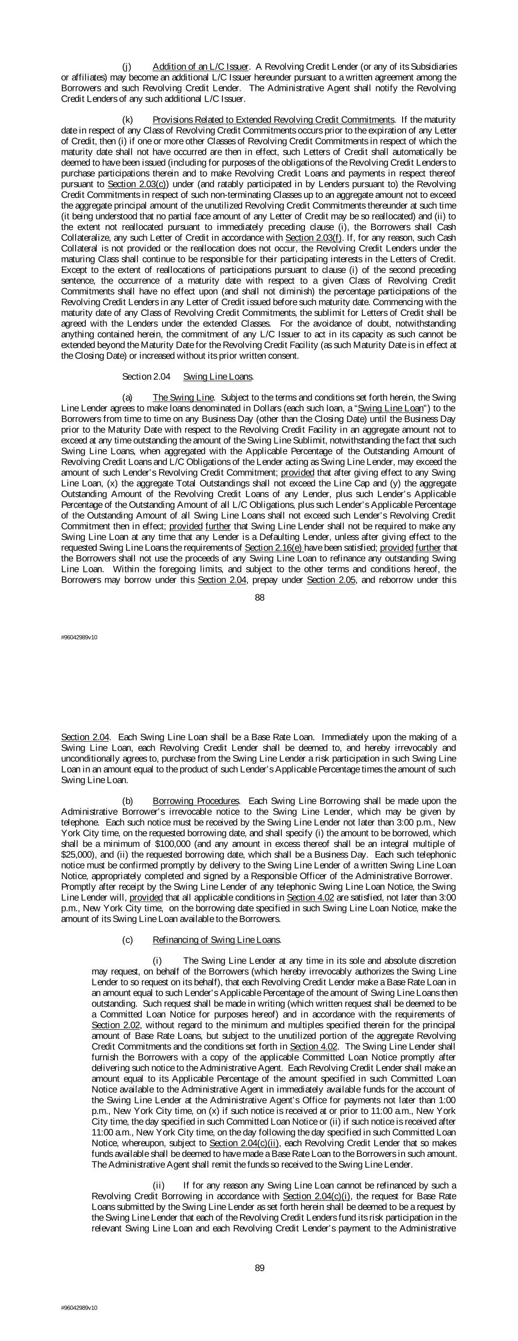 (j) Addition of an L/C Issuer. A Revolving Credit Lender (or any of its Subsidiaries or affiliates) may become an additional L/C Issuer hereunder pursuant to a written agreement among the Borrowers and such Revolving Credit Lender. The Administrative Agent shall notify the Revolving Credit Lenders of any such additional L/C Issuer. (k) Provisions Related to Extended Revolving Credit Commitments. If the maturity date in respect of any Class of Revolving Credit Commitments occurs prior to the expiration of any Letter of Credit, then (i) if one or more other Classes of Revolving Credit Commitments in respect of which the maturity date shall not have occurred are then in effect, such Letters of Credit shall automatically be deemed to have been issued (including for purposes of the obligations of the Revolving Credit Lenders to purchase participations therein and to make Revolving Credit Loans and payments in respect thereof pursuant to Section 2.03(c)) under (and ratably participated in by Lenders pursuant to) the Revolving Credit Commitments in respect of such non-terminating Classes up to an aggregate amount not to exceed the aggregate principal amount of the unutilized Revolving Credit Commitments thereunder at such time (it being understood that no partial face amount of any Letter of Credit may be so reallocated) and (ii) to the extent not reallocated pursuant to immediately preceding clause (i), the Borrowers shall Cash Collateralize, any such Letter of Credit in accordance with Section 2.03(f). If, for any reason, such Cash Collateral is not provided or the reallocation does not occur, the Revolving Credit Lenders under the maturing Class shall continue to be responsible for their participating interests in the Letters of Credit. Except to the extent of reallocations of participations pursuant to clause (i) of the second preceding sentence, the occurrence of a maturity date with respect to a given Class of Revolving Credit Commitments shall have no effect upon (and shall not diminish) the percentage participations of the Revolving Credit Lenders in any Letter of Credit issued before such maturity date. Commencing with the maturity date of any Class of Revolving Credit Commitments, the sublimit for Letters of Credit shall be agreed with the Lenders under the extended Classes. For the avoidance of doubt, notwithstanding anything contained herein, the commitment of any L/C Issuer to act in its capacity as such cannot be extended beyond the Maturity Date for the Revolving Credit Facility (as such Maturity Date is in effect at the Closing Date) or increased without its prior written consent. Section 2.04 Swing Line Loans. (a) The Swing Line. Subject to the terms and conditions set forth herein, the Swing Line Lender agrees to make loans denominated in Dollars (each such loan, a “Swing Line Loan”) to the Borrowers from time to time on any Business Day (other than the Closing Date) until the Business Day prior to the Maturity Date with respect to the Revolving Credit Facility in an aggregate amount not to exceed at any time outstanding the amount of the Swing Line Sublimit, notwithstanding the fact that such Swing Line Loans, when aggregated with the Applicable Percentage of the Outstanding Amount of Revolving Credit Loans and L/C Obligations of the Lender acting as Swing Line Lender, may exceed the amount of such Lender’s Revolving Credit Commitment; provided that after giving effect to any Swing Line Loan, (x) the aggregate Total Outstandings shall not exceed the Line Cap and (y) the aggregate Outstanding Amount of the Revolving Credit Loans of any Lender, plus such Lender’s Applicable Percentage of the Outstanding Amount of all L/C Obligations, plus such Lender’s Applicable Percentage of the Outstanding Amount of all Swing Line Loans shall not exceed such Lender’s Revolving Credit Commitment then in effect; provided further that Swing Line Lender shall not be required to make any Swing Line Loan at any time that any Lender is a Defaulting Lender, unless after giving effect to the requested Swing Line Loans the requirements of Section 2.16(e) have been satisfied; provided further that the Borrowers shall not use the proceeds of any Swing Line Loan to refinance any outstanding Swing Line Loan. Within the foregoing limits, and subject to the other terms and conditions hereof, the Borrowers may borrow under this Section 2.04, prepay under Section 2.05, and reborrow under this 88 #96042989v10 Section 2.04. Each Swing Line Loan shall be a Base Rate Loan. Immediately upon the making of a Swing Line Loan, each Revolving Credit Lender shall be deemed to, and hereby irrevocably and unconditionally agrees to, purchase from the Swing Line Lender a risk participation in such Swing Line Loan in an amount equal to the product of such Lender’s Applicable Percentage times the amount of such Swing Line Loan. (b) Borrowing Procedures. Each Swing Line Borrowing shall be made upon the Administrative Borrower’s irrevocable notice to the Swing Line Lender, which may be given by telephone. Each such notice must be received by the Swing Line Lender not later than 3:00 p.m., New York City time, on the requested borrowing date, and shall specify (i) the amount to be borrowed, which shall be a minimum of $100,000 (and any amount in excess thereof shall be an integral multiple of $25,000), and (ii) the requested borrowing date, which shall be a Business Day. Each such telephonic notice must be confirmed promptly by delivery to the Swing Line Lender of a written Swing Line Loan Notice, appropriately completed and signed by a Responsible Officer of the Administrative Borrower. Promptly after receipt by the Swing Line Lender of any telephonic Swing Line Loan Notice, the Swing Line Lender will, provided that all applicable conditions in Section 4.02 are satisfied, not later than 3:00 p.m., New York City time, on the borrowing date specified in such Swing Line Loan Notice, make the amount of its Swing Line