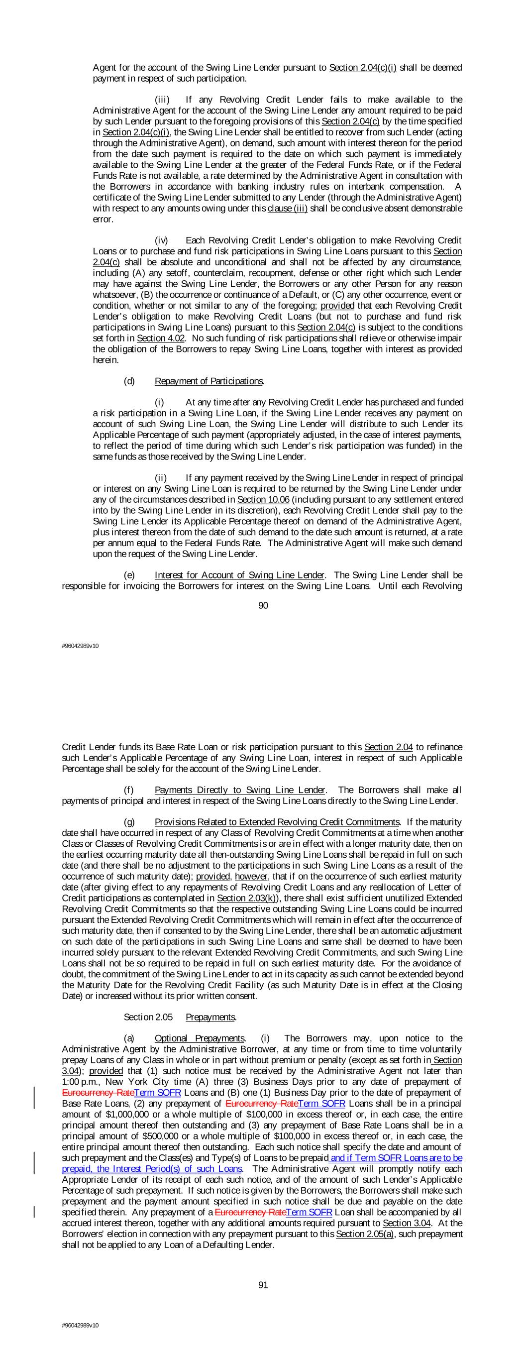 Agent for the account of the Swing Line Lender pursuant to Section 2.04(c)(i) shall be deemed payment in respect of such participation. (iii) If any Revolving Credit Lender fails to make available to the Administrative Agent for the account of the Swing Line Lender any amount required to be paid by such Lender pursuant to the foregoing provisions of this Section 2.04(c) by the time specified in Section 2.04(c)(i), the Swing Line Lender shall be entitled to recover from such Lender (acting through the Administrative Agent), on demand, such amount with interest thereon for the period from the date such payment is required to the date on which such payment is immediately available to the Swing Line Lender at the greater of the Federal Funds Rate, or if the Federal Funds Rate is not available, a rate determined by the Administrative Agent in consultation with the Borrowers in accordance with banking industry rules on interbank compensation. A certificate of the Swing Line Lender submitted to any Lender (through the Administrative Agent) with respect to any amounts owing under this clause (iii) shall be conclusive absent demonstrable error. (iv) Each Revolving Credit Lender’s obligation to make Revolving Credit Loans or to purchase and fund risk participations in Swing Line Loans pursuant to this Section 2.04(c) shall be absolute and unconditional and shall not be affected by any circumstance, including (A) any setoff, counterclaim, recoupment, defense or other right which such Lender may have against the Swing Line Lender, the Borrowers or any other Person for any reason whatsoever, (B) the occurrence or continuance of a Default, or (C) any other occurrence, event or condition, whether or not similar to any of the foregoing; provided that each Revolving Credit Lender’s obligation to make Revolving Credit Loans (but not to purchase and fund risk participations in Swing Line Loans) pursuant to this Section 2.04(c) is subject to the conditions set forth in Section 4.02. No such funding of risk participations shall relieve or otherwise impair the obligation of the Borrowers to repay Swing Line Loans, together with interest as provided herein. (d) Repayment of Participations. (i) At any time after any Revolving Credit Lender has purchased and funded a risk participation in a Swing Line Loan, if the Swing Line Lender receives any payment on account of such Swing Line Loan, the Swing Line Lender will distribute to such Lender its Applicable Percentage of such payment (appropriately adjusted, in the case of interest payments, to reflect the period of time during which such Lender’s risk participation was funded) in the same funds as those received by the Swing Line Lender. (ii) If any payment received by the Swing Line Lender in respect of principal or interest on any Swing Line Loan is required to be returned by the Swing Line Lender under any of the circumstances described in Section 10.06 (including pursuant to any settlement entered into by the Swing Line Lender in its discretion), each Revolving Credit Lender shall pay to the Swing Line Lender its Applicable Percentage thereof on demand of the Administrative Agent, plus interest thereon from the date of such demand to the date such amount is returned, at a rate per annum equal to the Federal Funds Rate. The Administrative Agent will make such demand upon the request of the Swing Line Lender. (e) Interest for Account of Swing Line Lender. The Swing Line Lender shall be responsible for invoicing the Borrowers for interest on the Swing Line Loans. Until each Revolving 90 #96042989v10 Credit Lender funds its Base Rate Loan or risk participation pursuant to this Section 2.04 to refinance such Lender’s Applicable Percentage of any Swing Line Loan, interest in respect of such Applicable Percentage shall be solely for the account of the Swing Line Lender. (f) Payments Directly to Swing Line Lender. The Borrowers shall make all payments of principal and interest in respect of the Swing Line Loans directly to the Swing Line Lender. (g) Provisions Related to Extended Revolving Credit Commitments. If the maturity date shall have occurred in respect of any Class of Revolving Credit Commitments at a time when another Class or Classes of Revolving Credit Commitments is or are in effect with a longer maturity date, then on the earliest occurring maturity date all then-outstanding Swing Line Loans shall be repaid in full on such date (and there shall be no adjustment to the participations in such Swing Line Loans as a result of the occurrence of such maturity date); provided, however, that if on the occurrence of such earliest maturity date (after giving effect to any repayments of Revolving Credit Loans and any reallocation of Letter of Credit participations as contemplated in Section 2.03(k)), there shall exist sufficient unutilized Extended Revolving Credit Commitments so that the respective outstanding Swing Line Loans could be incurred pursuant the Extended Revolving Credit Commitments which will remain in effect after the occurrence of such maturity date, then if consented to by the Swing Line Lender, there shall be an automatic adjustment on such date of the participations in such Swing Line Loans and same shall be deemed to have been incurred solely pursuant to the relevant Extended Revolving Credit Commitments, and such Swing Line Loans shall not be so required to be repaid in full on such earliest maturity date. For the avoidance of doubt, the commitment of the Swing Line Lender to act in its capacity as such cannot be extended beyond the Maturity Date for the Revolving Credit Facility (as such Maturity Date is in effect at the Closing Date) or increased without its prior written consent. Section 2.05 Prepayments. (a) Optional Prepayments. (i) The Borrowers may, upon notice to the Administrative Agent by the Administrative Borrower, at any time or from time to time voluntarily prepay Loans of any Class in whole or in part without premium or pe