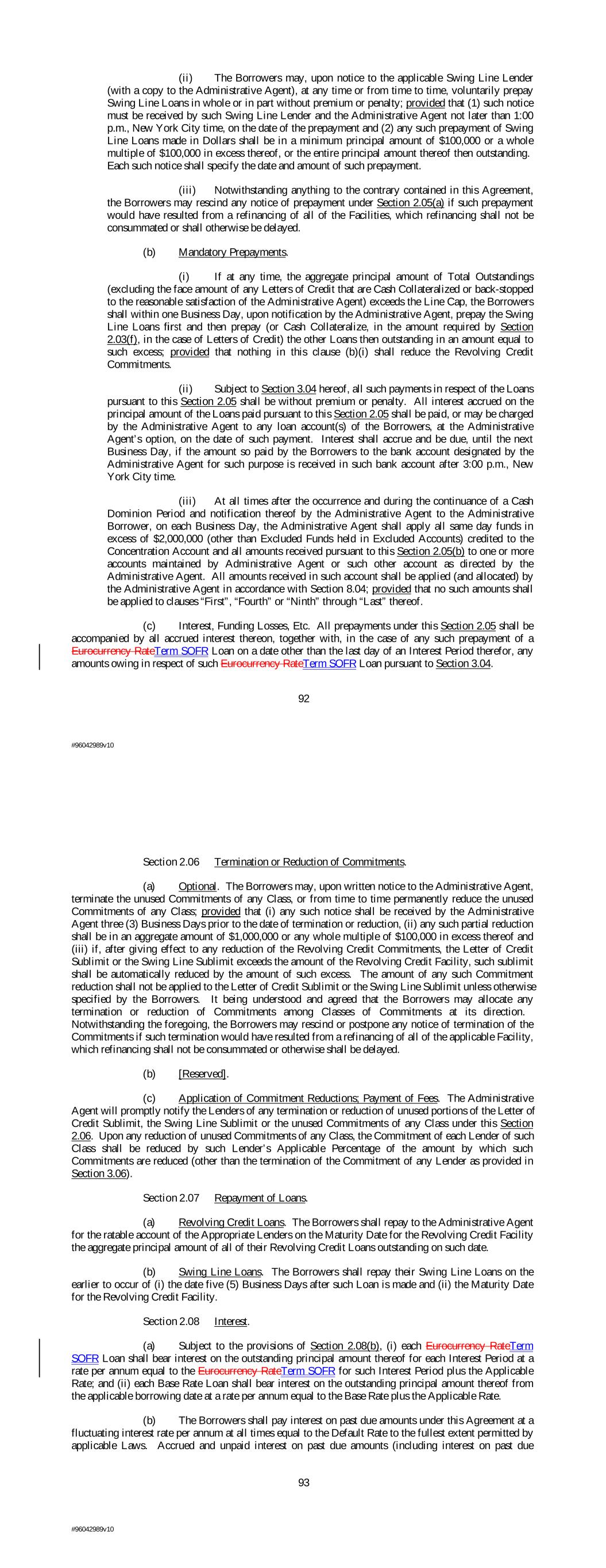 (ii) The Borrowers may, upon notice to the applicable Swing Line Lender (with a copy to the Administrative Agent), at any time or from time to time, voluntarily prepay Swing Line Loans in whole or in part without premium or penalty; provided that (1) such notice must be received by such Swing Line Lender and the Administrative Agent not later than 1:00 p.m., New York City time, on the date of the prepayment and (2) any such prepayment of Swing Line Loans made in Dollars shall be in a minimum principal amount of $100,000 or a whole multiple of $100,000 in excess thereof, or the entire principal amount thereof then outstanding. Each such notice shall specify the date and amount of such prepayment. (iii) Notwithstanding anything to the contrary contained in this Agreement, the Borrowers may rescind any notice of prepayment under Section 2.05(a) if such prepayment would have resulted from a refinancing of all of the Facilities, which refinancing shall not be consummated or shall otherwise be delayed. (b) Mandatory Prepayments. (i) If at any time, the aggregate principal amount of Total Outstandings (excluding the face amount of any Letters of Credit that are Cash Collateralized or back-stopped to the reasonable satisfaction of the Administrative Agent) exceeds the Line Cap, the Borrowers shall within one Business Day, upon notification by the Administrative Agent, prepay the Swing Line Loans first and then prepay (or Cash Collateralize, in the amount required by Section 2.03(f), in the case of Letters of Credit) the other Loans then outstanding in an amount equal to such excess; provided that nothing in this clause (b)(i) shall reduce the Revolving Credit Commitments. (ii) Subject to Section 3.04 hereof, all such payments in respect of the Loans pursuant to this Section 2.05 shall be without premium or penalty. All interest accrued on the principal amount of the Loans paid pursuant to this Section 2.05 shall be paid, or may be charged by the Administrative Agent to any loan account(s) of the Borrowers, at the Administrative Agent’s option, on the date of such payment. Interest shall accrue and be due, until the next Business Day, if the amount so paid by the Borrowers to the bank account designated by the Administrative Agent for such purpose is received in such bank account after 3:00 p.m., New York City time. (iii) At all times after the occurrence and during the continuance of a Cash Dominion Period and notification thereof by the Administrative Agent to the Administrative Borrower, on each Business Day, the Administrative Agent shall apply all same day funds in excess of $2,000,000 (other than Excluded Funds held in Excluded Accounts) credited to the Concentration Account and all amounts received pursuant to this Section 2.05(b) to one or more accounts maintained by Administrative Agent or such other account as directed by the Administrative Agent. All amounts received in such account shall be applied (and allocated) by the Administrative Agent in accordance with Section 8.04; provided that no such amounts shall be applied to clauses “First”, “Fourth” or “Ninth” through “Last” thereof. (c) Interest, Funding Losses, Etc. All prepayments under this Section 2.05 shall be accompanied by all accrued interest thereon, together with, in the case of any such prepayment of a Eurocurrency RateTerm SOFR Loan on a date other than the last day of an Interest Period therefor, any amounts owing in respect of such Eurocurrency RateTerm SOFR Loan pursuant to Section 3.04. 92 #96042989v10 Section 2.06 Termination or Reduction of Commitments. (a) Optional. The Borrowers may, upon written notice to the Administrative Agent, terminate the unused Commitments of any Class, or from time to time permanently reduce the unused Commitments of any Class; provided that (i) any such notice shall be received by the Administrative Agent three (3) Business Days prior to the date of termination or reduction, (ii) any such partial reduction shall be in an aggregate amount of $1,000,000 or any whole multiple of $100,000 in excess thereof and (iii) if, after giving effect to any reduction of the Revolving Credit Commitments, the Letter of Credit Sublimit or the Swing Line Sublimit exceeds the amount of the Revolving Credit Facility, such sublimit shall be automatically reduced by the amount of such excess. The amount of any such Commitment reduction shall not be applied to the Letter of Credit Sublimit or the Swing Line Sublimit unless otherwise specified by the Borrowers. It being understood and agreed that the Borrowers may allocate any termination or reduction of Commitments among Classes of Commitments at its direction. Notwithstanding the foregoing, the Borrowers may rescind or postpone any notice of termination of the Commitments if such termination would have resulted from a refinancing of all of the applicable Facility, which refinancing shall not be consummated or otherwise shall be delayed. (b) [Reserved]. (c) Application of Commitment Reductions; Payment of Fees. The Administrative Agent will promptly notify the Lenders of any termination or reduction of unused portions of the Letter of Credit Sublimit, the Swing Line Sublimit or the unused Commitments of any Class under this Section 2.06. Upon any reduction of unused Commitments of any Class, the Commitment of each Lender of such Class shall be reduced by such Lender’s Applicable Percentage of the amount by which such Commitments are reduced (other than the termination of the Commitment of any Lender as provided in Section 3.06). Section 2.07 Repayment of Loans. (a) Revolving Credit Loans. The Borrowers shall repay to the Administrative Agent for the ratable account of the Appropriate Lenders on the Maturity Date for the Revolving Credit Facility the aggregate principal amount of all of their Revolving Credit Loans outstanding on such date. (b) Swing Line Loans. The Borrowers shall repay their Swing Line Loans on the earlier to occur of (i) th