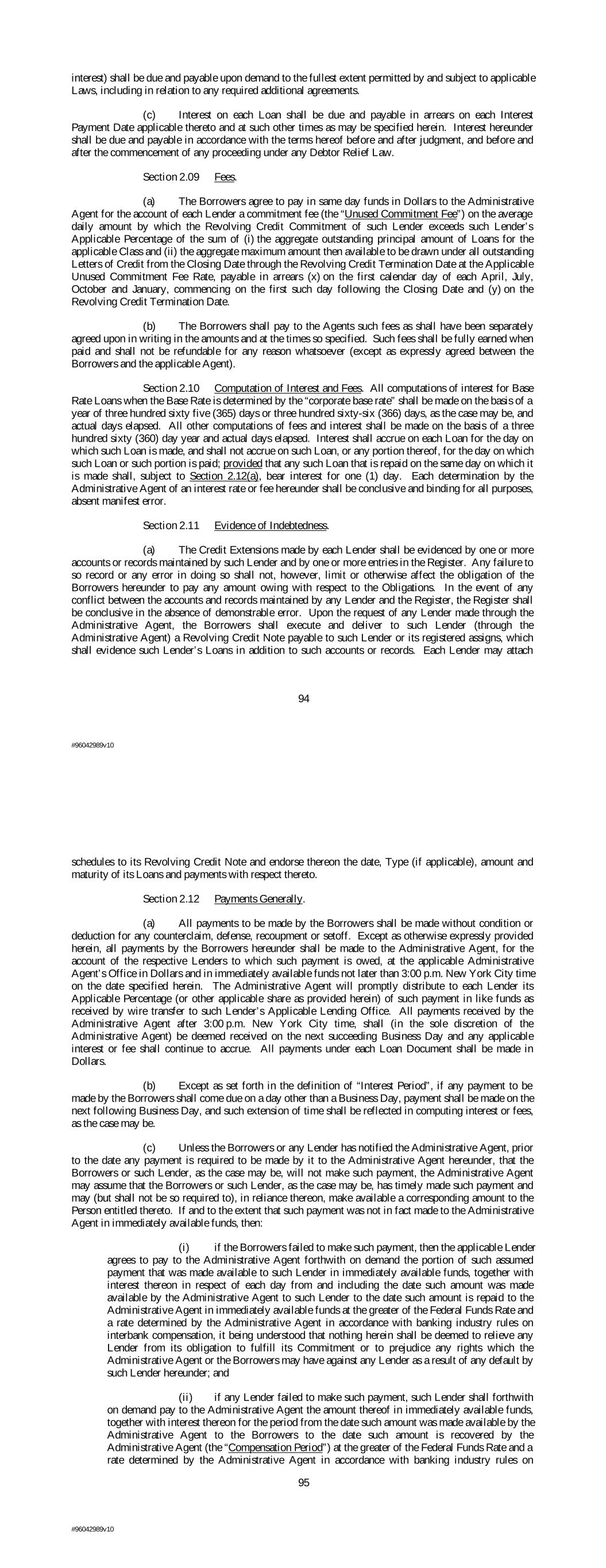 interest) shall be due and payable upon demand to the fullest extent permitted by and subject to applicable Laws, including in relation to any required additional agreements. (c) Interest on each Loan shall be due and payable in arrears on each Interest Payment Date applicable thereto and at such other times as may be specified herein. Interest hereunder shall be due and payable in accordance with the terms hereof before and after judgment, and before and after the commencement of any proceeding under any Debtor Relief Law. Section 2.09 Fees. (a) The Borrowers agree to pay in same day funds in Dollars to the Administrative Agent for the account of each Lender a commitment fee (the “Unused Commitment Fee”) on the average daily amount by which the Revolving Credit Commitment of such Lender exceeds such Lender’s Applicable Percentage of the sum of (i) the aggregate outstanding principal amount of Loans for the applicable Class and (ii) the aggregate maximum amount then available to be drawn under all outstanding Letters of Credit from the Closing Date through the Revolving Credit Termination Date at the Applicable Unused Commitment Fee Rate, payable in arrears (x) on the first calendar day of each April, July, October and January, commencing on the first such day following the Closing Date and (y) on the Revolving Credit Termination Date. (b) The Borrowers shall pay to the Agents such fees as shall have been separately agreed upon in writing in the amounts and at the times so specified. Such fees shall be fully earned when paid and shall not be refundable for any reason whatsoever (except as expressly agreed between the Borrowers and the applicable Agent). Section 2.10 Computation of Interest and Fees. All computations of interest for Base Rate Loans when the Base Rate is determined by the “corporate base rate” shall be made on the basis of a year of three hundred sixty five (365) days or three hundred sixty-six (366) days, as the case may be, and actual days elapsed. All other computations of fees and interest shall be made on the basis of a three hundred sixty (360) day year and actual days elapsed. Interest shall accrue on each Loan for the day on which such Loan is made, and shall not accrue on such Loan, or any portion thereof, for the day on which such Loan or such portion is paid; provided that any such Loan that is repaid on the same day on which it is made shall, subject to Section 2.12(a), bear interest for one (1) day. Each determination by the Administrative Agent of an interest rate or fee hereunder shall be conclusive and binding for all purposes, absent manifest error. Section 2.11 Evidence of Indebtedness. (a) The Credit Extensions made by each Lender shall be evidenced by one or more accounts or records maintained by such Lender and by one or more entries in the Register. Any failure to so record or any error in doing so shall not, however, limit or otherwise affect the obligation of the Borrowers hereunder to pay any amount owing with respect to the Obligations. In the event of any conflict between the accounts and records maintained by any Lender and the Register, the Register shall be conclusive in the absence of demonstrable error. Upon the request of any Lender made through the Administrative Agent, the Borrowers shall execute and deliver to such Lender (through the Administrative Agent) a Revolving Credit Note payable to such Lender or its registered assigns, which shall evidence such Lender’s Loans in addition to such accounts or records. Each Lender may attach 94 #96042989v10 schedules to its Revolving Credit Note and endorse thereon the date, Type (if applicable), amount and maturity of its Loans and payments with respect thereto. Section 2.12 Payments Generally. (a) All payments to be made by the Borrowers shall be made without condition or deduction for any counterclaim, defense, recoupment or setoff. Except as otherwise expressly provided herein, all payments by the Borrowers hereunder shall be made to the Administrative Agent, for the account of the respective Lenders to which such payment is owed, at the applicable Administrative Agent’s Office in Dollars and in immediately available funds not later than 3:00 p.m. New York City time on the date specified herein. The Administrative Agent will promptly distribute to each Lender its Applicable Percentage (or other applicable share as provided herein) of such payment in like funds as received by wire transfer to such Lender’s Applicable Lending Office. All payments received by the Administrative Agent after 3:00 p.m. New York City time, shall (in the sole discretion of the Administrative Agent) be deemed received on the next succeeding Business Day and any applicable interest or fee shall continue to accrue. All payments under each Loan Document shall be made in Dollars. (b) Except as set forth in the definition of “Interest Period”, if any payment to be made by the Borrowers shall come due on a day other than a Business Day, payment shall be made on the next following Business Day, and such extension of time shall be reflected in computing interest or fees, as the case may be. (c) Unless the Borrowers or any Lender has notified the Administrative Agent, prior to the date any payment is required to be made by it to the Administrative Agent hereunder, that the Borrowers or such Lender, as the case may be, will not make such payment, the Administrative Agent may assume that the Borrowers or such Lender, as the case may be, has timely made such payment and may (but shall not be so required to), in reliance thereon, make available a corresponding amount to the Person entitled thereto. If and to the extent that such payment was not in fact made to the Administrative Agent in immediately available funds, then: (i) if the Borrowers failed to make such payment, then the applicable Lender agrees to pay to the Administrative Agent forthwith on demand the portion of such assumed payment that was made avai