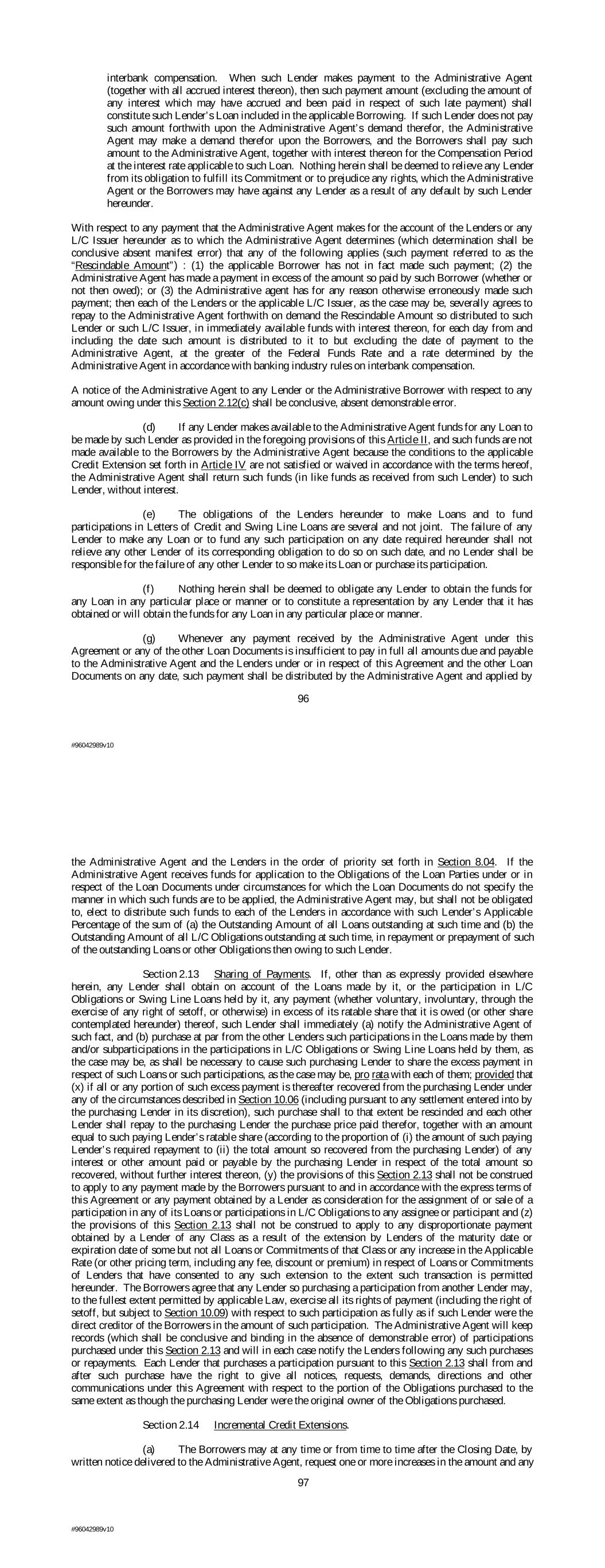 interbank compensation. When such Lender makes payment to the Administrative Agent (together with all accrued interest thereon), then such payment amount (excluding the amount of any interest which may have accrued and been paid in respect of such late payment) shall constitute such Lender’s Loan included in the applicable Borrowing. If such Lender does not pay such amount forthwith upon the Administrative Agent’s demand therefor, the Administrative Agent may make a demand therefor upon the Borrowers, and the Borrowers shall pay such amount to the Administrative Agent, together with interest thereon for the Compensation Period at the interest rate applicable to such Loan. Nothing herein shall be deemed to relieve any Lender from its obligation to fulfill its Commitment or to prejudice any rights, which the Administrative Agent or the Borrowers may have against any Lender as a result of any default by such Lender hereunder. With respect to any payment that the Administrative Agent makes for the account of the Lenders or any L/C Issuer hereunder as to which the Administrative Agent determines (which determination shall be conclusive absent manifest error) that any of the following applies (such payment referred to as the “Rescindable Amount”) : (1) the applicable Borrower has not in fact made such payment; (2) the Administrative Agent has made a payment in excess of the amount so paid by such Borrower (whether or not then owed); or (3) the Administrative agent has for any reason otherwise erroneously made such payment; then each of the Lenders or the applicable L/C Issuer, as the case may be, severally agrees to repay to the Administrative Agent forthwith on demand the Rescindable Amount so distributed to such Lender or such L/C Issuer, in immediately available funds with interest thereon, for each day from and including the date such amount is distributed to it to but excluding the date of payment to the Administrative Agent, at the greater of the Federal Funds Rate and a rate determined by the Administrative Agent in accordance with banking industry rules on interbank compensation. A notice of the Administrative Agent to any Lender or the Administrative Borrower with respect to any amount owing under this Section 2.12(c) shall be conclusive, absent demonstrable error. (d) If any Lender makes available to the Administrative Agent funds for any Loan to be made by such Lender as provided in the foregoing provisions of this Article II, and such funds are not made available to the Borrowers by the Administrative Agent because the conditions to the applicable Credit Extension set forth in Article IV are not satisfied or waived in accordance with the terms hereof, the Administrative Agent shall return such funds (in like funds as received from such Lender) to such Lender, without interest. (e) The obligations of the Lenders hereunder to make Loans and to fund participations in Letters of Credit and Swing Line Loans are several and not joint. The failure of any Lender to make any Loan or to fund any such participation on any date required hereunder shall not relieve any other Lender of its corresponding obligation to do so on such date, and no Lender shall be responsible for the failure of any other Lender to so make its Loan or purchase its participation. (f) Nothing herein shall be deemed to obligate any Lender to obtain the funds for any Loan in any particular place or manner or to constitute a representation by any Lender that it has obtained or will obtain the funds for any Loan in any particular place or manner. (g) Whenever any payment received by the Administrative Agent under this Agreement or any of the other Loan Documents is insufficient to pay in full all amounts due and payable to the Administrative Agent and the Lenders under or in respect of this Agreement and the other Loan Documents on any date, such payment shall be distributed by the Administrative Agent and applied by 96 #96042989v10 the Administrative Agent and the Lenders in the order of priority set forth in Section 8.04. If the Administrative Agent receives funds for application to the Obligations of the Loan Parties under or in respect of the Loan Documents under circumstances for which the Loan Documents do not specify the manner in which such funds are to be applied, the Administrative Agent may, but shall not be obligated to, elect to distribute such funds to each of the Lenders in accordance with such Lender’s Applicable Percentage of the sum of (a) the Outstanding Amount of all Loans outstanding at such time and (b) the Outstanding Amount of all L/C Obligations outstanding at such time, in repayment or prepayment of such of the outstanding Loans or other Obligations then owing to such Lender. Section 2.13 Sharing of Payments. If, other than as expressly provided elsewhere herein, any Lender shall obtain on account of the Loans made by it, or the participation in L/C Obligations or Swing Line Loans held by it, any payment (whether voluntary, involuntary, through the exercise of any right of setoff, or otherwise) in excess of its ratable share that it is owed (or other share contemplated hereunder) thereof, such Lender shall immediately (a) notify the Administrative Agent of such fact, and (b) purchase at par from the other Lenders such participations in the Loans made by them and/or subparticipations in the participations in L/C Obligations or Swing Line Loans held by them, as the case may be, as shall be necessary to cause such purchasing Lender to share the excess payment in respect of such Loans or such participations, as the case may be, pro rata with each of them; provided that (x) if all or any portion of such excess payment is thereafter recovered from the purchasing Lender under any of the circumstances described in Section 10.06 (including pursuant to any settlement entered into by the purchasing Lender in its discretion), such purchase shall to that extent be rescinded and each other Lender shall
