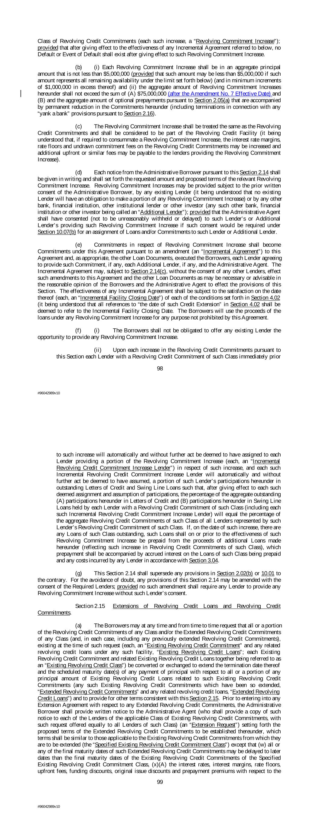 Class of Revolving Credit Commitments (each such increase, a “Revolving Commitment Increase”); provided that after giving effect to the effectiveness of any Incremental Agreement referred to below, no Default or Event of Default shall exist after giving effect to such Revolving Commitment Increase. (b) (i) Each Revolving Commitment Increase shall be in an aggregate principal amount that is not less than $5,000,000 (provided that such amount may be less than $5,000,000 if such amount represents all remaining availability under the limit set forth below) (and in minimum increments of $1,000,000 in excess thereof) and (ii) the aggregate amount of Revolving Commitment Increases hereunder shall not exceed the sum of (A) $75,000,000 (after the Amendment No. 7 Effective Date) and (B) and the aggregate amount of optional prepayments pursuant to Section 2.05(a) that are accompanied by permanent reduction in the Commitments hereunder (including terminations in connection with any “yank a bank” provisions pursuant to Section 2.16). (c) The Revolving Commitment Increase shall be treated the same as the Revolving Credit Commitments and shall be considered to be part of the Revolving Credit Facility (it being understood that, if required to consummate a Revolving Commitment Increase, the interest rate margins, rate floors and undrawn commitment fees on the Revolving Credit Commitments may be increased and additional upfront or similar fees may be payable to the lenders providing the Revolving Commitment Increase). (d) Each notice from the Administrative Borrower pursuant to this Section 2.14 shall be given in writing and shall set forth the requested amount and proposed terms of the relevant Revolving Commitment Increase. Revolving Commitment Increases may be provided subject to the prior written consent of the Administrative Borrower, by any existing Lender (it being understood that no existing Lender will have an obligation to make a portion of any Revolving Commitment Increase) or by any other bank, financial institution, other institutional lender or other investor (any such other bank, financial institution or other investor being called an “Additional Lender”); provided that the Administrative Agent shall have consented (not to be unreasonably withheld or delayed) to such Lender’s or Additional Lender’s providing such Revolving Commitment Increase if such consent would be required under Section 10.07(b) for an assignment of Loans and/or Commitments to such Lender or Additional Lender. (e) Commitments in respect of Revolving Commitment Increase shall become Commitments under this Agreement pursuant to an amendment (an “Incremental Agreement”) to this Agreement and, as appropriate, the other Loan Documents, executed the Borrowers, each Lender agreeing to provide such Commitment, if any, each Additional Lender, if any, and the Administrative Agent. The Incremental Agreement may, subject to Section 2.14(c), without the consent of any other Lenders, effect such amendments to this Agreement and the other Loan Documents as may be necessary or advisable in the reasonable opinion of the Borrowers and the Administrative Agent to effect the provisions of this Section. The effectiveness of any Incremental Agreement shall be subject to the satisfaction on the date thereof (each, an “Incremental Facility Closing Date”) of each of the conditions set forth in Section 4.02 (it being understood that all references to “the date of such Credit Extension” in Section 4.02 shall be deemed to refer to the Incremental Facility Closing Date. The Borrowers will use the proceeds of the loans under any Revolving Commitment Increase for any purpose not prohibited by this Agreement. (f) (i) The Borrowers shall not be obligated to offer any existing Lender the opportunity to provide any Revolving Commitment Increase. (ii) Upon each increase in the Revolving Credit Commitments pursuant to this Section each Lender with a Revolving Credit Commitment of such Class immediately prior 98 #96042989v10 to such increase will automatically and without further act be deemed to have assigned to each Lender providing a portion of the Revolving Commitment Increase (each, an “Incremental Revolving Credit Commitment Increase Lender”) in respect of such increase, and each such Incremental Revolving Credit Commitment Increase Lender will automatically and without further act be deemed to have assumed, a portion of such Lender’s participations hereunder in outstanding Letters of Credit and Swing Line Loans such that, after giving effect to each such deemed assignment and assumption of participations, the percentage of the aggregate outstanding (A) participations hereunder in Letters of Credit and (B) participations hereunder in Swing Line Loans held by each Lender with a Revolving Credit Commitment of such Class (including each such Incremental Revolving Credit Commitment Increase Lender) will equal the percentage of the aggregate Revolving Credit Commitments of such Class of all Lenders represented by such Lender’s Revolving Credit Commitment of such Class. If, on the date of such increase, there are any Loans of such Class outstanding, such Loans shall on or prior to the effectiveness of such Revolving Commitment Increase be prepaid from the proceeds of additional Loans made hereunder (reflecting such increase in Revolving Credit Commitments of such Class), which prepayment shall be accompanied by accrued interest on the Loans of such Class being prepaid and any costs incurred by any Lender in accordance with Section 3.04. (g) This Section 2.14 shall supersede any provisions in Section 2.02(b) or 10.01 to the contrary. For the avoidance of doubt, any provisions of this Section 2.14 may be amended with the consent of the Required Lenders; provided no such amendment shall require any Lender to provide any Revolving Commitment Increase without such Lender’s consent. Section 2.15 Extensions of Revolving Credit 