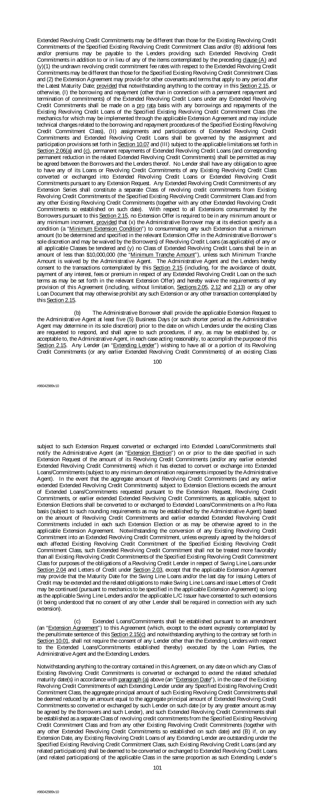 Extended Revolving Credit Commitments may be different than those for the Existing Revolving Credit Commitments of the Specified Existing Revolving Credit Commitment Class and/or (B) additional fees and/or premiums may be payable to the Lenders providing such Extended Revolving Credit Commitments in addition to or in lieu of any of the items contemplated by the preceding clause (A) and (y)(1) the undrawn revolving credit commitment fee rates with respect to the Extended Revolving Credit Commitments may be different than those for the Specified Existing Revolving Credit Commitment Class and (2) the Extension Agreement may provide for other covenants and terms that apply to any period after the Latest Maturity Date; provided that notwithstanding anything to the contrary in this Section 2.15, or otherwise, (I) the borrowing and repayment (other than in connection with a permanent repayment and termination of commitments) of the Extended Revolving Credit Loans under any Extended Revolving Credit Commitments shall be made on a pro rata basis with any borrowings and repayments of the Existing Revolving Credit Loans of the Specified Existing Revolving Credit Commitment Class (the mechanics for which may be implemented through the applicable Extension Agreement and may include technical changes related to the borrowing and repayment procedures of the Specified Existing Revolving Credit Commitment Class), (II) assignments and participations of Extended Revolving Credit Commitments and Extended Revolving Credit Loans shall be governed by the assignment and participation provisions set forth in Section 10.07 and (III) subject to the applicable limitations set forth in Section 2.06(a) and (c), permanent repayments of Extended Revolving Credit Loans (and corresponding permanent reduction in the related Extended Revolving Credit Commitments) shall be permitted as may be agreed between the Borrowers and the Lenders thereof. No Lender shall have any obligation to agree to have any of its Loans or Revolving Credit Commitments of any Existing Revolving Credit Class converted or exchanged into Extended Revolving Credit Loans or Extended Revolving Credit Commitments pursuant to any Extension Request. Any Extended Revolving Credit Commitments of any Extension Series shall constitute a separate Class of revolving credit commitments from Existing Revolving Credit Commitments of the Specified Existing Revolving Credit Commitment Class and from any other Existing Revolving Credit Commitments (together with any other Extended Revolving Credit Commitments so established on such date). With respect to all Extensions consummated by the Borrowers pursuant to this Section 2.15, no Extension Offer is required to be in any minimum amount or any minimum increment, provided that (x) the Administrative Borrower may at its election specify as a condition (a “Minimum Extension Condition”) to consummating any such Extension that a minimum amount (to be determined and specified in the relevant Extension Offer in the Administrative Borrower’s sole discretion and may be waived by the Borrowers) of Revolving Credit Loans (as applicable) of any or all applicable Classes be tendered and (y) no Class of Extended Revolving Credit Loans shall be in an amount of less than $10,000,000 (the “Minimum Tranche Amount”), unless such Minimum Tranche Amount is waived by the Administrative Agent. The Administrative Agent and the Lenders hereby consent to the transactions contemplated by this Section 2.15 (including, for the avoidance of doubt, payment of any interest, fees or premium in respect of any Extended Revolving Credit Loan on the such terms as may be set forth in the relevant Extension Offer) and hereby waive the requirements of any provision of this Agreement (including, without limitation, Sections 2.05, 2.12 and 2.13) or any other Loan Document that may otherwise prohibit any such Extension or any other transaction contemplated by this Section 2.15. (b) The Administrative Borrower shall provide the applicable Extension Request to the Administrative Agent at least five (5) Business Days (or such shorter period as the Administrative Agent may determine in its sole discretion) prior to the date on which Lenders under the existing Class are requested to respond, and shall agree to such procedures, if any, as may be established by, or acceptable to, the Administrative Agent, in each case acting reasonably, to accomplish the purpose of this Section 2.15. Any Lender (an “Extending Lender”) wishing to have all or a portion of its Revolving Credit Commitments (or any earlier Extended Revolving Credit Commitments) of an existing Class 100 #96042989v10 subject to such Extension Request converted or exchanged into Extended Loans/Commitments shall notify the Administrative Agent (an “Extension Election”) on or prior to the date specified in such Extension Request of the amount of its Revolving Credit Commitments (and/or any earlier extended Extended Revolving Credit Commitments) which it has elected to convert or exchange into Extended Loans/Commitments (subject to any minimum denomination requirements imposed by the Administrative Agent). In the event that the aggregate amount of Revolving Credit Commitments (and any earlier extended Extended Revolving Credit Commitments) subject to Extension Elections exceeds the amount of Extended Loans/Commitments requested pursuant to the Extension Request, Revolving Credit Commitments, or earlier extended Extended Revolving Credit Commitments, as applicable, subject to Extension Elections shall be converted to or exchanged to Extended Loans/Commitments on a Pro Rata basis (subject to such rounding requirements as may be established by the Administrative Agent) based on the amount of Revolving Credit Commitments and earlier extended Extended Revolving Credit Commitments included in each such Extension Election or as may be otherwise agreed to in the applicable Extension Agreement. Notwiths