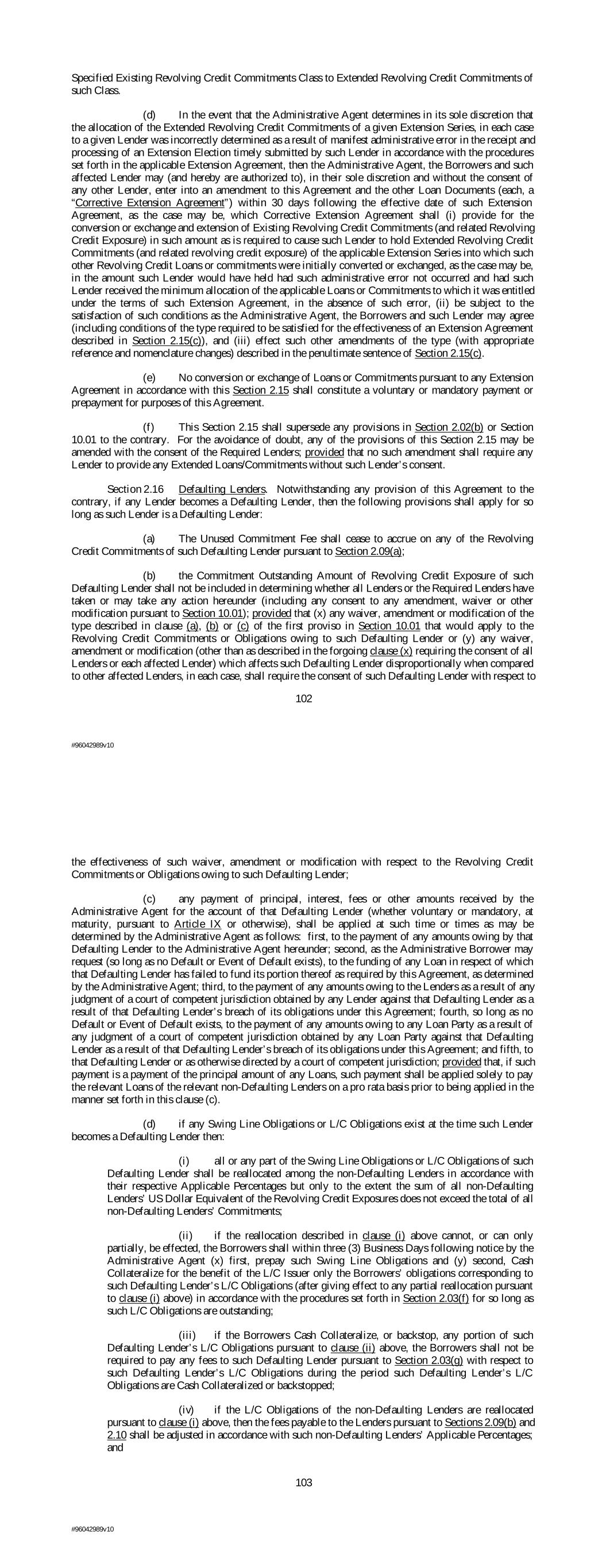 Specified Existing Revolving Credit Commitments Class to Extended Revolving Credit Commitments of such Class. (d) In the event that the Administrative Agent determines in its sole discretion that the allocation of the Extended Revolving Credit Commitments of a given Extension Series, in each case to a given Lender was incorrectly determined as a result of manifest administrative error in the receipt and processing of an Extension Election timely submitted by such Lender in accordance with the procedures set forth in the applicable Extension Agreement, then the Administrative Agent, the Borrowers and such affected Lender may (and hereby are authorized to), in their sole discretion and without the consent of any other Lender, enter into an amendment to this Agreement and the other Loan Documents (each, a “Corrective Extension Agreement”) within 30 days following the effective date of such Extension Agreement, as the case may be, which Corrective Extension Agreement shall (i) provide for the conversion or exchange and extension of Existing Revolving Credit Commitments (and related Revolving Credit Exposure) in such amount as is required to cause such Lender to hold Extended Revolving Credit Commitments (and related revolving credit exposure) of the applicable Extension Series into which such other Revolving Credit Loans or commitments were initially converted or exchanged, as the case may be, in the amount such Lender would have held had such administrative error not occurred and had such Lender received the minimum allocation of the applicable Loans or Commitments to which it was entitled under the terms of such Extension Agreement, in the absence of such error, (ii) be subject to the satisfaction of such conditions as the Administrative Agent, the Borrowers and such Lender may agree (including conditions of the type required to be satisfied for the effectiveness of an Extension Agreement described in Section 2.15(c)), and (iii) effect such other amendments of the type (with appropriate reference and nomenclature changes) described in the penultimate sentence of Section 2.15(c). (e) No conversion or exchange of Loans or Commitments pursuant to any Extension Agreement in accordance with this Section 2.15 shall constitute a voluntary or mandatory payment or prepayment for purposes of this Agreement. (f) This Section 2.15 shall supersede any provisions in Section 2.02(b) or Section 10.01 to the contrary. For the avoidance of doubt, any of the provisions of this Section 2.15 may be amended with the consent of the Required Lenders; provided that no such amendment shall require any Lender to provide any Extended Loans/Commitments without such Lender’s consent. Section 2.16 Defaulting Lenders. Notwithstanding any provision of this Agreement to the contrary, if any Lender becomes a Defaulting Lender, then the following provisions shall apply for so long as such Lender is a Defaulting Lender: (a) The Unused Commitment Fee shall cease to accrue on any of the Revolving Credit Commitments of such Defaulting Lender pursuant to Section 2.09(a); (b) the Commitment Outstanding Amount of Revolving Credit Exposure of such Defaulting Lender shall not be included in determining whether all Lenders or the Required Lenders have taken or may take any action hereunder (including any consent to any amendment, waiver or other modification pursuant to Section 10.01); provided that (x) any waiver, amendment or modification of the type described in clause (a), (b) or (c) of the first proviso in Section 10.01 that would apply to the Revolving Credit Commitments or Obligations owing to such Defaulting Lender or (y) any waiver, amendment or modification (other than as described in the forgoing clause (x) requiring the consent of all Lenders or each affected Lender) which affects such Defaulting Lender disproportionally when compared to other affected Lenders, in each case, shall require the consent of such Defaulting Lender with respect to 102 #96042989v10 the effectiveness of such waiver, amendment or modification with respect to the Revolving Credit Commitments or Obligations owing to such Defaulting Lender; (c) any payment of principal, interest, fees or other amounts received by the Administrative Agent for the account of that Defaulting Lender (whether voluntary or mandatory, at maturity, pursuant to Article IX or otherwise), shall be applied at such time or times as may be determined by the Administrative Agent as follows: first, to the payment of any amounts owing by that Defaulting Lender to the Administrative Agent hereunder; second, as the Administrative Borrower may request (so long as no Default or Event of Default exists), to the funding of any Loan in respect of which that Defaulting Lender has failed to fund its portion thereof as required by this Agreement, as determined by the Administrative Agent; third, to the payment of any amounts owing to the Lenders as a result of any judgment of a court of competent jurisdiction obtained by any Lender against that Defaulting Lender as a result of that Defaulting Lender’s breach of its obligations under this Agreement; fourth, so long as no Default or Event of Default exists, to the payment of any amounts owing to any Loan Party as a result of any judgment of a court of competent jurisdiction obtained by any Loan Party against that Defaulting Lender as a result of that Defaulting Lender’s breach of its obligations under this Agreement; and fifth, to that Defaulting Lender or as otherwise directed by a court of competent jurisdiction; provided that, if such payment is a payment of the principal amount of any Loans, such payment shall be applied solely to pay the relevant Loans of the relevant non-Defaulting Lenders on a pro rata basis prior to being applied in the manner set forth in this clause (c). (d) if any Swing Line Obligations or L/C Obligations exist at the time such Lender becomes a Defaulting Lender then: (i) all or any part of the Swing Line Obl
