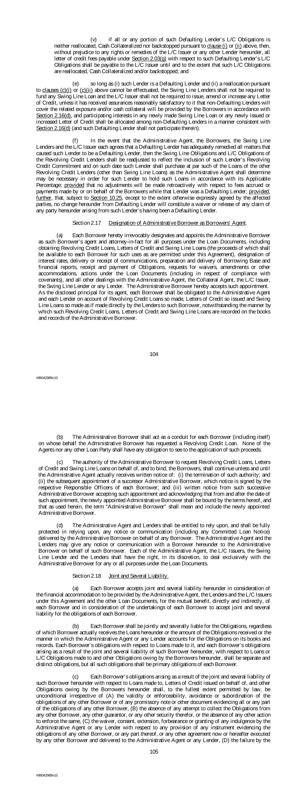 (v) if all or any portion of such Defaulting Lender’s L/C Obligations is neither reallocated, Cash Collateralized nor backstopped pursuant to clause (i) or (ii) above, then, without prejudice to any rights or remedies of the L/C Issuer or any other Lender hereunder, all letter of credit fees payable under Section 2.03(g) with respect to such Defaulting Lender’s L/C Obligations shall be payable to the L/C Issuer until and to the extent that such L/C Obligations are reallocated, Cash Collateralized and/or backstopped; and (e) so long as (i) such Lender is a Defaulting Lender and (ii) a reallocation pursuant to clauses (c)(i) or (c)(ii) above cannot be effectuated, the Swing Line Lenders shall not be required to fund any Swing Line Loan and the L/C Issuer shall not be required to issue, amend or increase any Letter of Credit, unless it has received assurances reasonably satisfactory to it that non-Defaulting Lenders will cover the related exposure and/or cash collateral will be provided by the Borrowers in accordance with Section 2.16(d), and participating interests in any newly made Swing Line Loan or any newly issued or increased Letter of Credit shall be allocated among non-Defaulting Lenders in a manner consistent with Section 2.16(d) (and such Defaulting Lender shall not participate therein). (f) In the event that the Administrative Agent, the Borrowers, the Swing Line Lenders and the L/C Issuer each agrees that a Defaulting Lender has adequately remedied all matters that caused such Lender to be a Defaulting Lender, then the Swing Line Obligations and L/C Obligations of the Revolving Credit Lenders shall be readjusted to reflect the inclusion of such Lender’s Revolving Credit Commitment and on such date such Lender shall purchase at par such of the Loans of the other Revolving Credit Lenders (other than Swing Line Loans) as the Administrative Agent shall determine may be necessary in order for such Lender to hold such Loans in accordance with its Applicable Percentage; provided that no adjustments will be made retroactively with respect to fees accrued or payments made by or on behalf of the Borrowers while that Lender was a Defaulting Lender; provided, further, that, subject to Section 10.25, except to the extent otherwise expressly agreed by the affected parties, no change hereunder from Defaulting Lender will constitute a waiver or release of any claim of any party hereunder arising from such Lender’s having been a Defaulting Lender. Section 2.17 Designation of Administrative Borrower as Borrowers’ Agent. (a) Each Borrower hereby irrevocably designates and appoints the Administrative Borrower as such Borrower’s agent and attorney-in-fact for all purposes under the Loan Documents, including obtaining Revolving Credit Loans, Letters of Credit and Swing Line Loans (the proceeds of which shall be available to each Borrower for such uses as are permitted under this Agreement), designation of interest rates, delivery or receipt of communications, preparation and delivery of Borrowing Base and financial reports, receipt and payment of Obligations, requests for waivers, amendments or other accommodations, actions under the Loan Documents (including in respect of compliance with covenants), and all other dealings with the Administrative Agent, the Collateral Agent, the L/C Issuer, the Swing Line Lender or any Lender. The Administrative Borrower hereby accepts such appointment. As the disclosed principal for its agent, each Borrower shall be obligated to the Administrative Agent and each Lender on account of Revolving Credit Loans so made, Letters of Credit so issued and Swing Line Loans so made as if made directly by the Lenders to such Borrower, notwithstanding the manner by which such Revolving Credit Loans, Letters of Credit and Swing Line Loans are recorded on the books and records of the Administrative Borrower. 104 #96042989v10 (b) The Administrative Borrower shall act as a conduit for each Borrower (including itself) on whose behalf the Administrative Borrower has requested a Revolving Credit Loan. None of the Agents nor any other Loan Party shall have any obligation to see to the application of such proceeds. (c) The authority of the Administrative Borrower to request Revolving Credit Loans, Letters of Credit and Swing Line Loans on behalf of, and to bind, the Borrowers, shall continue unless and until the Administrative Agent actually receives written notice of: (i) the termination of such authority; and (ii) the subsequent appointment of a successor Administrative Borrower, which notice is signed by the respective Responsible Officers of each Borrower; and (iii) written notice from such successive Administrative Borrower accepting such appointment and acknowledging that from and after the date of such appointment, the newly appointed Administrative Borrower shall be bound by the terms hereof, and that as used herein, the term “Administrative Borrower” shall mean and include the newly appointed Administrative Borrower. (d) The Administrative Agent and Lenders shall be entitled to rely upon, and shall be fully protected in relying upon, any notice or communication (including any Committed Loan Notice) delivered by the Administrative Borrower on behalf of any Borrower. The Administrative Agent and the Lenders may give any notice or communication with a Borrower hereunder to the Administrative Borrower on behalf of such Borrower. Each of the Administrative Agent, the L/C Issuers, the Swing Line Lender and the Lenders shall have the right, in its discretion, to deal exclusively with the Administrative Borrower for any or all purposes under the Loan Documents. Section 2.18 Joint and Several Liability. (a) Each Borrower accepts joint and several liability hereunder in consideration of the financial accommodation to be provided by the Administrative Agent, the Lenders and the L/C Issuers under this Agreement and the other Loan Documents, for the mutual benefit, directly an