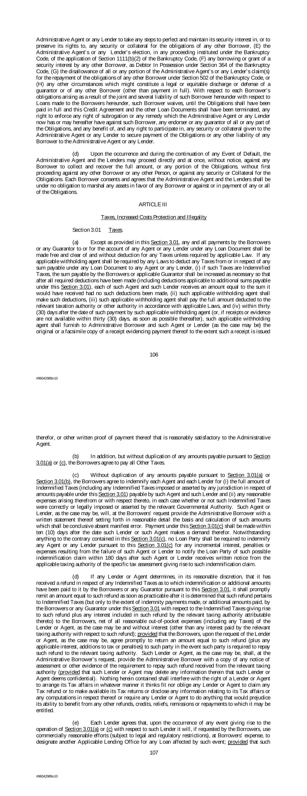 Administrative Agent or any Lender to take any steps to perfect and maintain its security interest in, or to preserve its rights to, any security or collateral for the obligations of any other Borrower, (E) the Administrative Agent’s or any Lender’s election, in any proceeding instituted under the Bankruptcy Code, of the application of Section 1111(b)(2) of the Bankruptcy Code, (F) any borrowing or grant of a security interest by any other Borrower, as Debtor In Possession under Section 364 of the Bankruptcy Code, (G) the disallowance of all or any portion of the Administrative Agent’s or any Lender’s claim(s) for the repayment of the obligations of any other Borrower under Section 502 of the Bankruptcy Code, or (H) any other circumstances which might constitute a legal or equitable discharge or defense of a guarantor or of any other Borrower (other than payment in full). With respect to each Borrower’s obligations arising as a result of the joint and several liability of such Borrower hereunder with respect to Loans made to the Borrowers hereunder, such Borrower waives, until the Obligations shall have been paid in full and this Credit Agreement and the other Loan Documents shall have been terminated, any right to enforce any right of subrogation or any remedy which the Administrative Agent or any Lender now has or may hereafter have against such Borrower, any endorser or any guarantor of all or any part of the Obligations, and any benefit of, and any right to participate in, any security or collateral given to the Administrative Agent or any Lender to secure payment of the Obligations or any other liability of any Borrower to the Administrative Agent or any Lender. (d) Upon the occurrence and during the continuation of any Event of Default, the Administrative Agent and the Lenders may proceed directly and at once, without notice, against any Borrower to collect and recover the full amount, or any portion of the Obligations, without first proceeding against any other Borrower or any other Person, or against any security or Collateral for the Obligations. Each Borrower consents and agrees that the Administrative Agent and the Lenders shall be under no obligation to marshal any assets in favor of any Borrower or against or in payment of any or all of the Obligations. ARTICLE III Taxes, Increased Costs Protection and Illegality Section 3.01 Taxes. (a) Except as provided in this Section 3.01, any and all payments by the Borrowers or any Guarantor to or for the account of any Agent or any Lender under any Loan Document shall be made free and clear of and without deduction for any Taxes unless required by applicable Law. If any applicable withholding agent shall be required by any Laws to deduct any Taxes from or in respect of any sum payable under any Loan Document to any Agent or any Lender, (i) if such Taxes are Indemnified Taxes, the sum payable by the Borrowers or applicable Guarantor shall be increased as necessary so that after all required deductions have been made (including deductions applicable to additional sums payable under this Section 3.01), each of such Agent and such Lender receives an amount equal to the sum it would have received had no such deductions been made, (ii) such applicable withholding agent shall make such deductions, (iii) such applicable withholding agent shall pay the full amount deducted to the relevant taxation authority or other authority in accordance with applicable Laws, and (iv) within thirty (30) days after the date of such payment by such applicable withholding agent (or, if receipts or evidence are not available within thirty (30) days, as soon as possible thereafter), such applicable withholding agent shall furnish to Administrative Borrower and such Agent or Lender (as the case may be) the original or a facsimile copy of a receipt evidencing payment thereof to the extent such a receipt is issued 106 #96042989v10 therefor, or other written proof of payment thereof that is reasonably satisfactory to the Administrative Agent. (b) In addition, but without duplication of any amounts payable pursuant to Section 3.01(a) or (c), the Borrowers agree to pay all Other Taxes. (c) Without duplication of any amounts payable pursuant to Section 3.01(a) or Section 3.01(b), the Borrowers agree to indemnify each Agent and each Lender for (i) the full amount of Indemnified Taxes (including any Indemnified Taxes imposed or asserted by any jurisdiction in respect of amounts payable under this Section 3.01) payable by such Agent and such Lender and (ii) any reasonable expenses arising therefrom or with respect thereto, in each case whether or not such Indemnified Taxes were correctly or legally imposed or asserted by the relevant Governmental Authority. Such Agent or Lender, as the case may be, will, at the Borrowers’ request provide the Administrative Borrower with a written statement thereof setting forth in reasonable detail the basis and calculation of such amounts which shall be conclusive absent manifest error. Payment under this Section 3.01(c) shall be made within ten (10) days after the date such Lender or such Agent makes a demand therefor. Notwithstanding anything to the contrary contained in this Section 3.01(c), no Loan Party shall be required to indemnify any Agent or any Lender pursuant to this Section 3.01(c) for any incremental interest, penalties or expenses resulting from the failure of such Agent or Lender to notify the Loan Party of such possible indemnification claim within 180 days after such Agent or Lender receives written notice from the applicable taxing authority of the specific tax assessment giving rise to such indemnification claim. (d) If any Lender or Agent determines, in its reasonable discretion, that it has received a refund in respect of any Indemnified Taxes as to which indemnification or additional amounts have been paid to it by the Borrowers or any Guarantor pursuant to this Section 3.01, it shall promptly remit an a